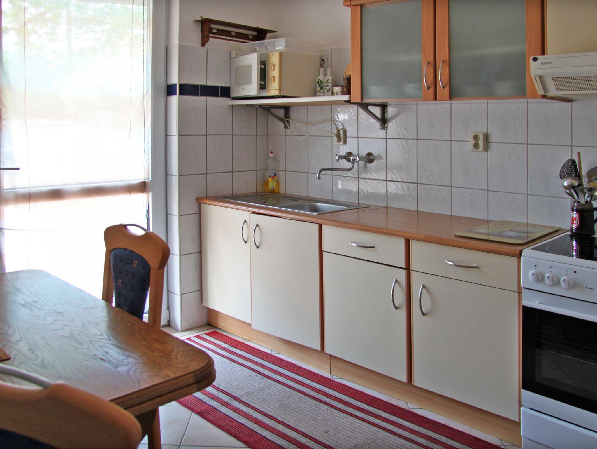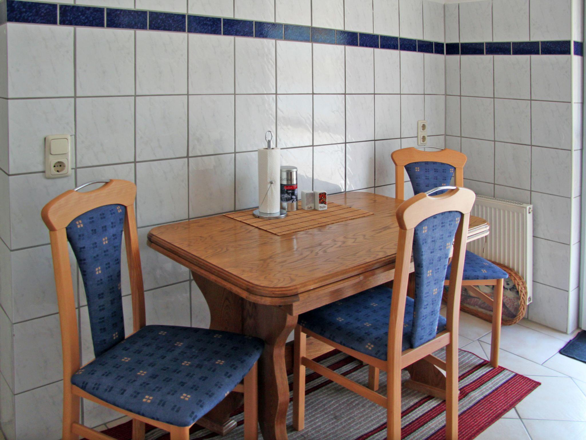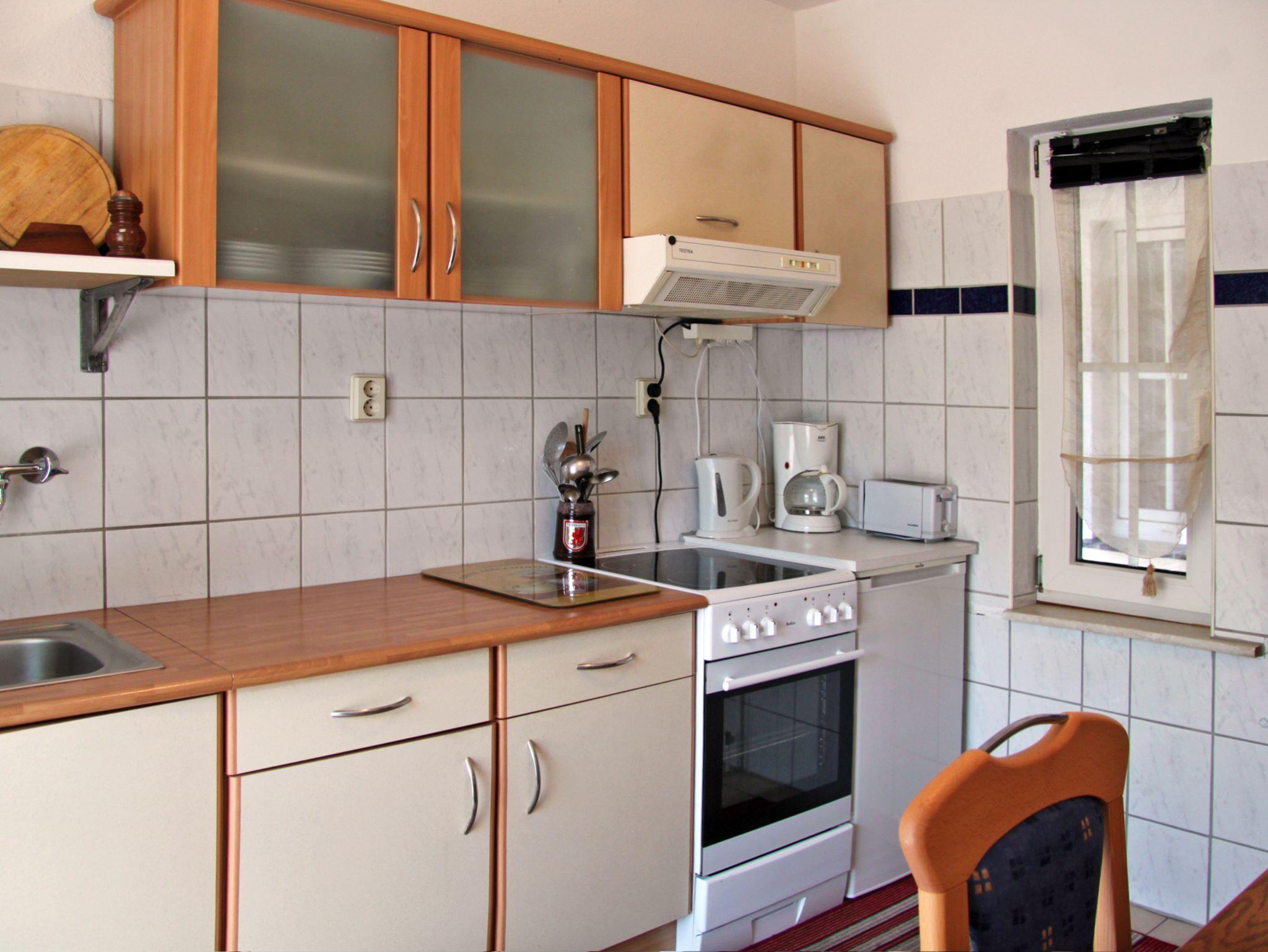In der separaten Küche gibt es mit einer Essecke, Ceranherd mit Backofen, Radio, Mikrowelle, Toaster, Kaffeeautomat, Wasserkocher und Kühlschrank alles was das Herz begehrt. Von der Küche aus kommt der Gast sofort auf den Hof.