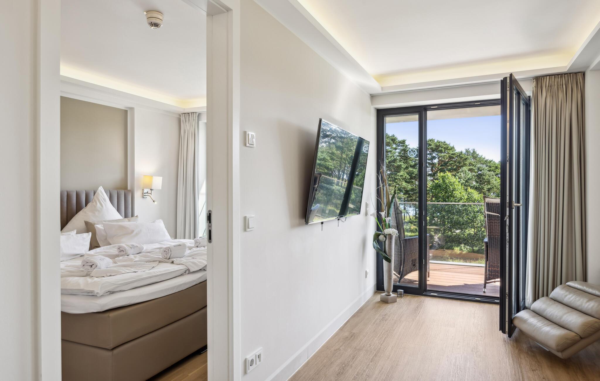 Fra den åbne stue, der er gennemstrømmet af lys, kan I træde ud på jeres private, ca. 10 m² store altan med udsigt helt til Østersøen. I kan folde sofaen ud til to komfortable sovepladser (1,40 x 2,00 m). Både i stuen og i soveværelset er der tv.