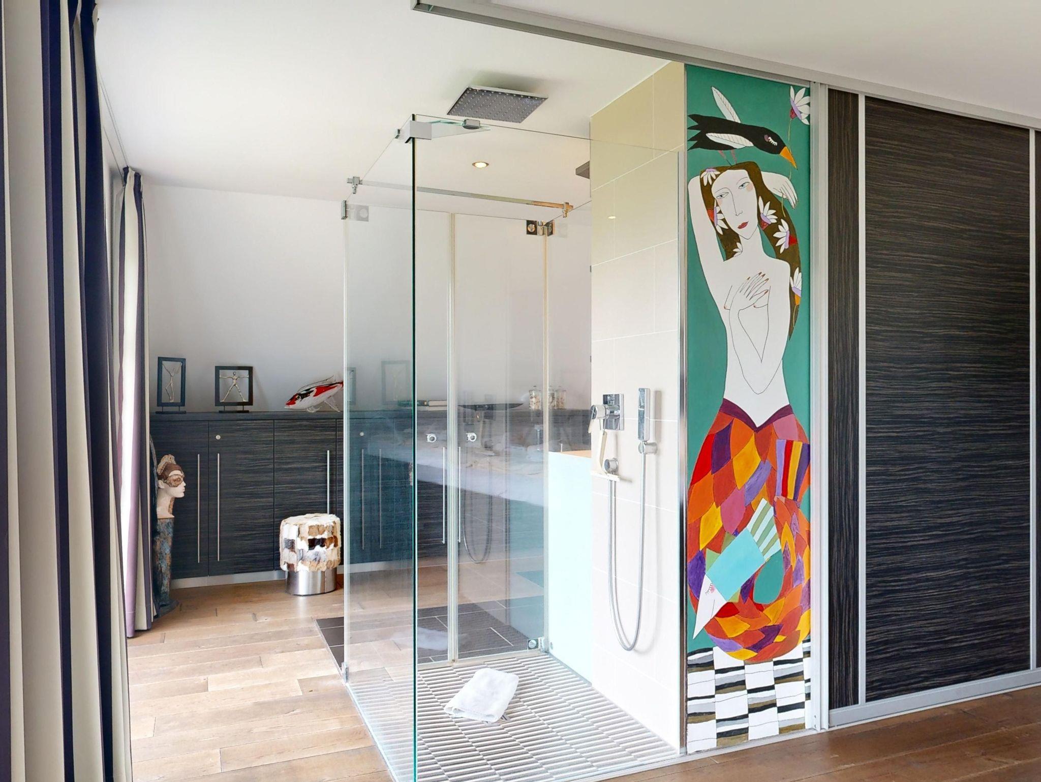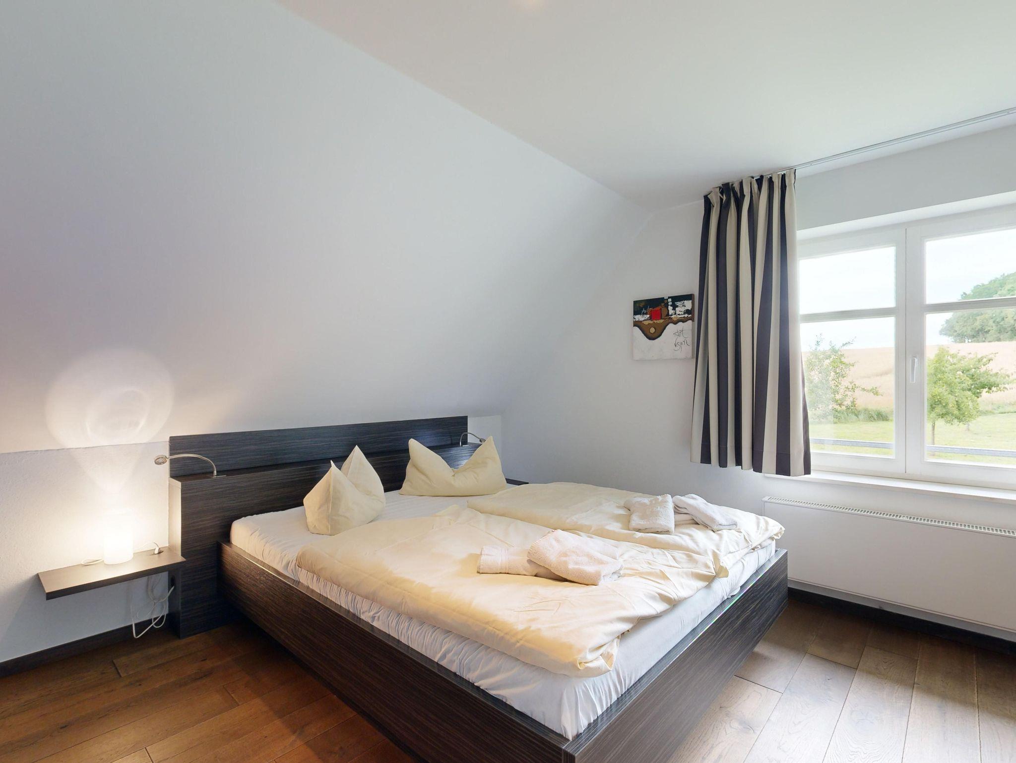 1 großes Schlafzimmer (32 m²) mit einem Doppelbett und Meerblick, Sat-TV, integrierte Badewanne, Dusche