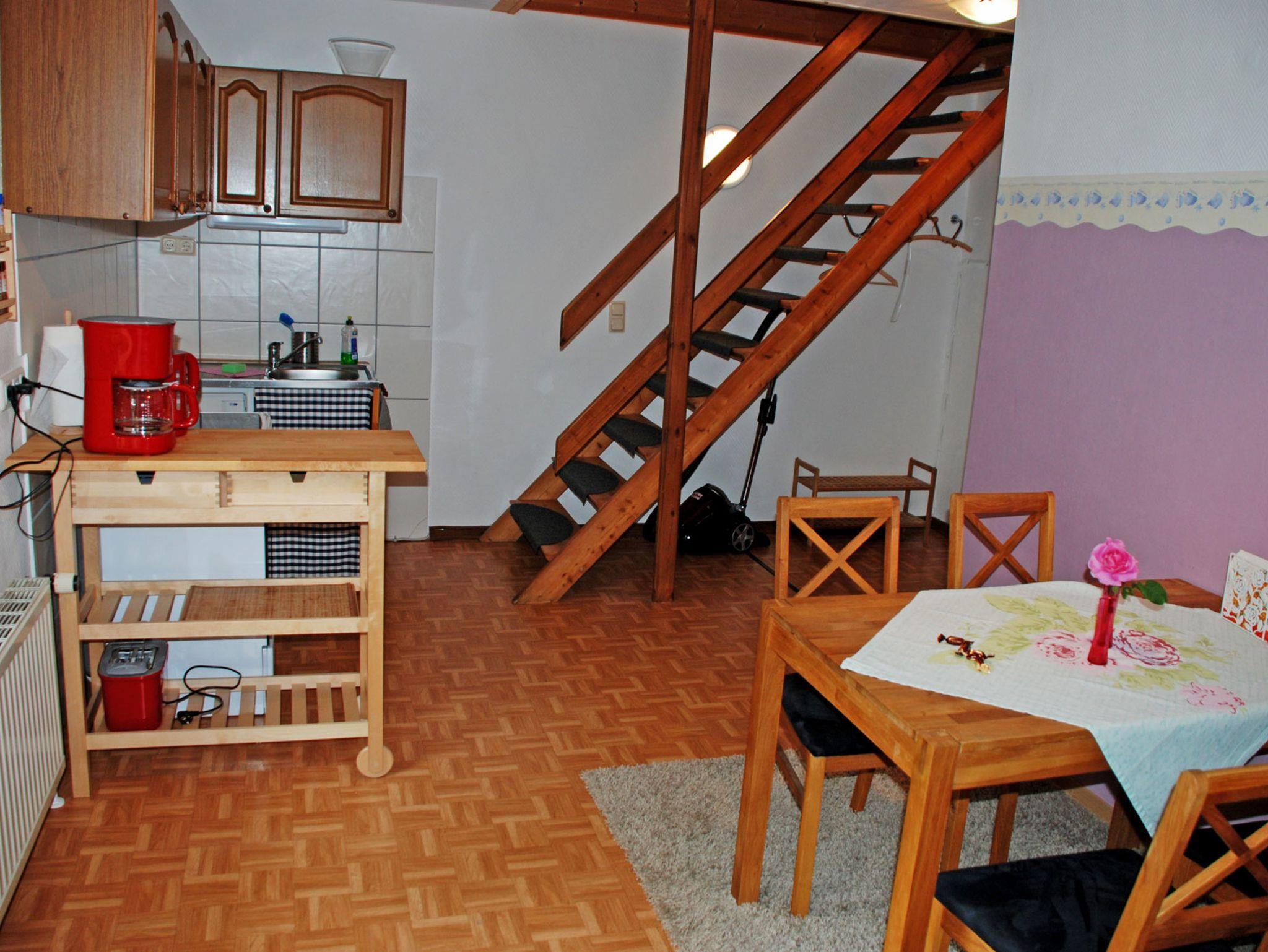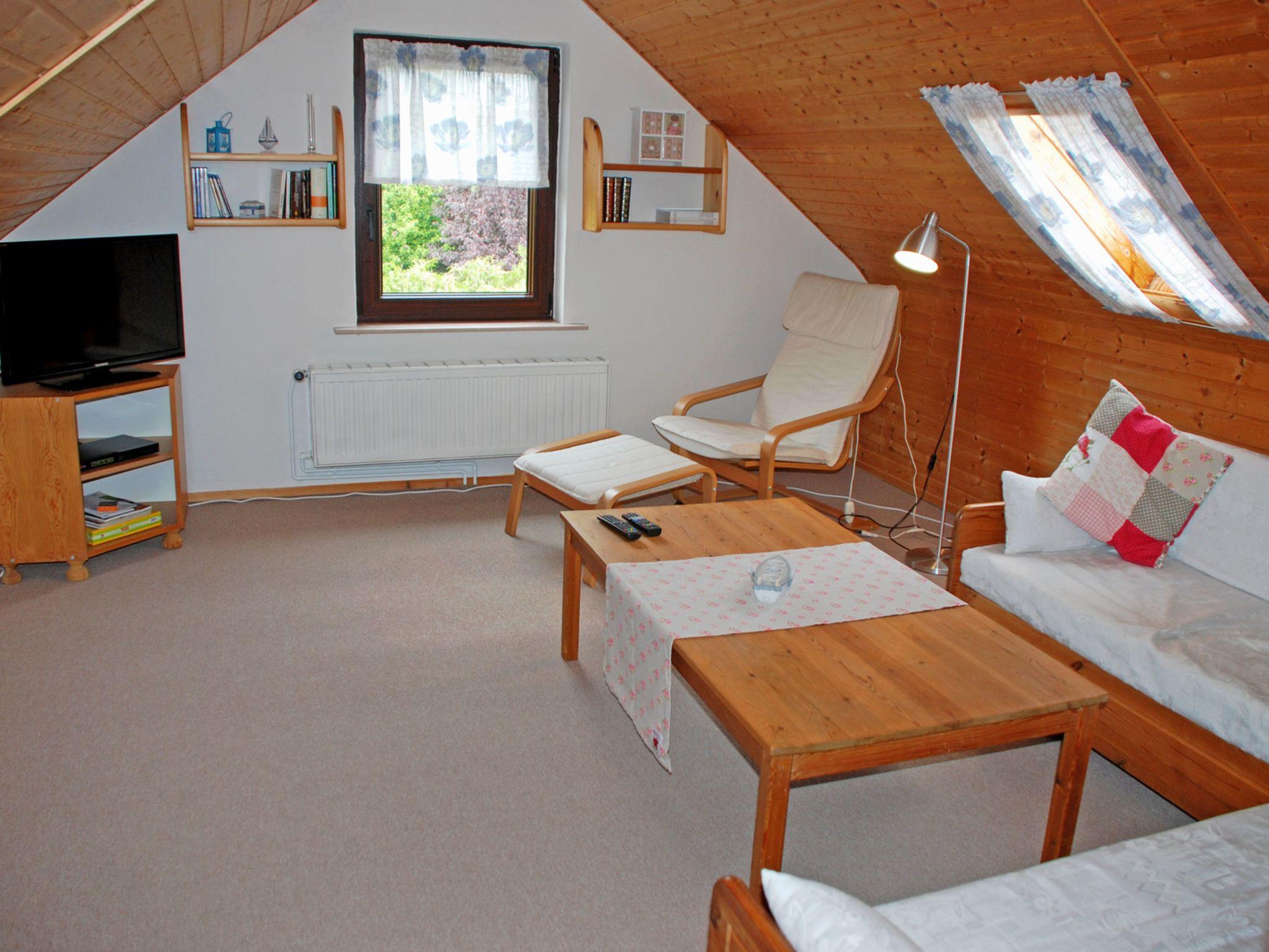 Zum Appartement Rosenduft gehören eine Terrasse mit Sitzmöbeln, Grill und ein PKW-Stellplatz. Im gemütlichen Wohnzimmer auf der oberen Ebene / im Dachgeschoss befinden sich eine bequeme Sitzgruppe mit Tisch, eine Stereo-Anlage, Blu-Ray-DVD-Kombination bzw. Buch- und Leseecke und ein modernes Flachbild-TV-Gerät.