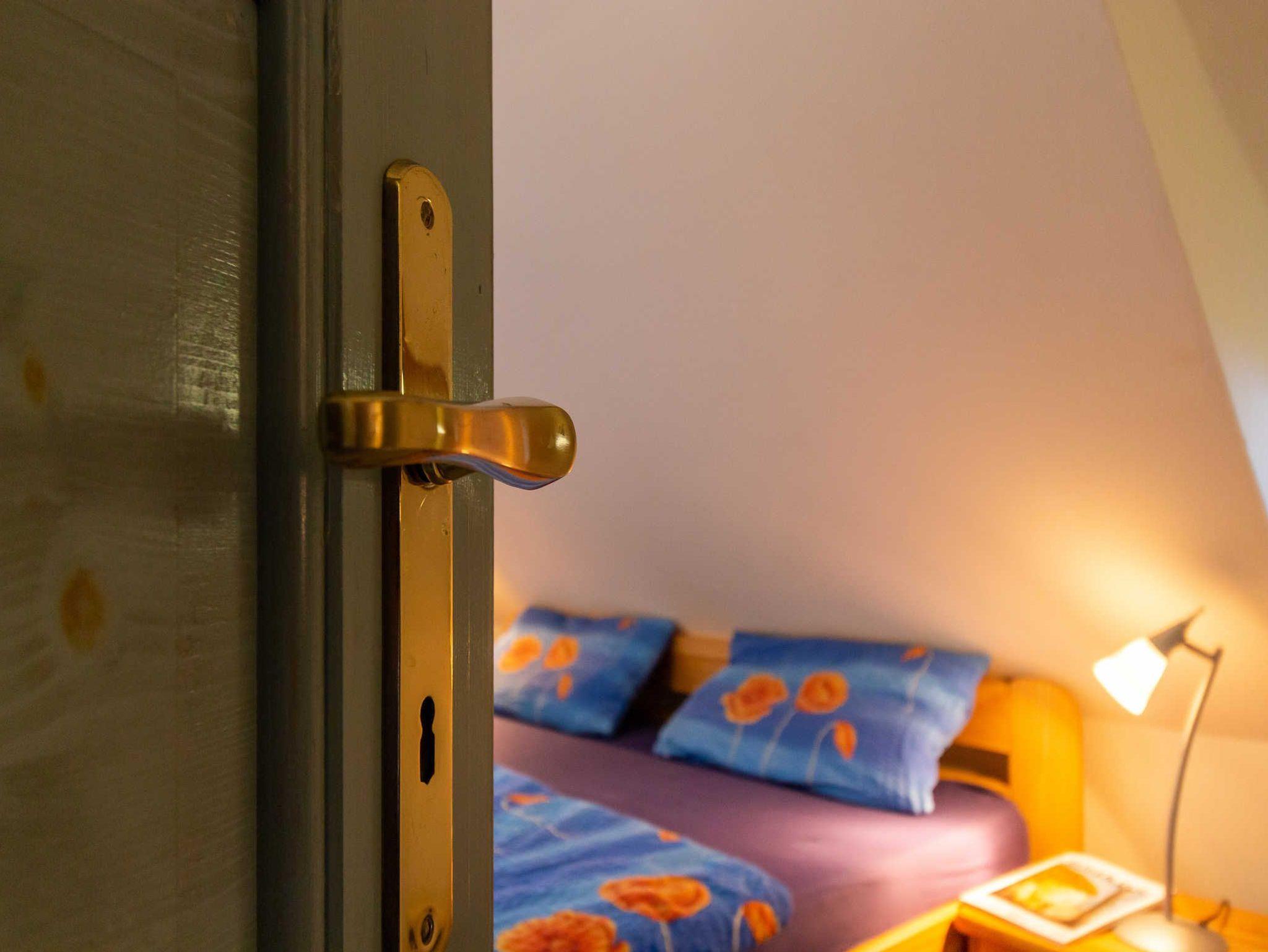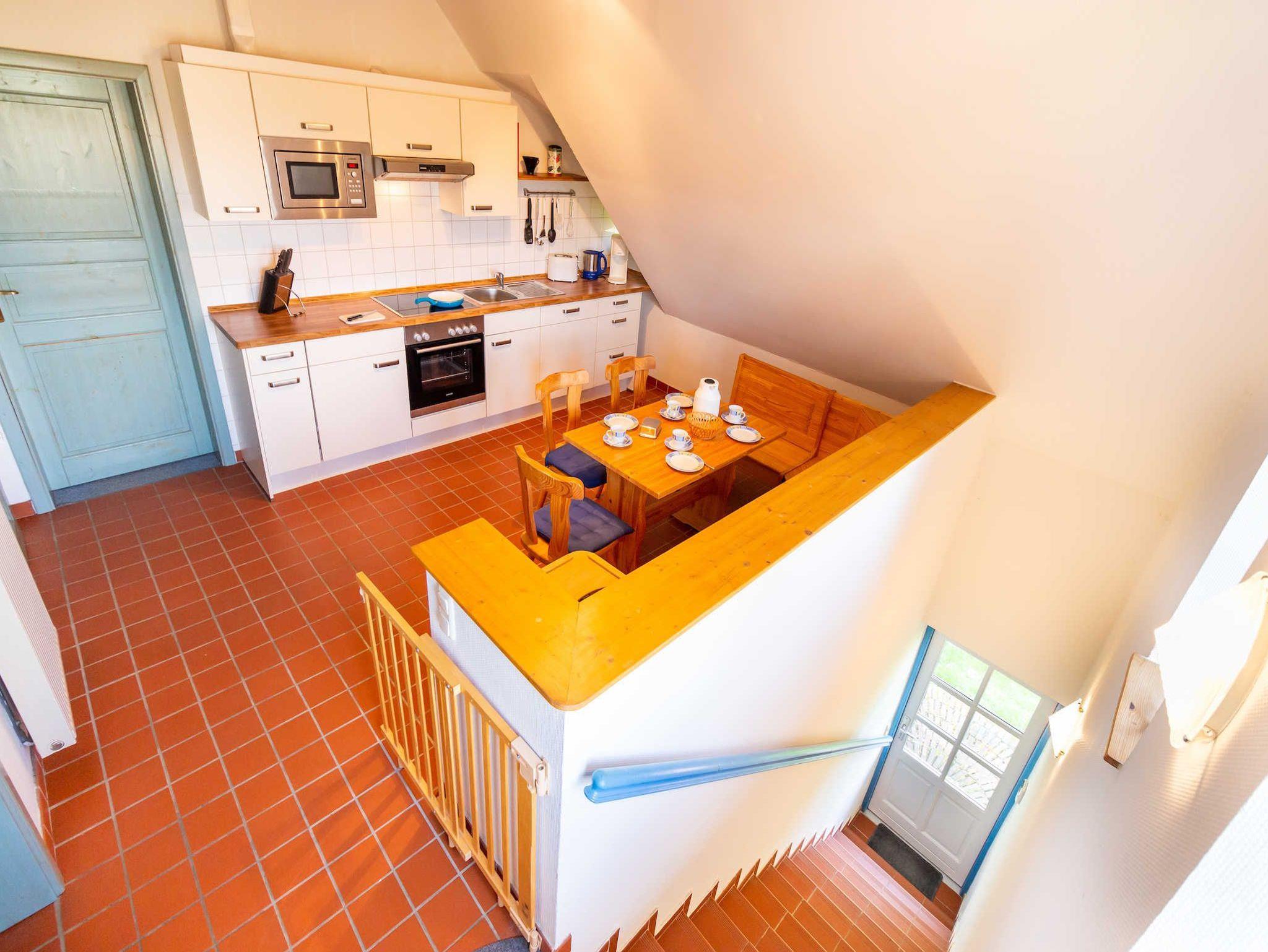 Die ca. 70 m² große Ferienwohnung liegt im Obergeschoss des reetgedeckten Hauses und verfügt über einen separaten Zugang von außen.