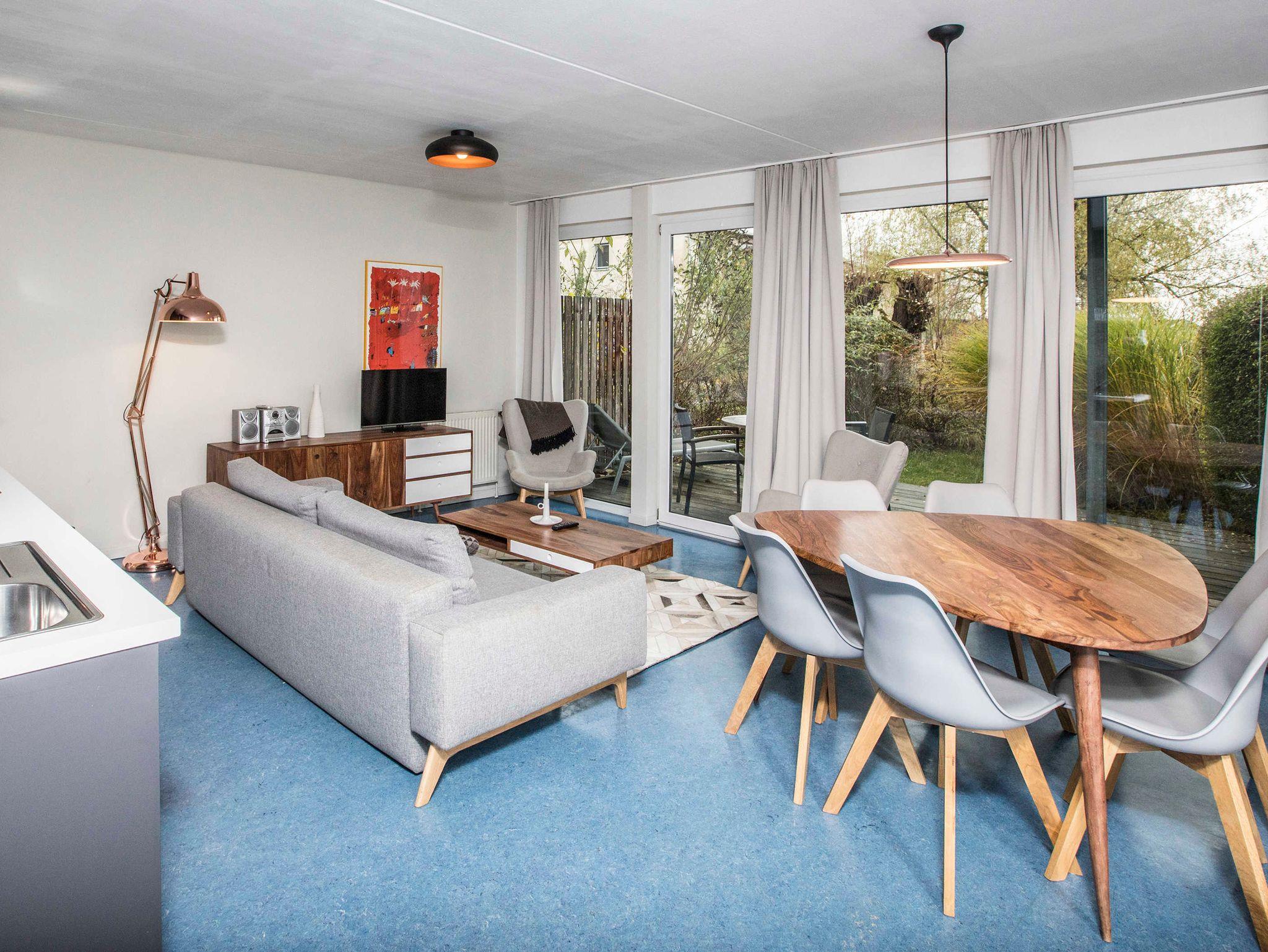 Ein Schlafraum mit Doppelbett, ein Kinderzimmer mit Etagenbett und ein Wohnraum mit Aufbettung für zwei Personen (Schlafcouch), SAT-TV, Musikanlage, Küchenzeile, Bad mit Dusche und WC, Terrasse oder Balkon.