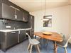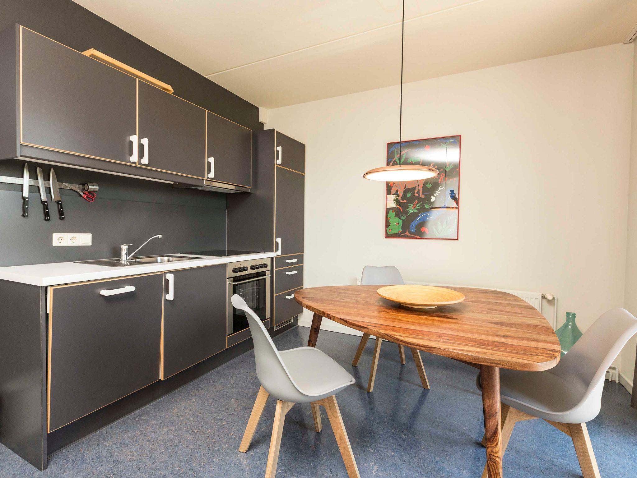 Ausstattung der Küche: 4-Zonen-Kochfeld, Backofen, Geschirrspüler, Filterkaffeemaschine, Wasserkocher, Toaster, Geschirr, Besteck, Pfannen und Töpfe.