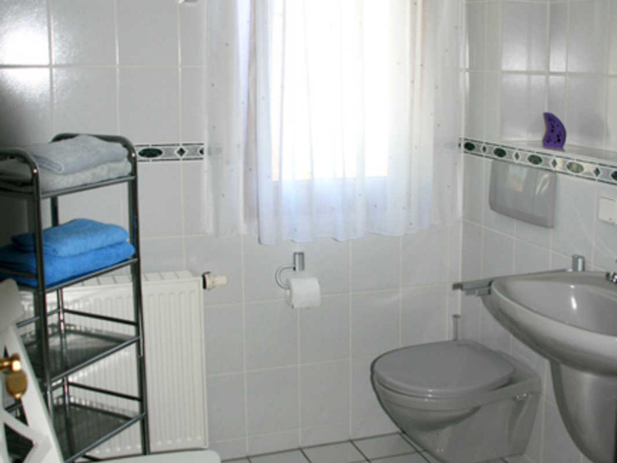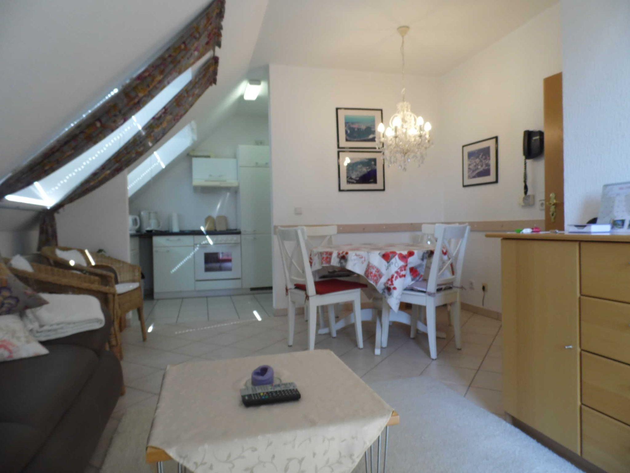 Direkt neben der zum Wohnraum offenen Küche, die mit Backofen, Mikrowelle usw.umfassend ausgestattet ist, befindet sich ein großer Abstellraum. Außerdem gibt es ein Bad mit Dusche/WC und Tageslichtfentenster. Bei Bedarf kann ein kleines Kinderreisebett und ein Hochstuhl für ein Kind bis 3 J. kostenlos bereitgestellt werden. Auf dem zur Ferienwohnung gehörenden, ca. 20 qm großen Balkon (Südostseite) stehen Sitzmöbel, ein Sonnenschirm und ein Grill zur Verfügung. Vom Balkon aus können Sie einen schönen Blick in die ruhige Umgebung genießen.