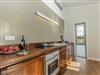Ausstattung der Küche: 4-Zonen-Kochfeld, Backofen, Geschirrspüler, Filterkaffeemaschine, Wasserkocher, Toaster, Geschirr, Besteck, Pfannen und Töpfe.