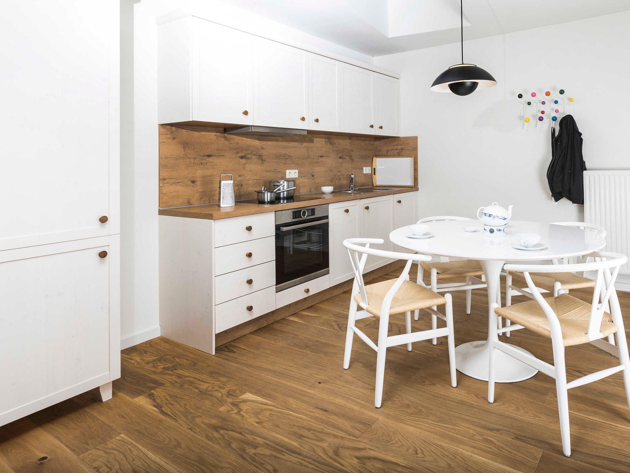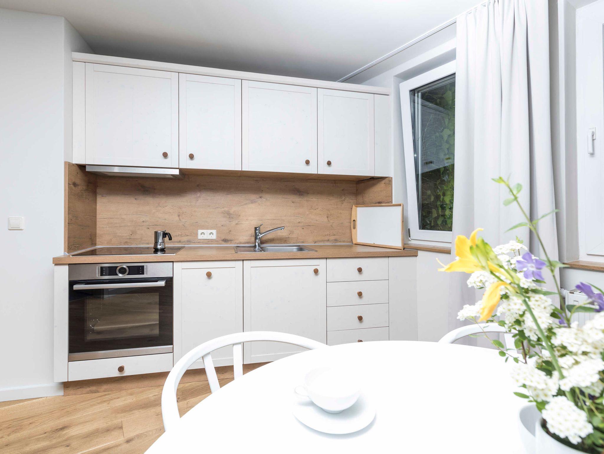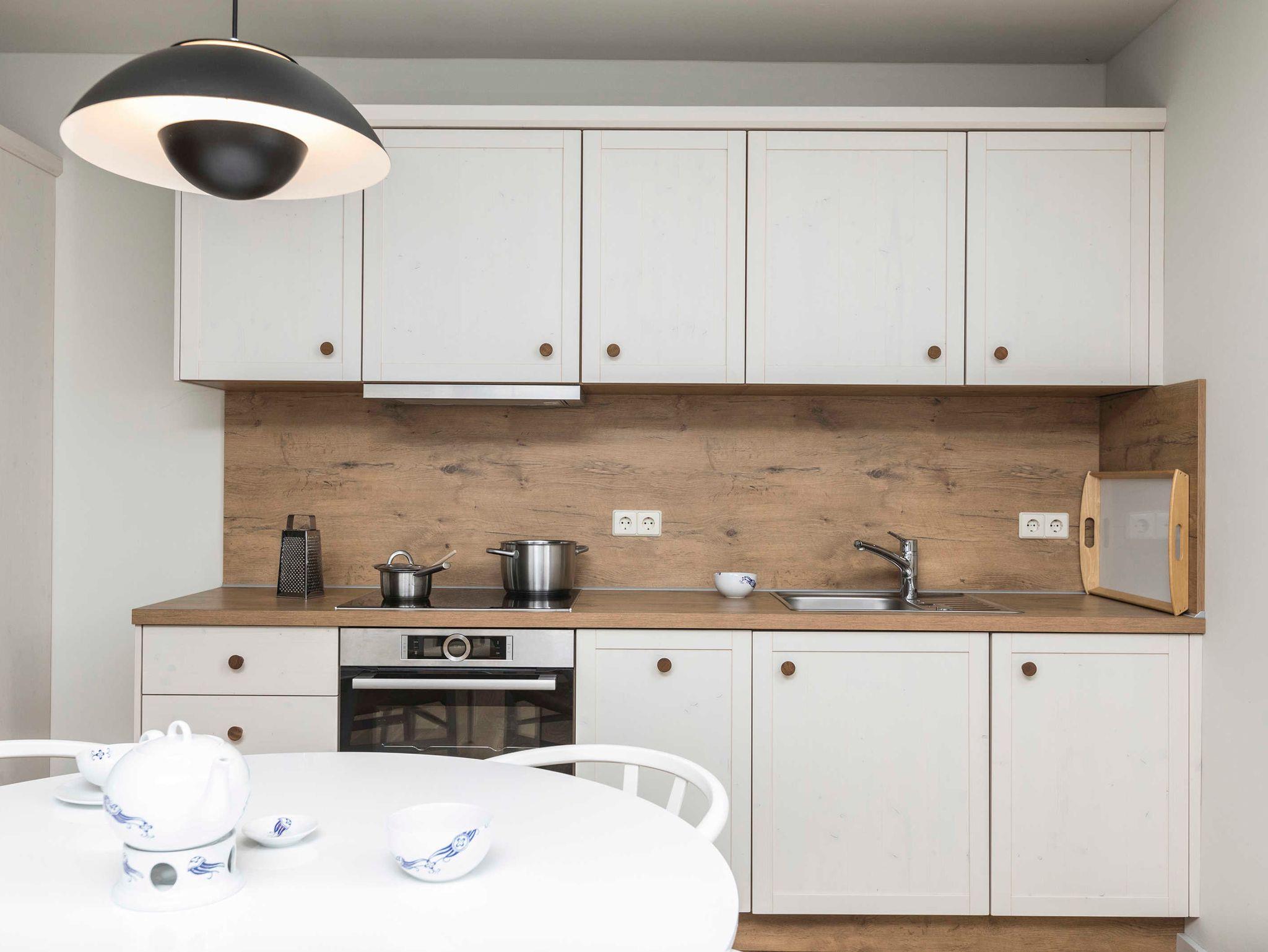 Ausstattung der Küche: 4-Zonen-Kochfeld, Backofen, Geschirrspüler, Filterkaffeemaschine, Wasserkocher, Toaster, Geschirr, Besteck, Pfannen und Töpfe.