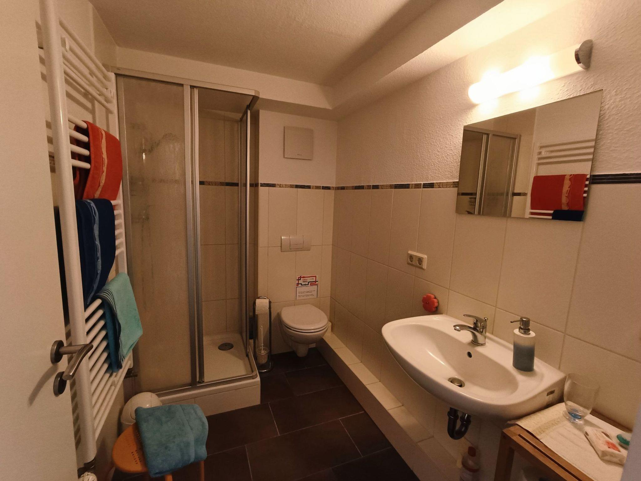neu errichtetes Badezimmer mit WC und Dusche, Fön, Kosmetikspiegel, Handtuchtrockner