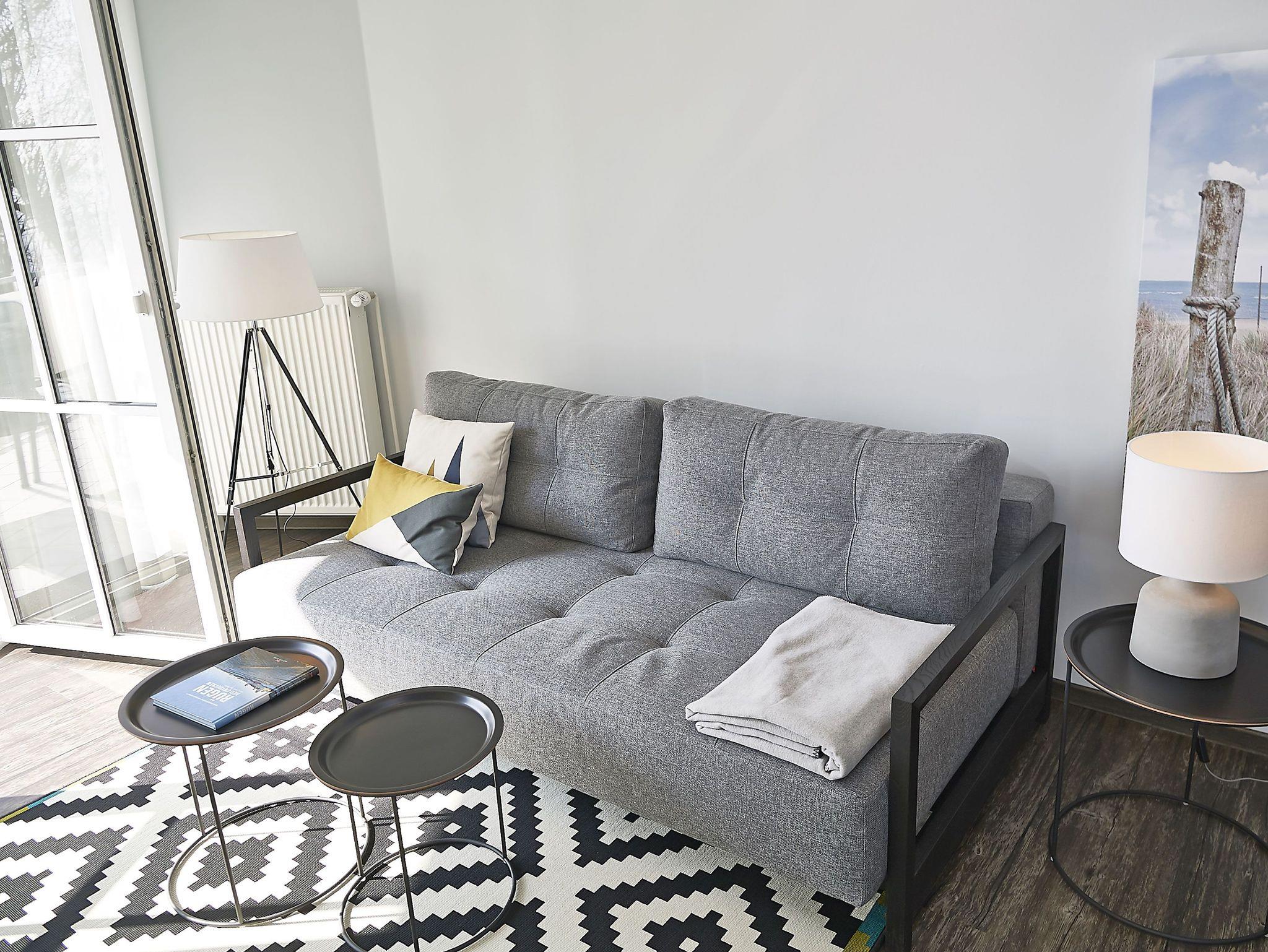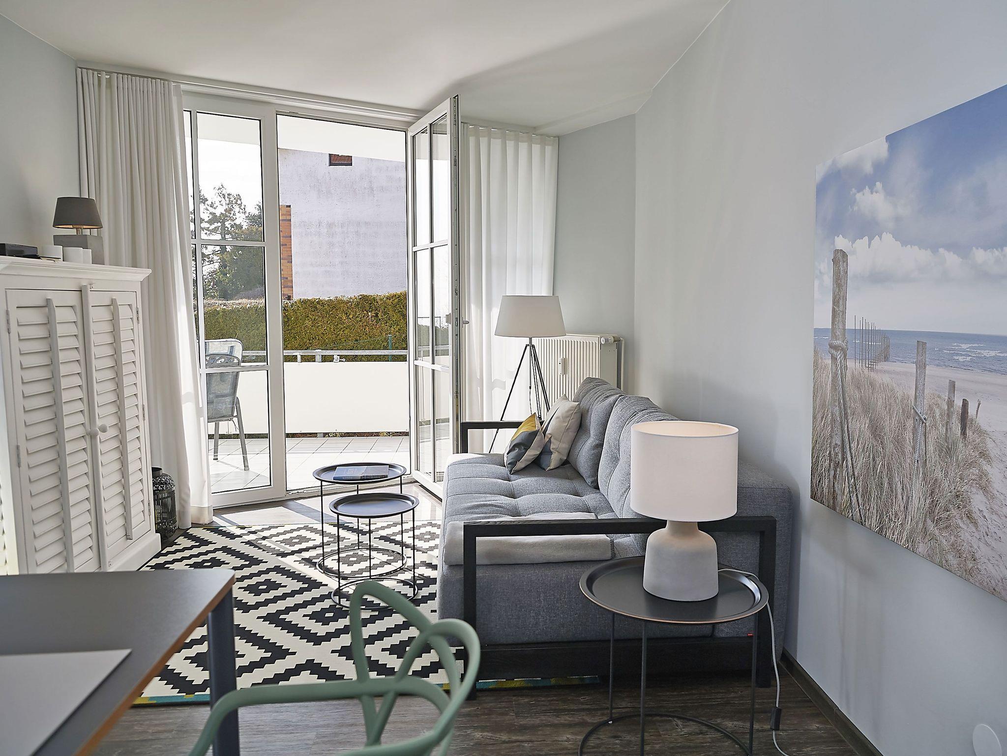 Die gut 30 m² große Hochterrasse ist zur Abendsonne ausgerichtet und von beiden Zimmern aus zugänglich. Von hier aus genießen Sie einen wunderbaren Blick über den Rügischen Bodden auf die Insel Vilm. In der Wohnung selbst stehen Ihnen ein Wohn- und ein Schlafzimmer mit jeweils seitlichem Wasserblick zur Verfügung.