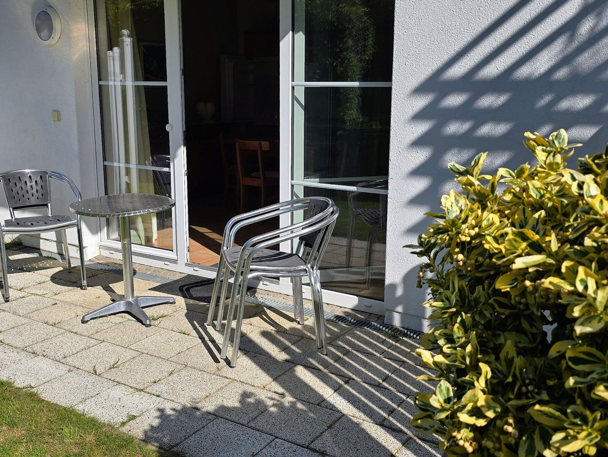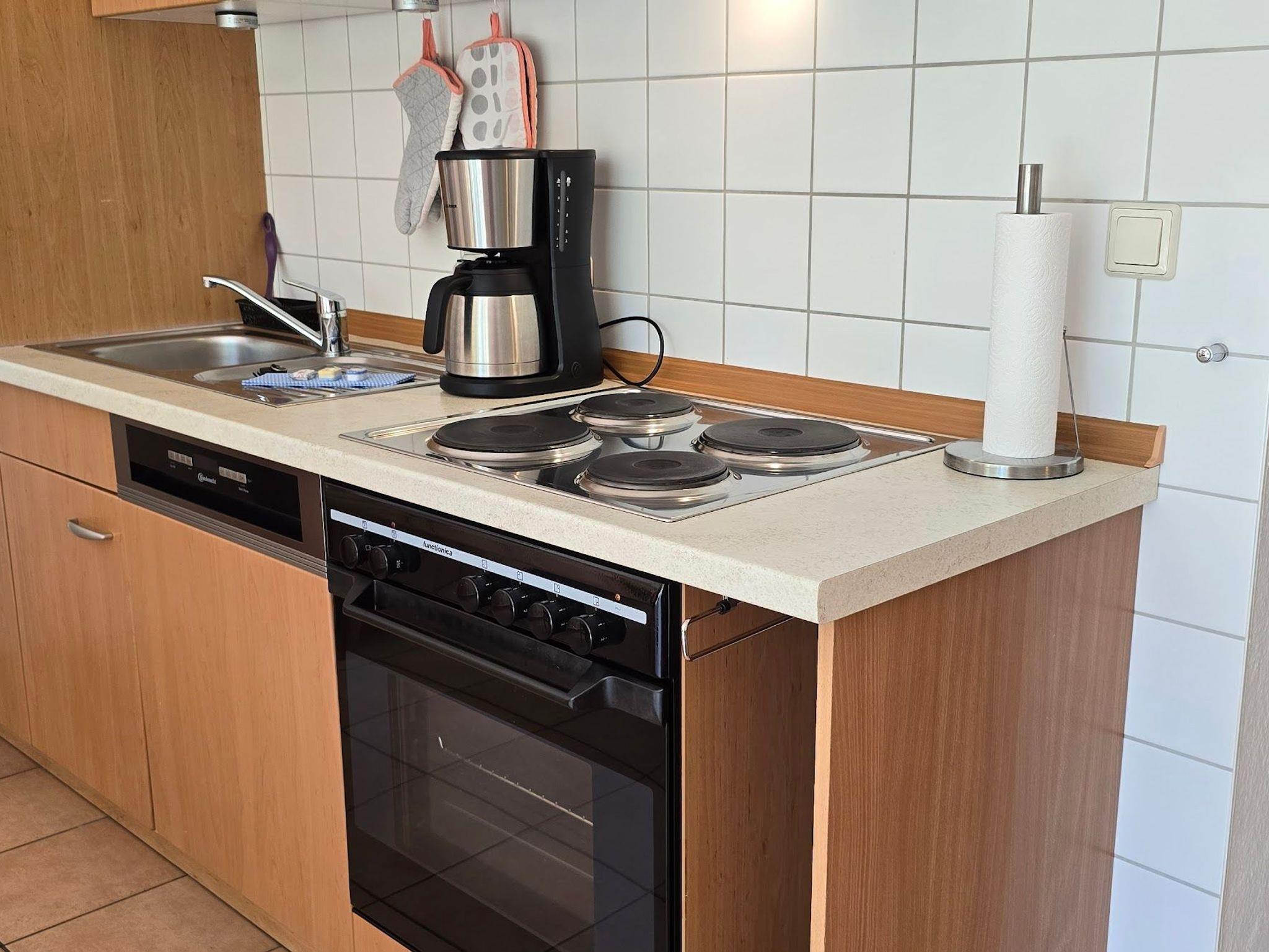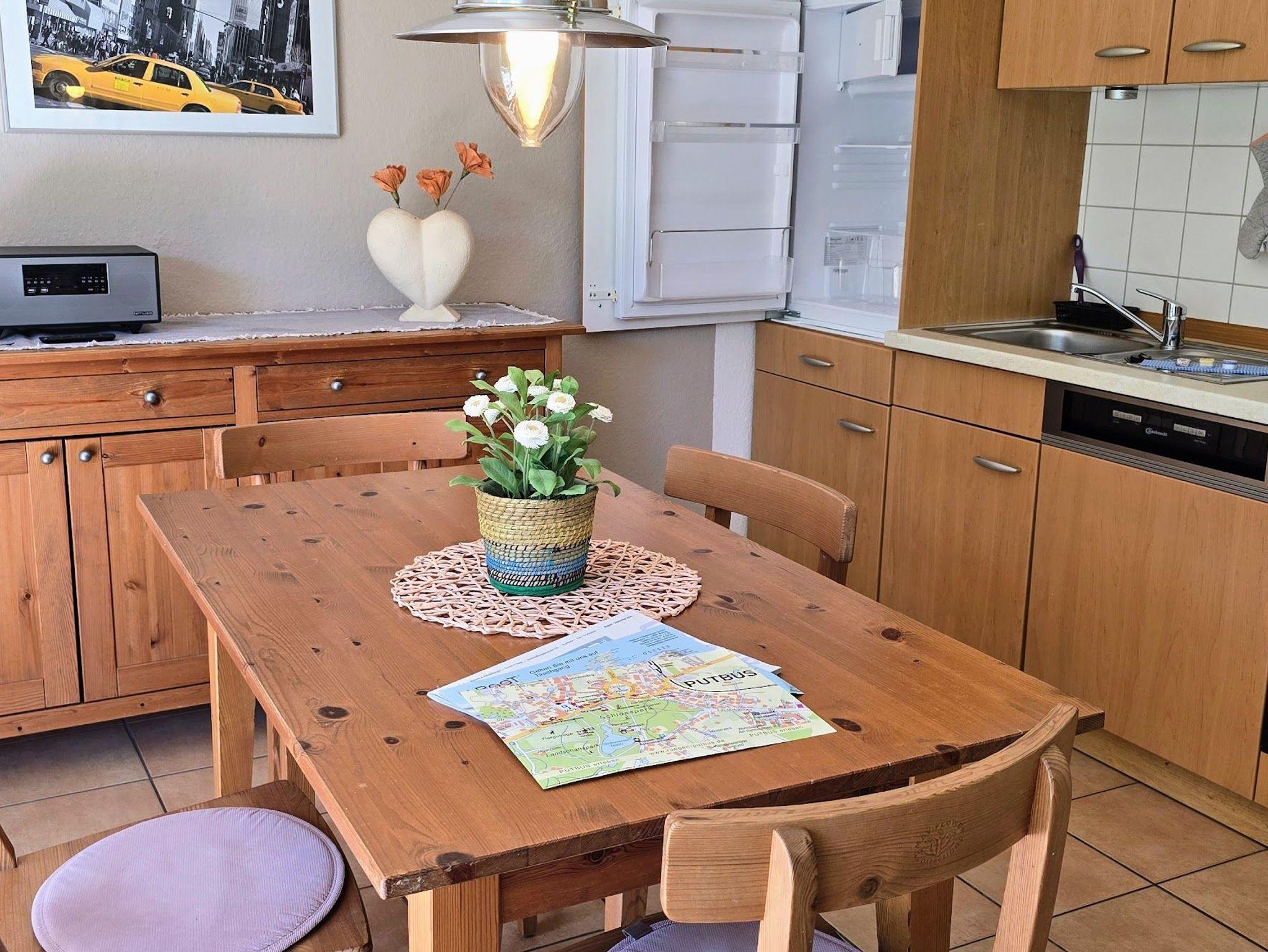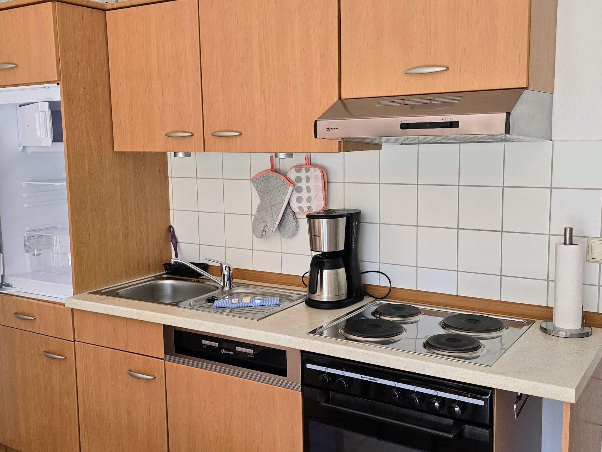 2 Raum Apartement mit Terrasse , 1,80m x 2 Doppelbett im Schlafzimmer und Schlafcouch im Wohnzimmer sowie einer gut ausgestatteten Küchenzeile mit Geschirrspüler und Backofen . Esstisch für 4 Personen. Kaffemaschine und Toaster sind vorhanden. Erstausstattung Bettwäsche und Handtücher vorhanden. Kinderbett und Hochstuhl für die Kleinsten bitte vorbestellen . Für Ihr Auto ist ein Garagenplatz vorgesehen. Max. Höhe 1,50m.