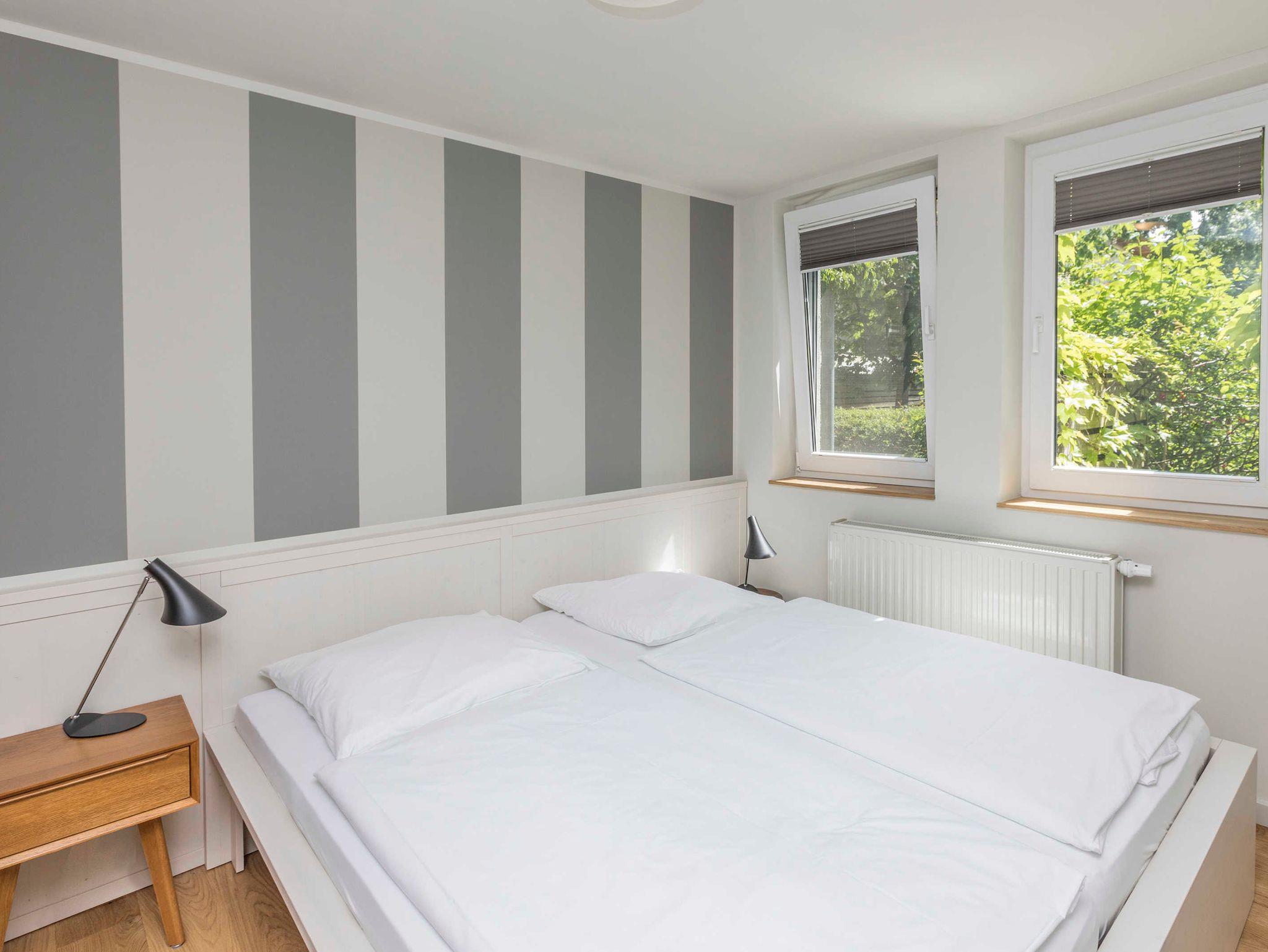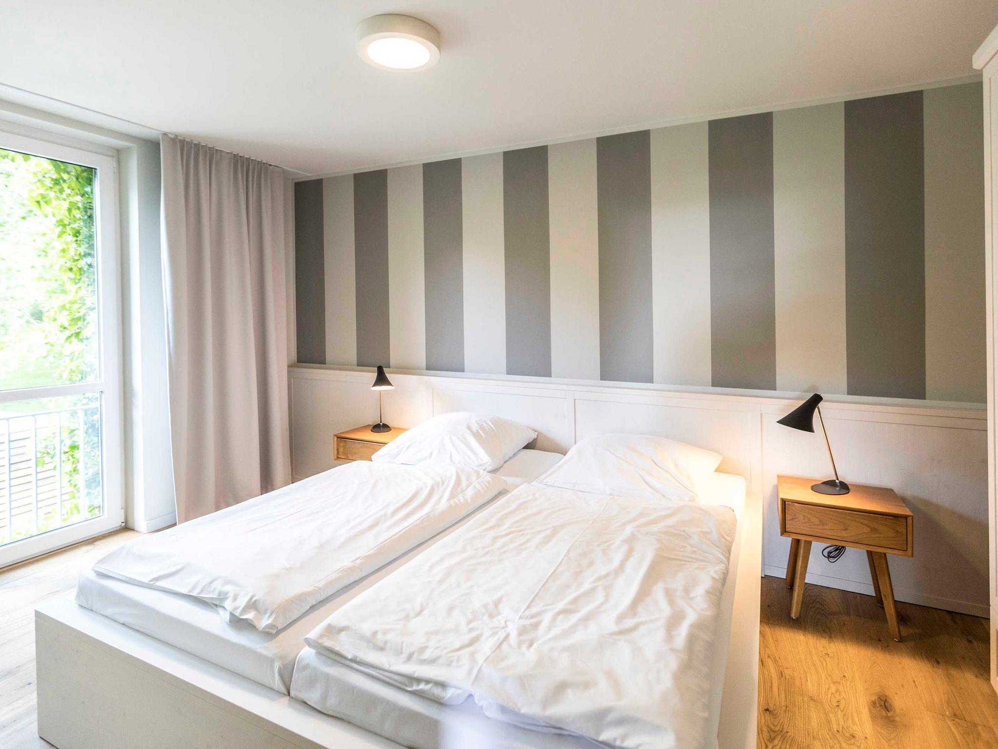 Zwei Schlafräume mit Doppelbetten und ein Wohnraum mit Aufbettung für zwei Personen (Schlafcouch), Küchenzeile, SAT-TV, Musikanlage, Bad mit WC und Dusche, Balkon oder Terrasse.
