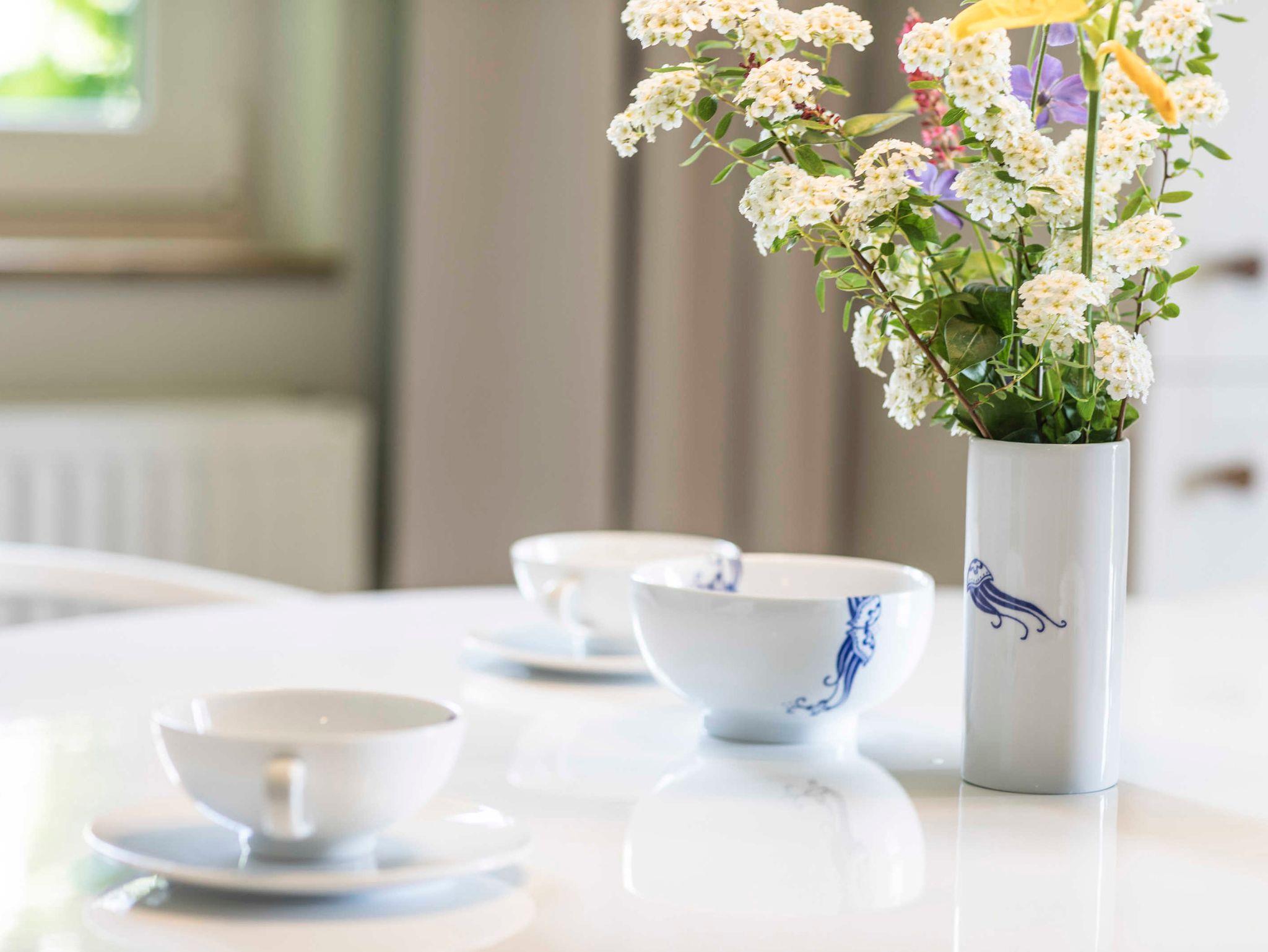 Ausstattung der Küche: 4-Zonen-Kochfeld, Backofen, Geschirrspüler, Filter-kaffeemaschine, Wasserkocher, Toaster, Geschirr, Besteck, Pfannen und Töpfe.