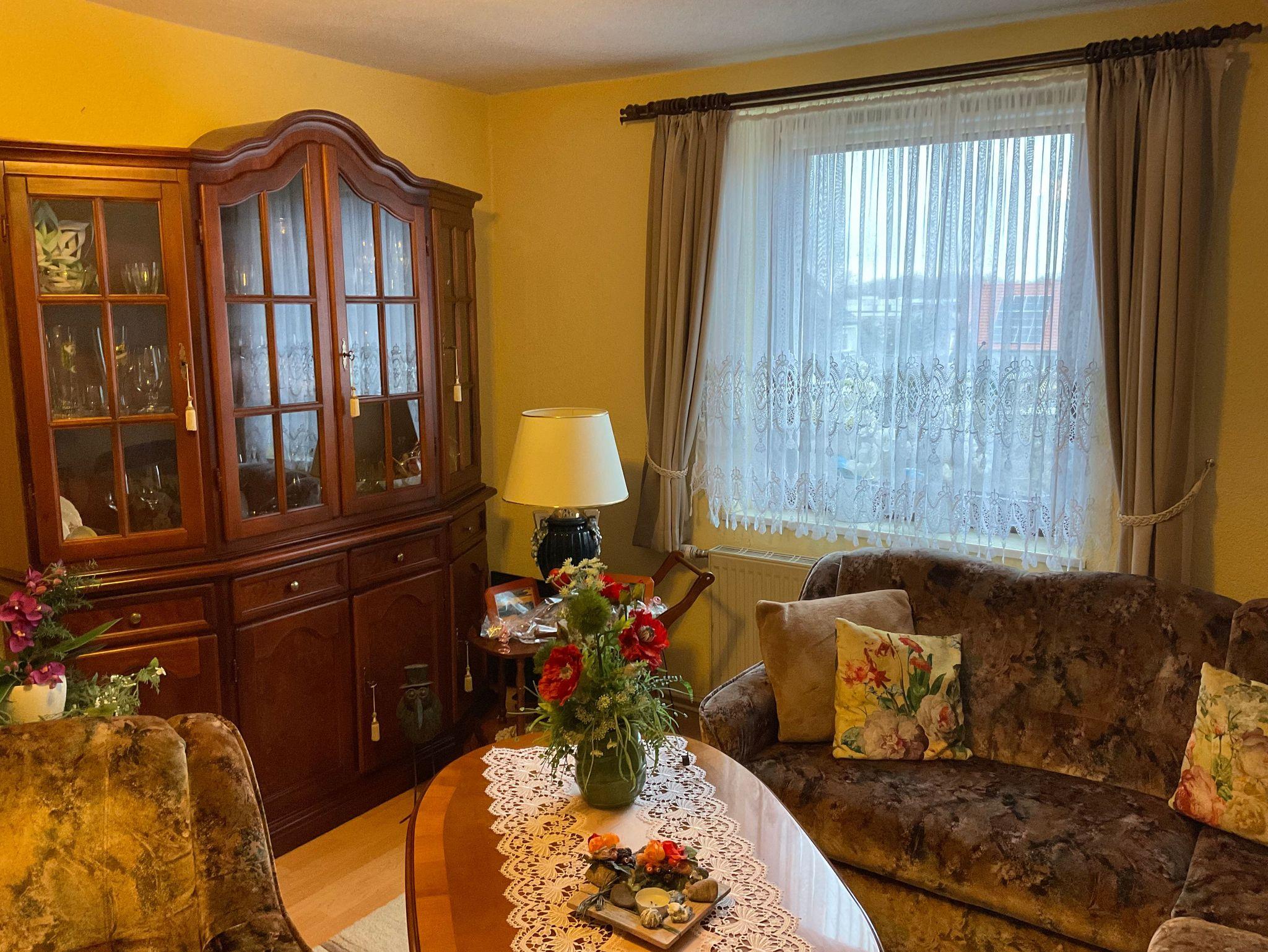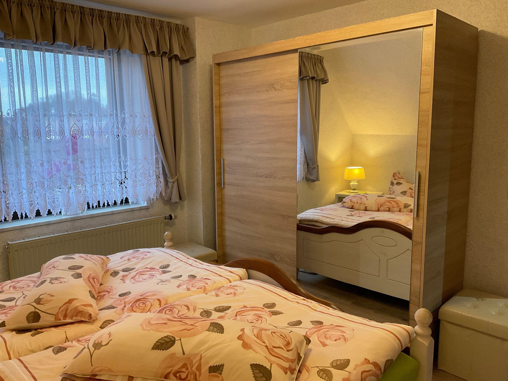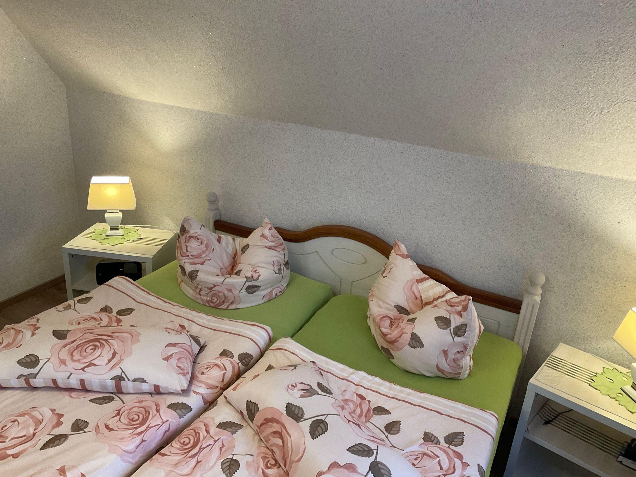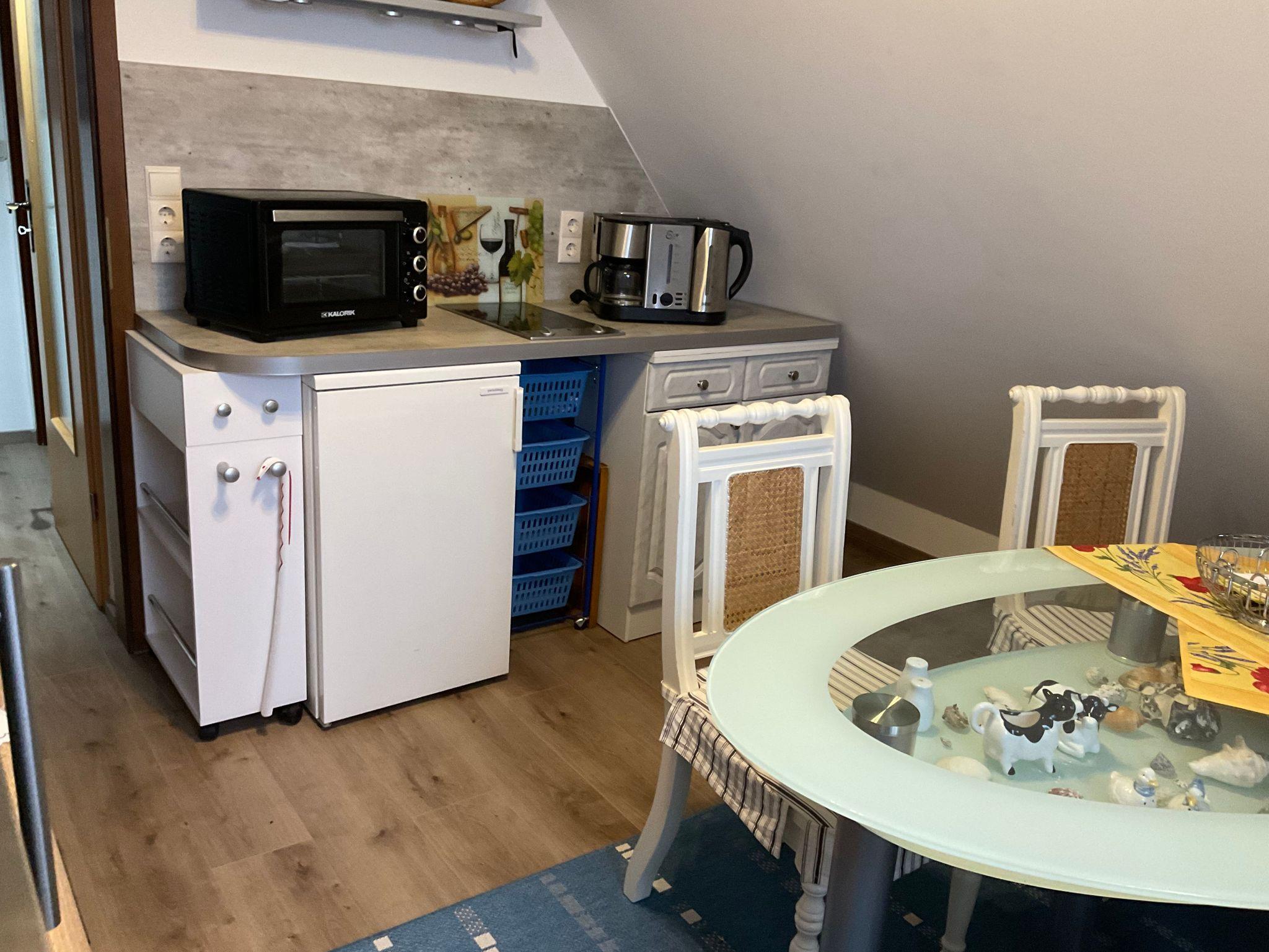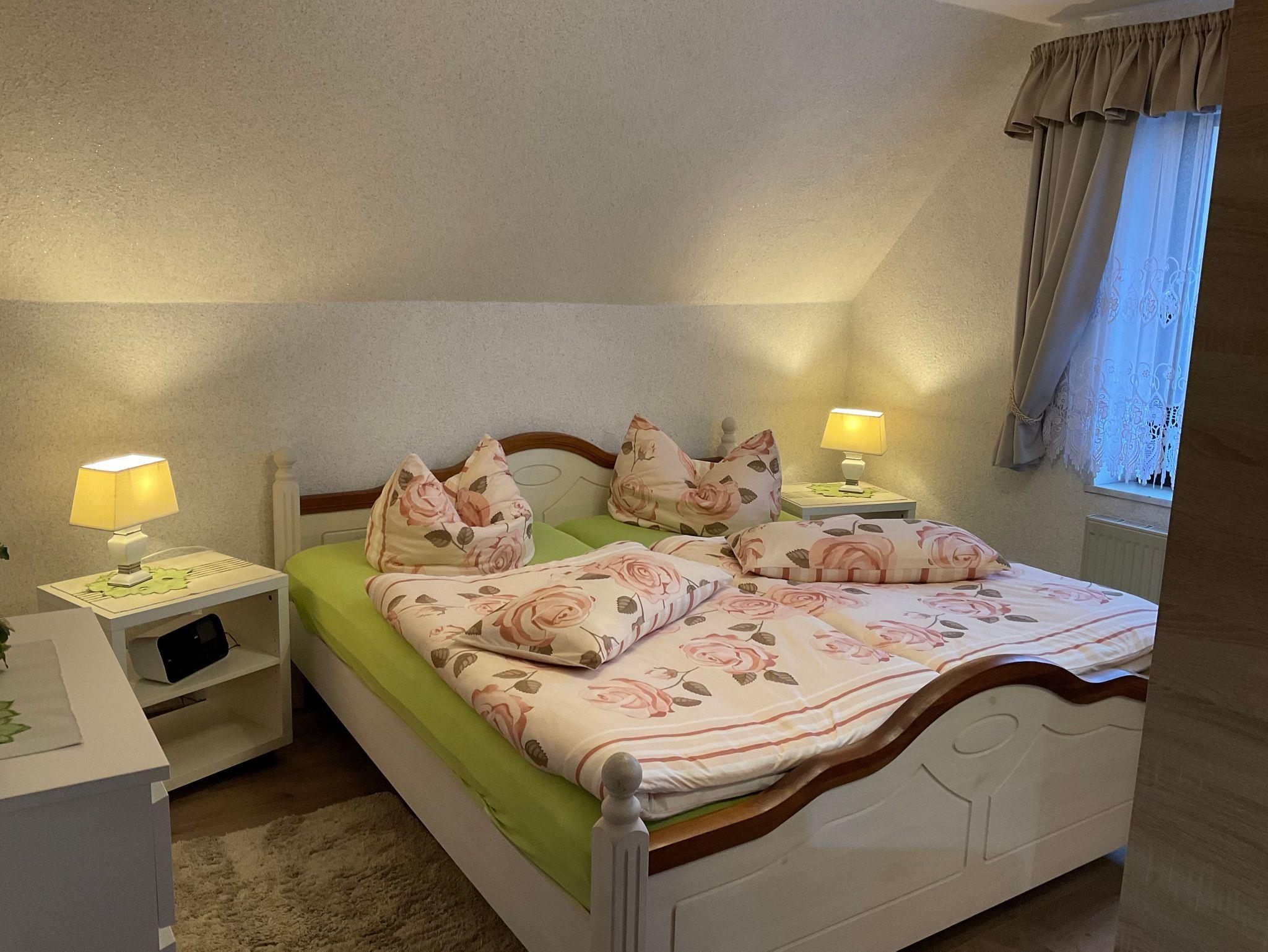 Die ca. 50 m² große Ferienwohnung im Obergeschoß bietet 2 Personen ausreichend Platz. Sie besteht aus einem Wohnraum mit Sitzgruppe dem Schlafraum mit dem Doppelbett. Die Küche ist in einem sep. Raum. Bad mit Dusche und WC.