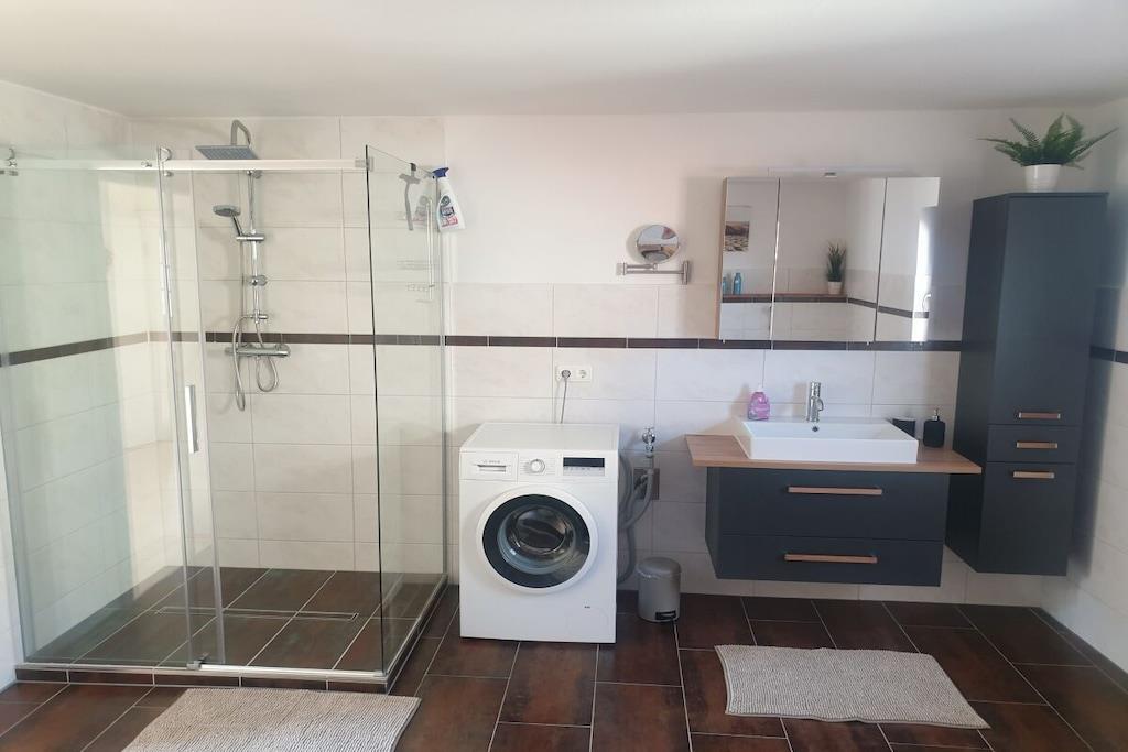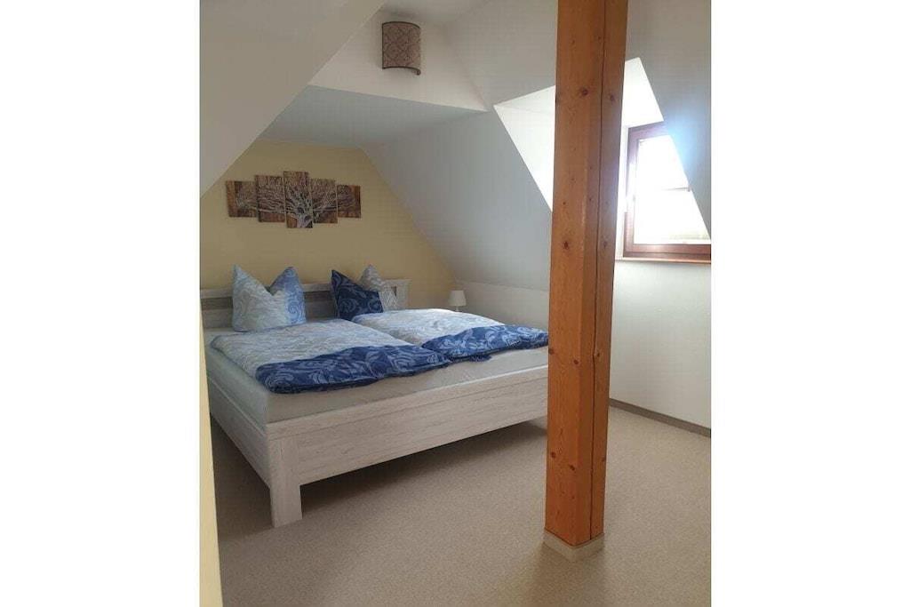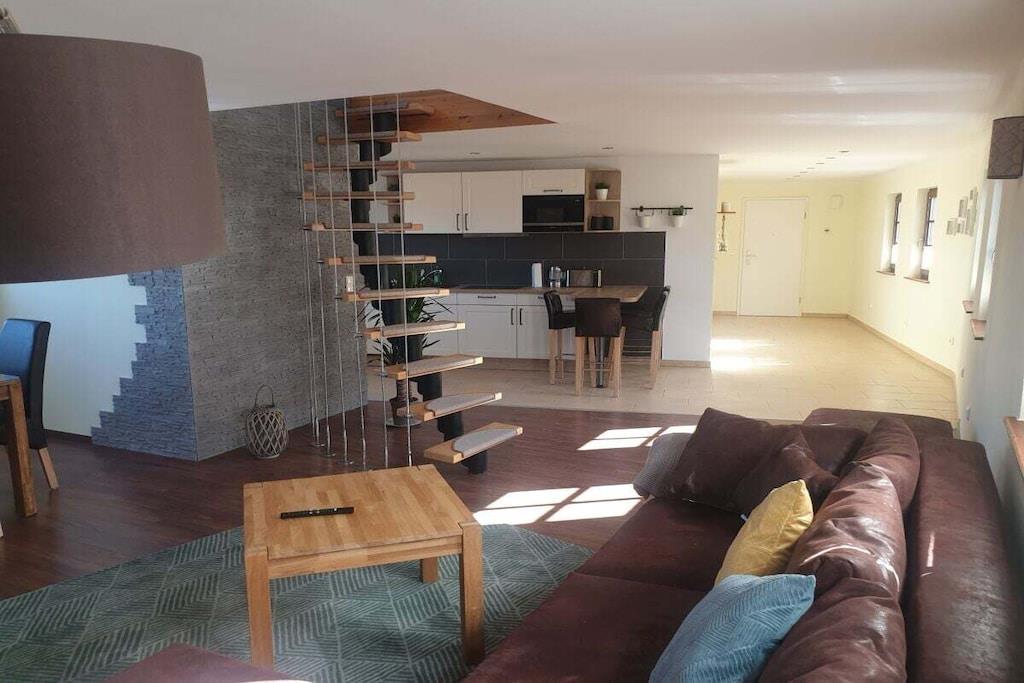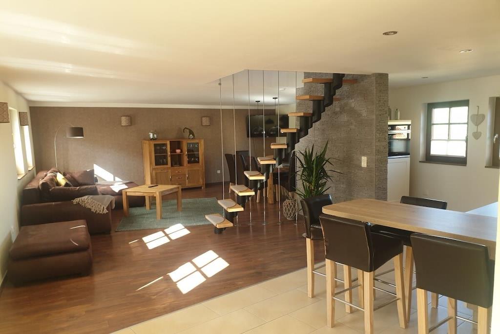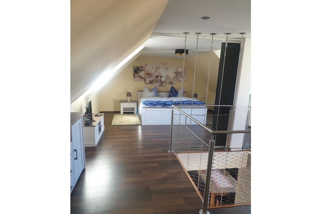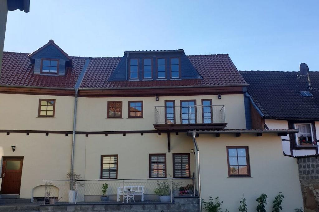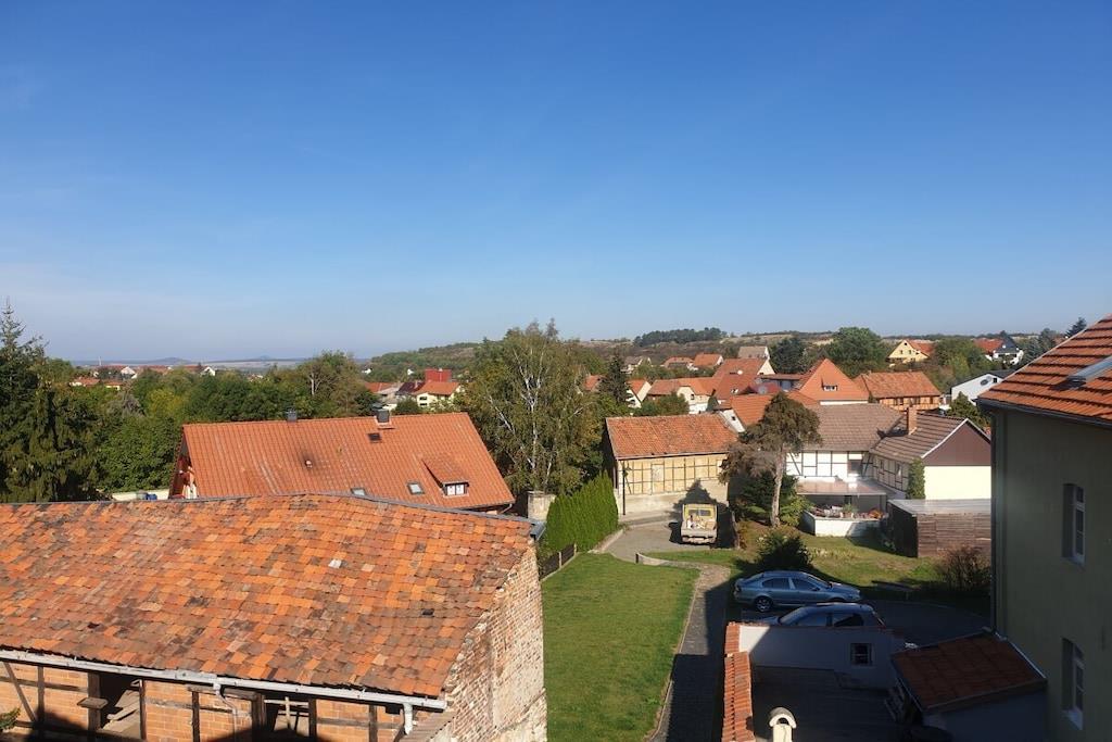 Die Wohnung wurde im Jahr 2020 vollständig saniert. Wir haben dort mit hochwertigen Materialien auf zwei Etagen einen offenen und modernen Wohnbereich geschaffen, der Ihnen viel Raum zur Erholung bietet. Die Ausstattung der Wohnung haben wir mit viel Liebe zum Detail so ausgewählt, dass auch wir uns wohl und zu Hause fühlen würden. In der unteren Etage befindet sich mit dem großzügig geschnittenen Wohn- und Essbereich der zentrale Punkt der Wohnung. Von hier aus hat man Zugang zum Balkon, der einen tollen Ausblick in das Harzvorland bietet. An der Ausstattung der Küche werden auch ambitionierte Hobbyköche ihre Freude haben. Der Küchenbereich ist offen gestaltet und schließt sich direkt an den Wohnbereich an. So kann man wunderbar gemeinsam Zeit miteinander verbringen, auch wenn sich nicht alle Familienmitglieder zum Koch berufen fühlen und sich vielleicht lieber einige auf der Couch bei einem Film entspannen, bis das Essen auf dem Tisch steht. Besonders stolz sind wir auf das Badezimmer. Es ist mit einer großen Eckbadewanne und einer separaten Dusche ausgestattet und bietet damit ideale Voraussetzungen, um sich nach einem längeren Ausflug zu entspannen und auf den Abend vorzubereiten. Über eine Wendeltreppe erreicht man die obere Etage mit den Schlafräumen. Der Zugang zur Treppe kann im oberen Bereich mit einer Tür verschlossen werden. Das war uns besonders wichtig, um vor allem unsere kleinen Gäste vor Fehltritten zu schützen. Neben den 2 Schlafräumen und den Kinderzimmer mit viel Spielzeug, gibt es im oberen Bereich auch eine zusätzliche Toilette. Unsere Wohnung ist mit einer Fußbodenheizung ausgestattet und bietet somit besten Komfort ! Für laue Sommernächte haben wir auf dem Grundstück einen Grillplatz eingerichtet, den Sie gerne nutzen können. Sollten Sie weitere Fragen zur Wohnung haben, kontaktieren Sie uns einfach. Wir freuen uns auf Ihren Besuch! Ein Urlaub in Gernrode mit seinen kleinen Gassen und liebevoll sanierten Häusern ist wie eine Zeitreise in eine Welt, in der die Uhren langsamer liefen. Eine Welt, in der man sich auch beim Bauen Zeit für die schönen Details genommen hat, die einem Haus erst Charakter verleihen. Ein idealer Ort, um sich von der Hektik des Alltags zu erholen. Bei uns kann man in diese Welt eintauchen, ohne im Urlaub auf den Komfort der modernen Welt verzichten zu müssen.