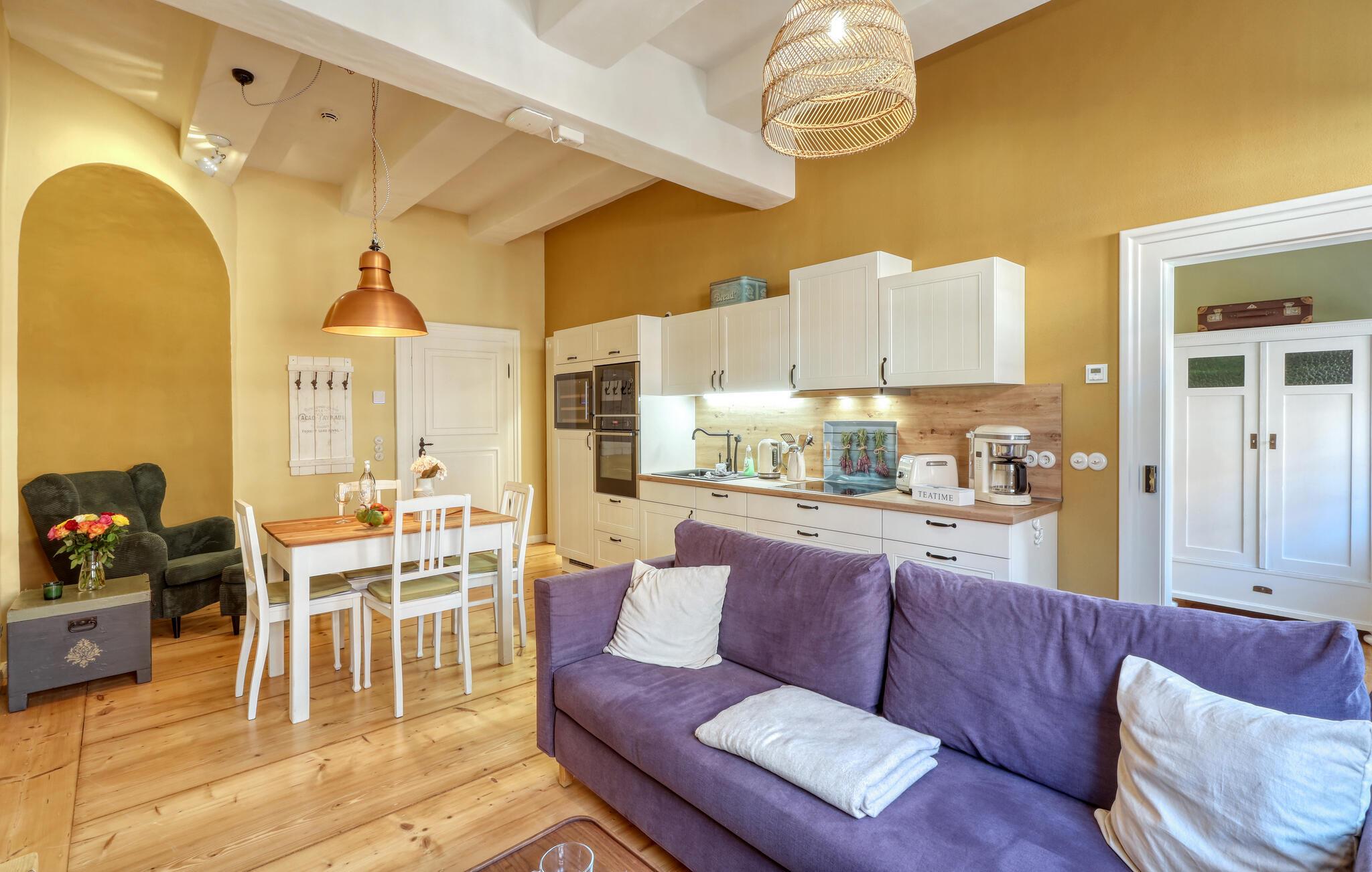 Velkommen til denne smukke lejlighed, der byder sine gæster velkommen med lyse, stilfuldt indrettede værelser i en historisk bygning. Føl jer godt tilpas her med dine kære og nyd komforten og den smagfulde atmosfære. Slap af i saunaen, som deles med andre gæster, og hold jer i form selv på ferien med fitnessudstyret. Nyd din første kaffe og et par solstråler på terrassen, inden I begiver jer ud i dine aktiviteter.