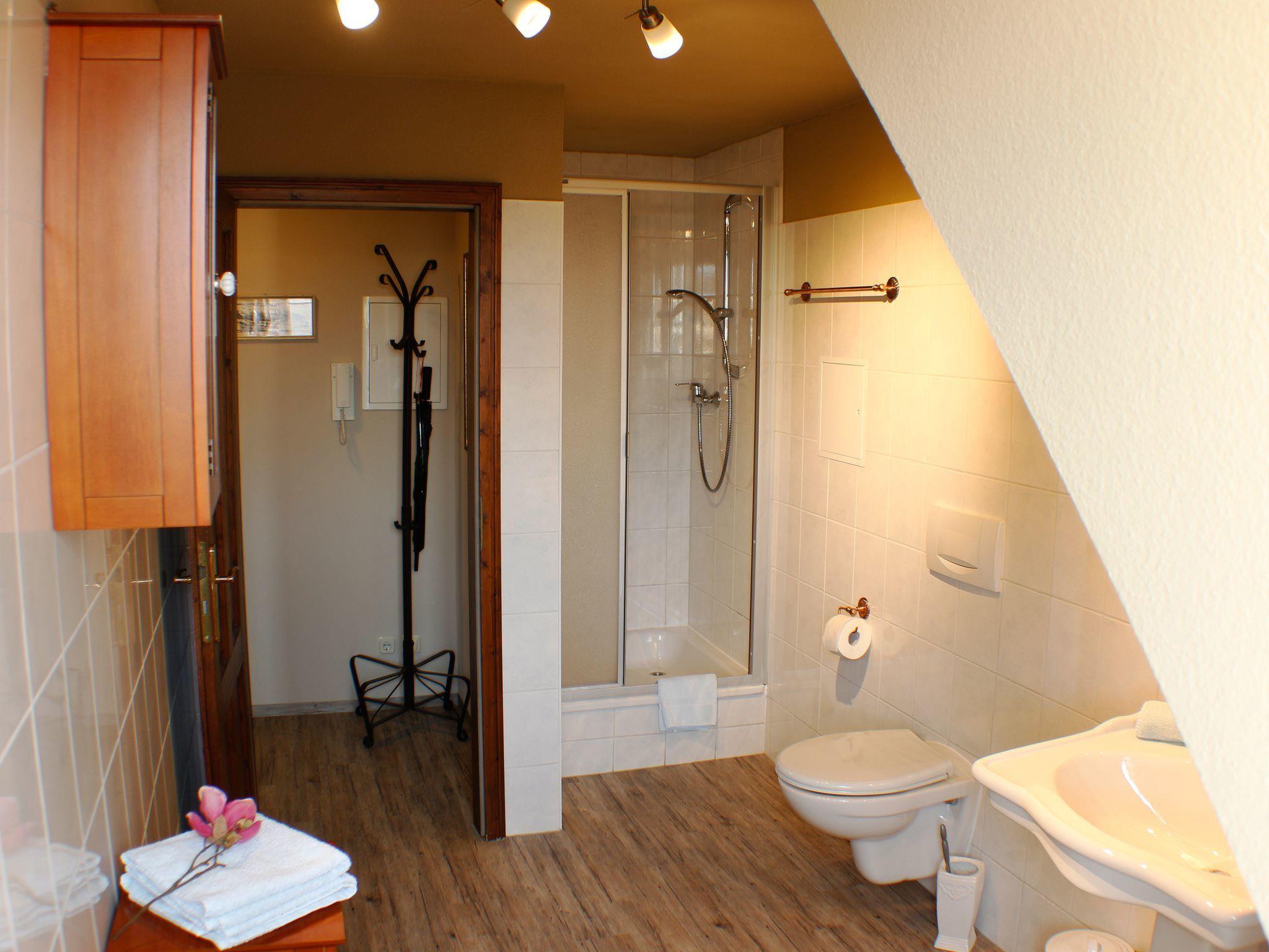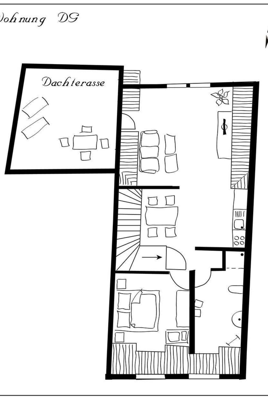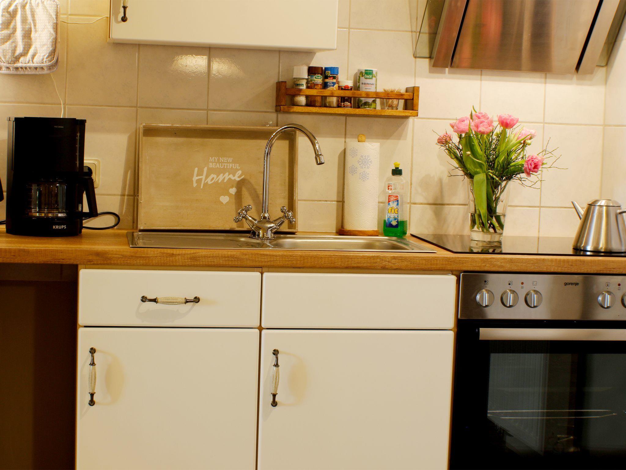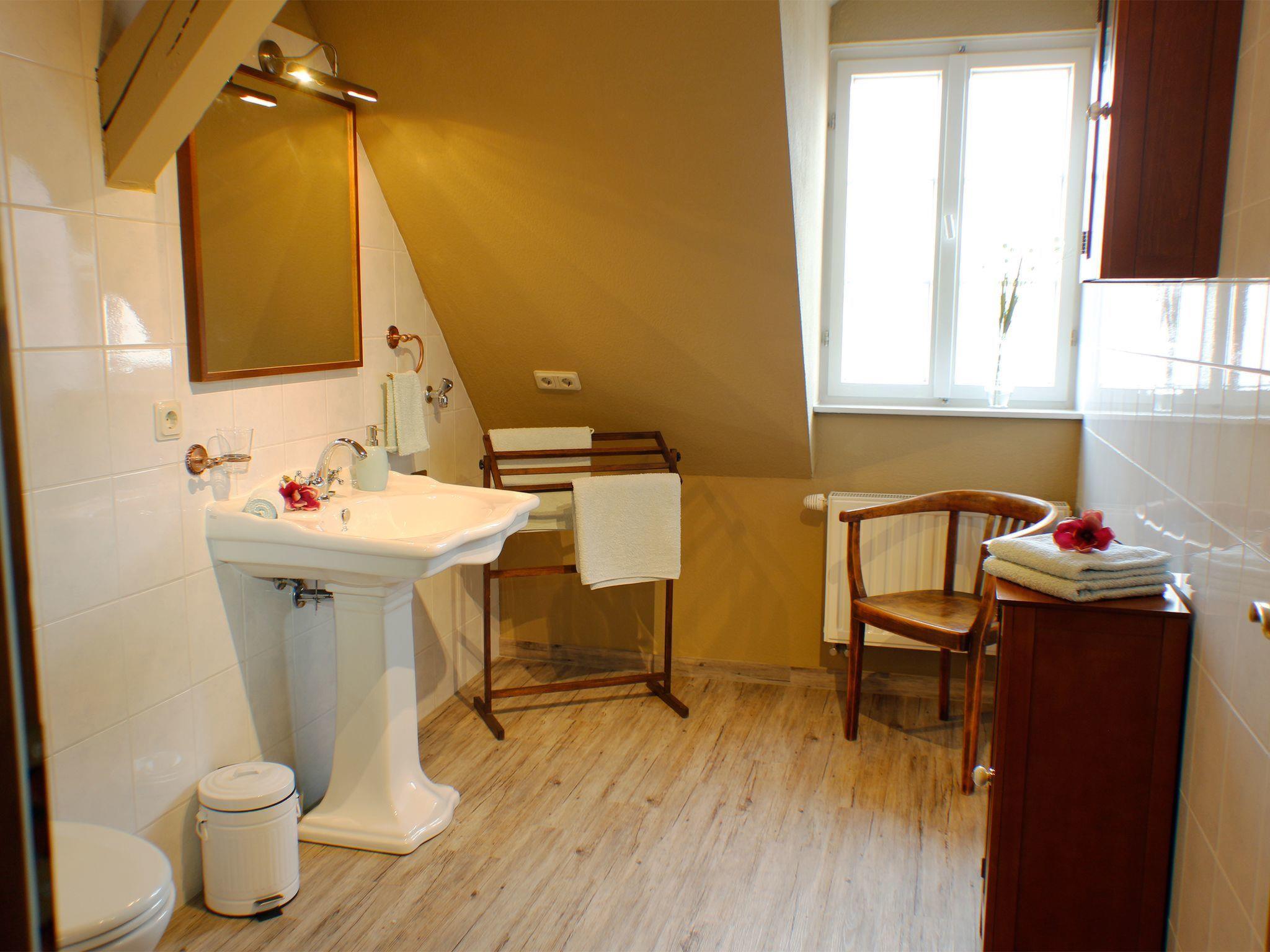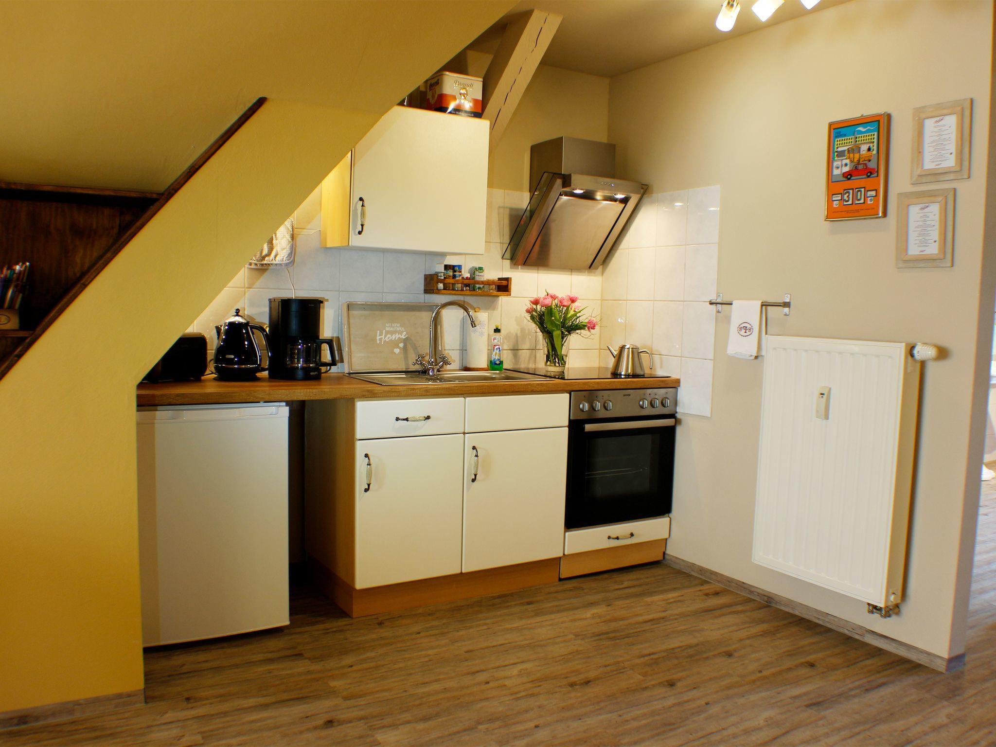 The holiday flat welcomes you into a very cosy atmosphere, characterised by the exposed beams, the sloping roof and lovingly selected furnishings. It is divided into a separate bedroom with double bed, a spacious open-plan living and dining area with pull-out sofa bed, and a spacious daylight shower room with WC. After climbing the stairs, you step through the front door into the open-plan living area and find the bedroom on your right. This is furnished with a 180 cm x 200 cm double bed with headboard and footboard and bedside tables and reading lamps on both sides. There is a wardrobe in front of the bed with plenty of storage space for your luggage. Next to the bedroom is the large shower room with a shower cubicle, under-mounted washbasin, illuminated mirror and bathroom window. The open-plan living area leads past a dining table with four chairs to the open-plan kitchenette. This has all the utensils you need for self-catering, including a four-ring hob with oven, fridge, coffee machine, kettle and toaster. You then enter the cosy living area with a comfortable pull-out sofa and an armchair. The modern flat-screen TV with satellite TV and TV-USB connection, as well as a compact music system (CD / DVD / MP3) provide entertainment after a day out. Hand and bath towels, bed linen, final cleaning and internet access via WLAN are included in the allergy-friendly flat.