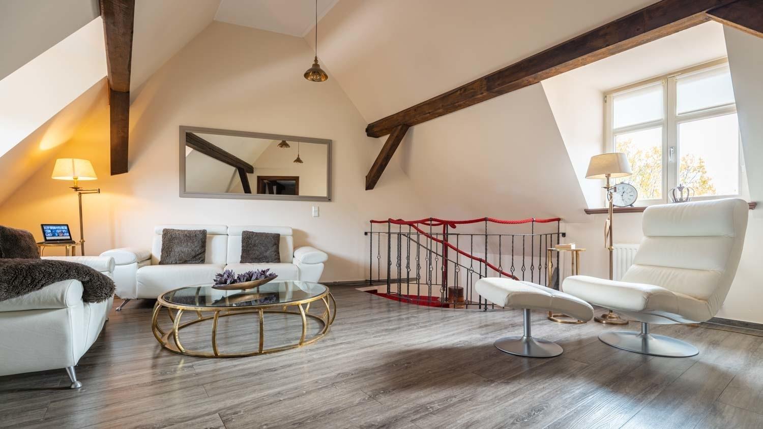 Im oberen Bereich des Apartments befindet sich ein geräumiges Wohnzimmer, das mit hochwertigen Möbeln und stilvollen Dekorationen ausgestattet ist. Die Fenster durchfluten den Raum mit Tageslicht und bieten einen malerischen Blick auf die Umgebung.