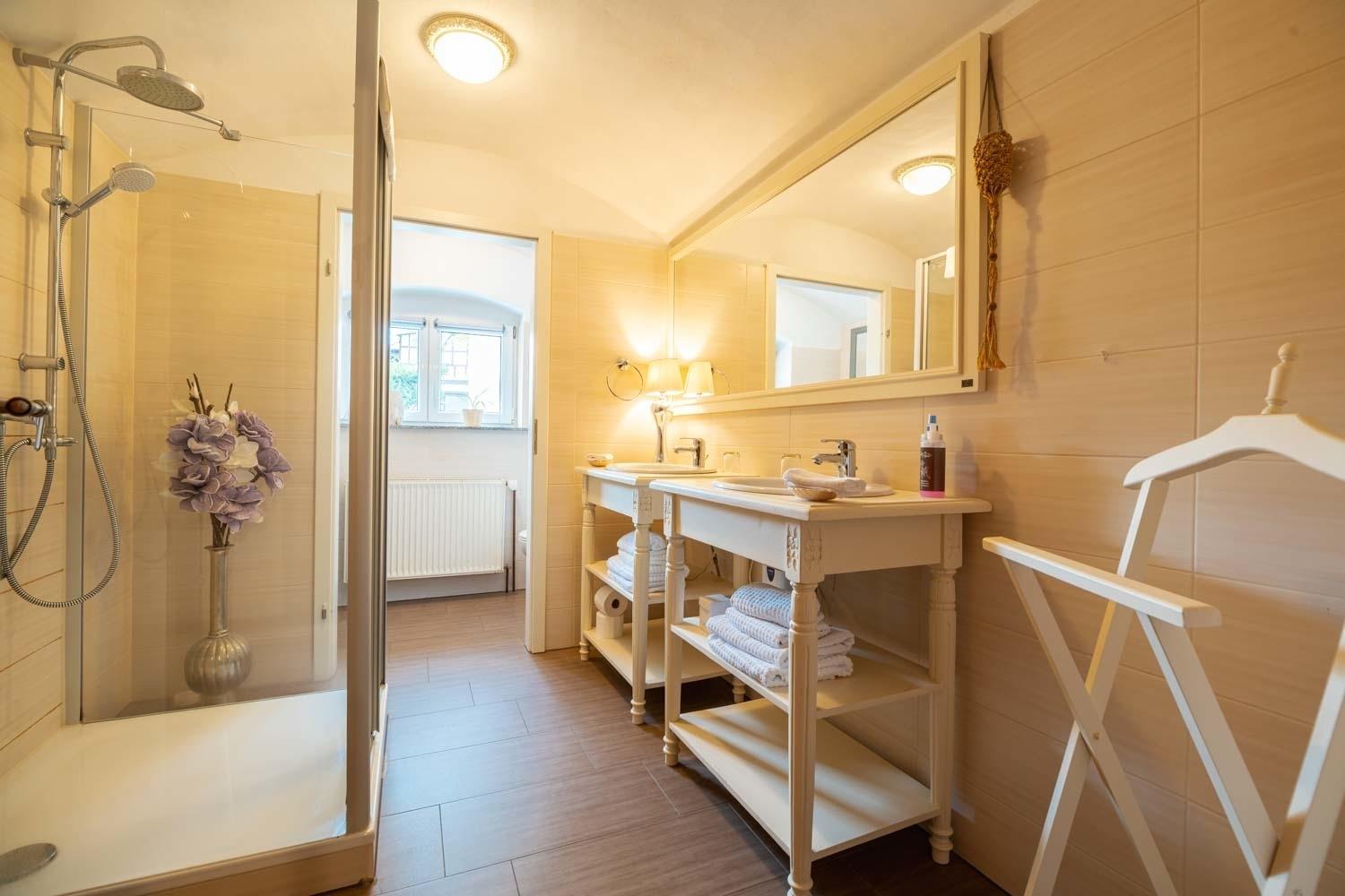 Die beiden Badezimmer sind modern und geräumig gestaltet, eines mit Dusche und eines Badewanne. Hochwertige Armaturen und stilvolle Fliesen unterstreichen den gehobenen Charakter der Ferienwohnung.