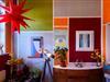 Das große, moderne Ehebett, mit seiner dickpolstrigen Lederlehne lädt förmlich zum Schlafen ein, kann aber auch wunderbar als Liegecouch verwendet werden. Das Bad, ebenfalls ein Hingucker, ist ausgestattet mit einer Rundtür-Dusche, zum bequemen Ein- und Ausstieg. Ein besonderes Highlight in der Küche ist der extra angepasste Holztisch mit witzigen, sehr bequemen Hochstühlen. Die breiten Dielen darunter und das alte Gebälk darüber, fügen sich harmonisch in das farbenfrohe Flair der Einrichtung ein.