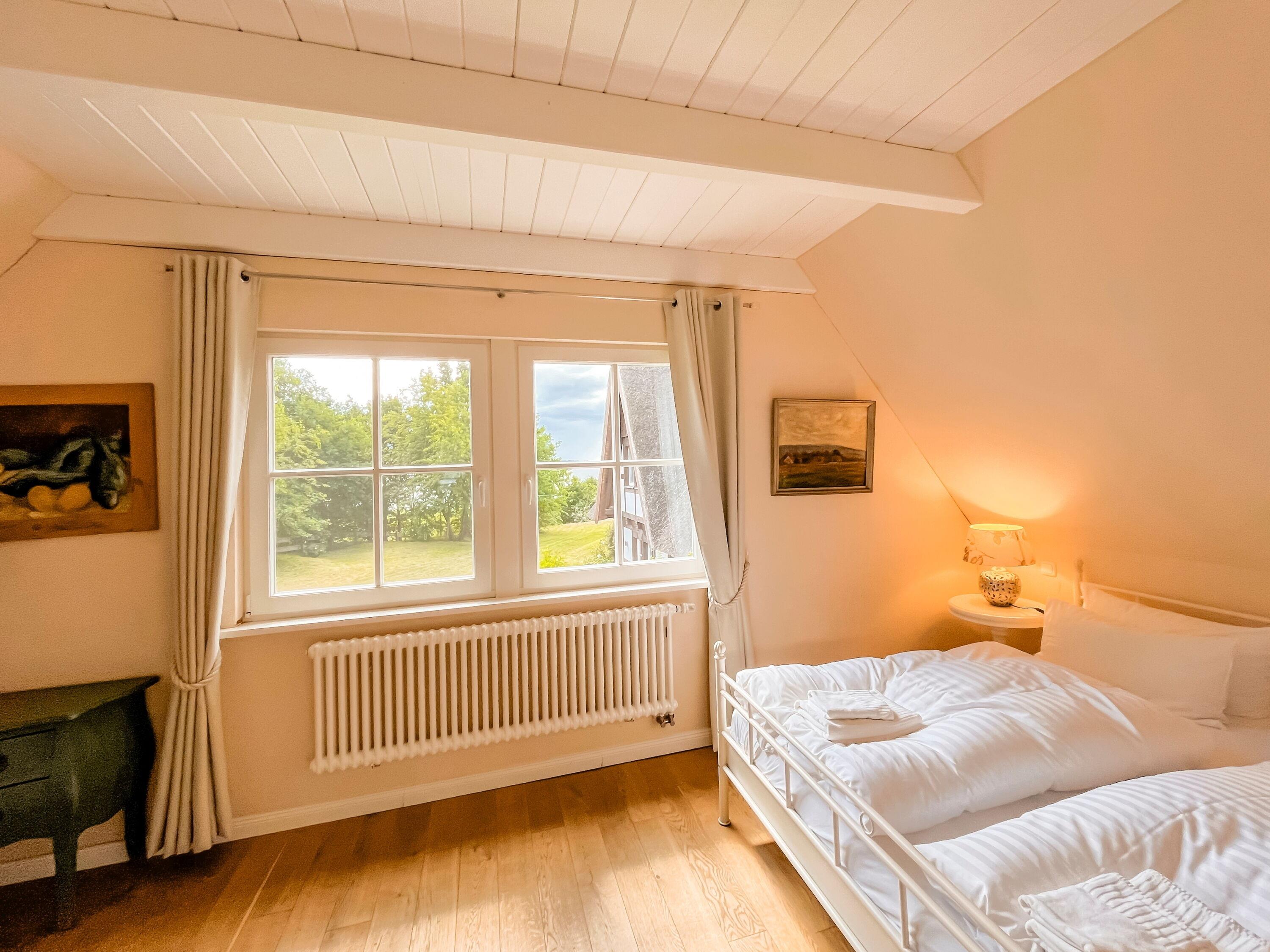 Zwei Schlafzimmer mit komfortablen Doppelbetten, eines davon ausgestattet mit TV. Der Zugang zur Schlafgalerie im Dachgeschoss erfolgt über eine innenliegende Treppe innerhalb eines der Schlafzimmer.
