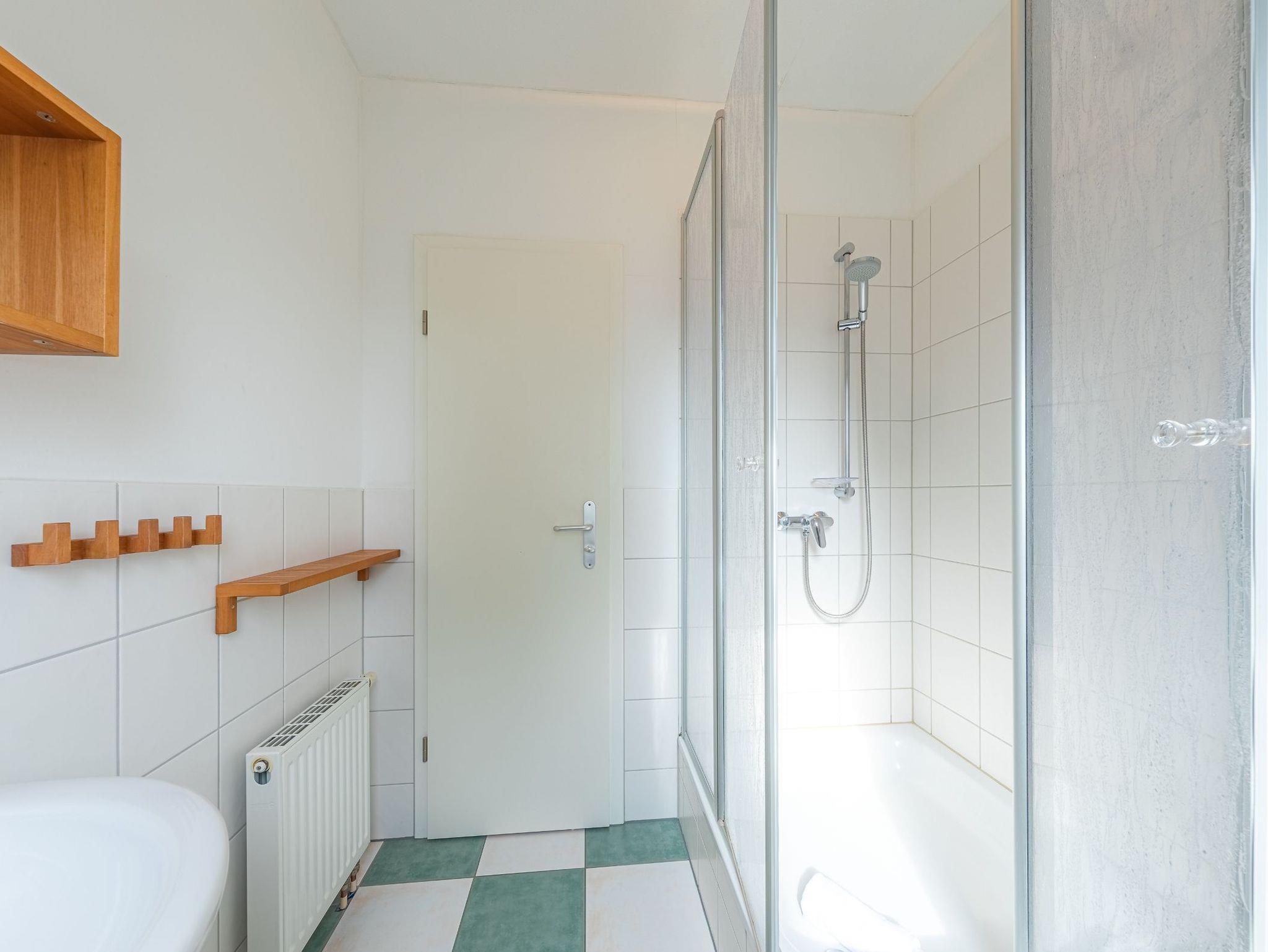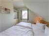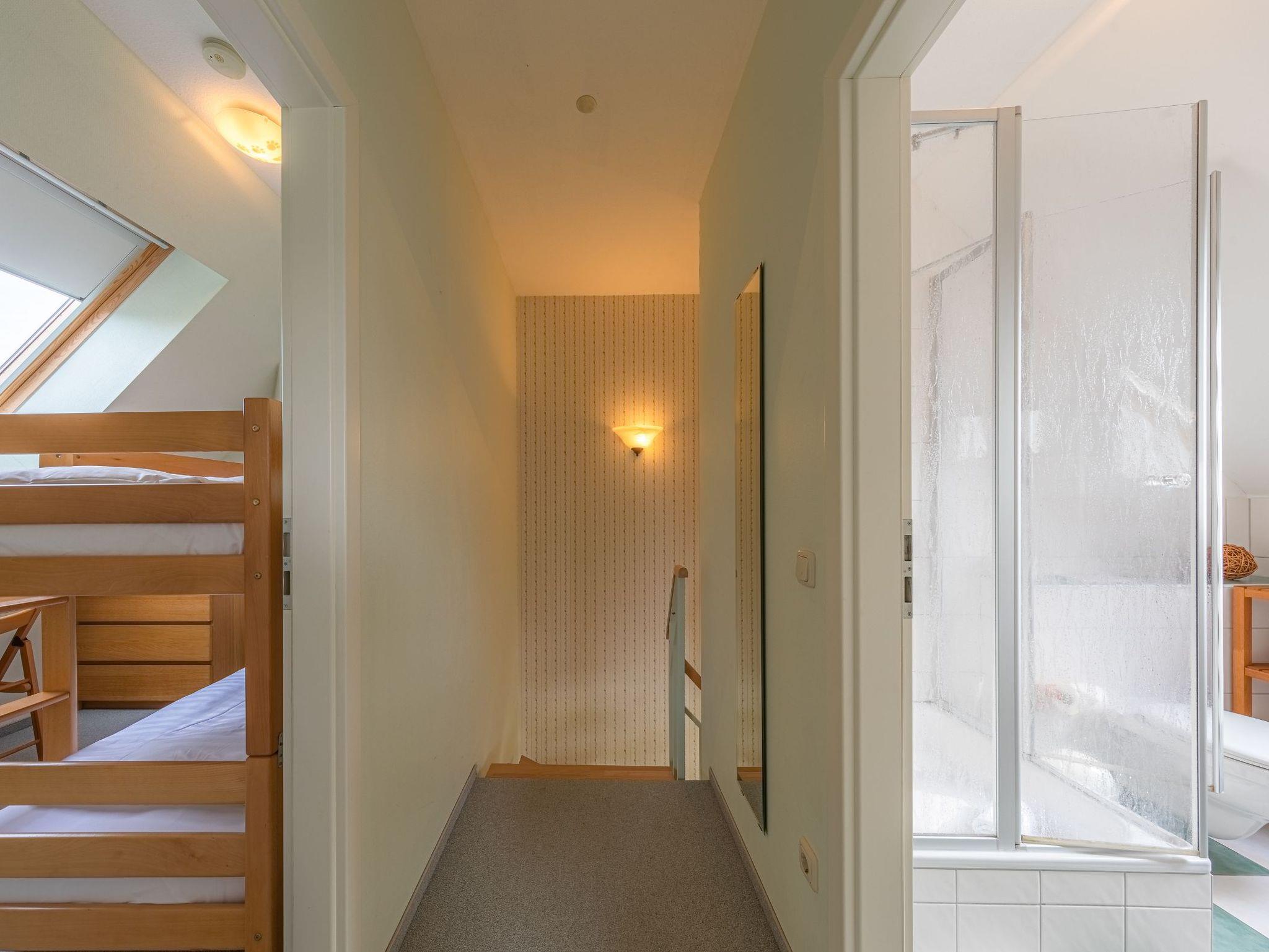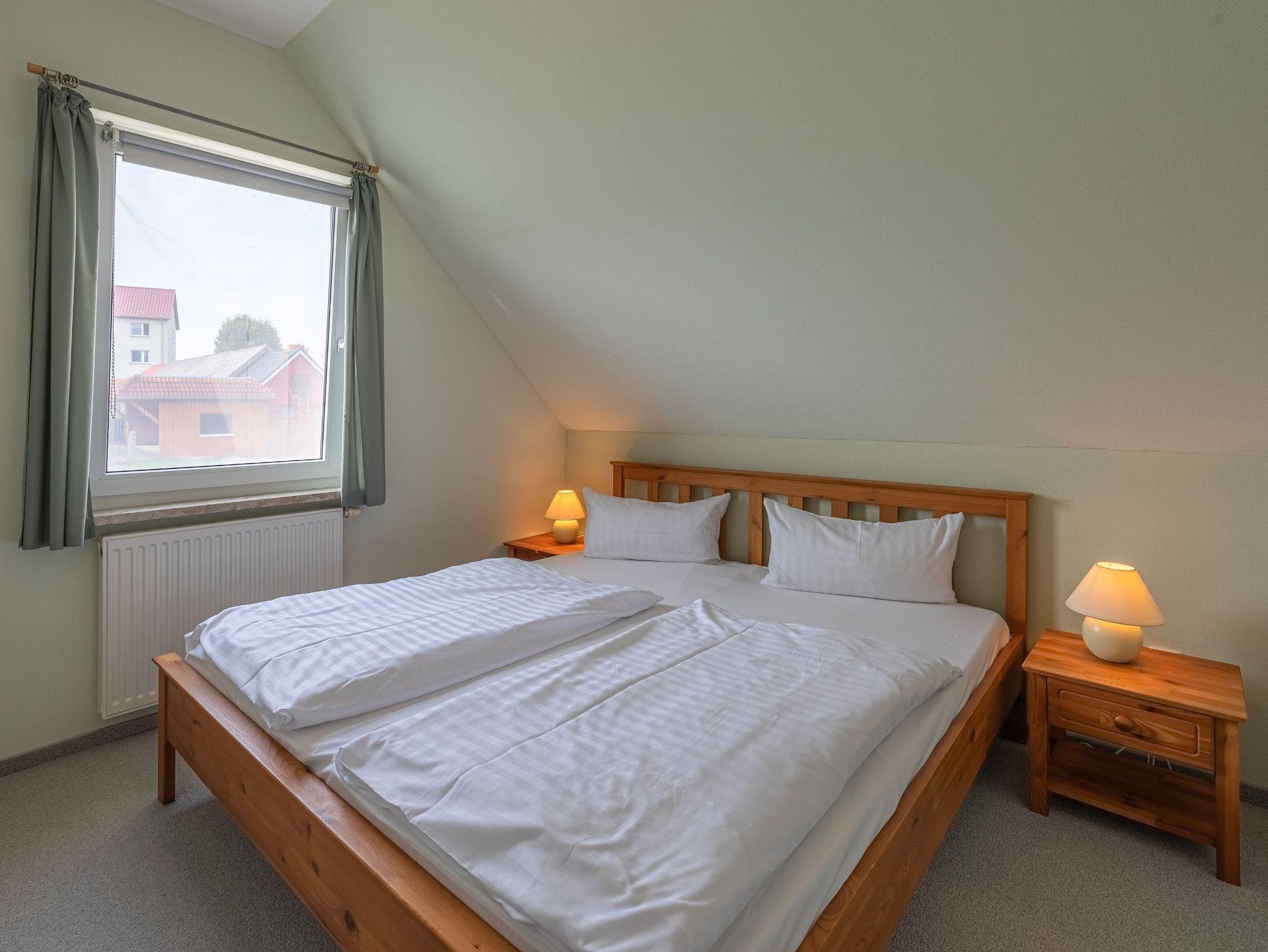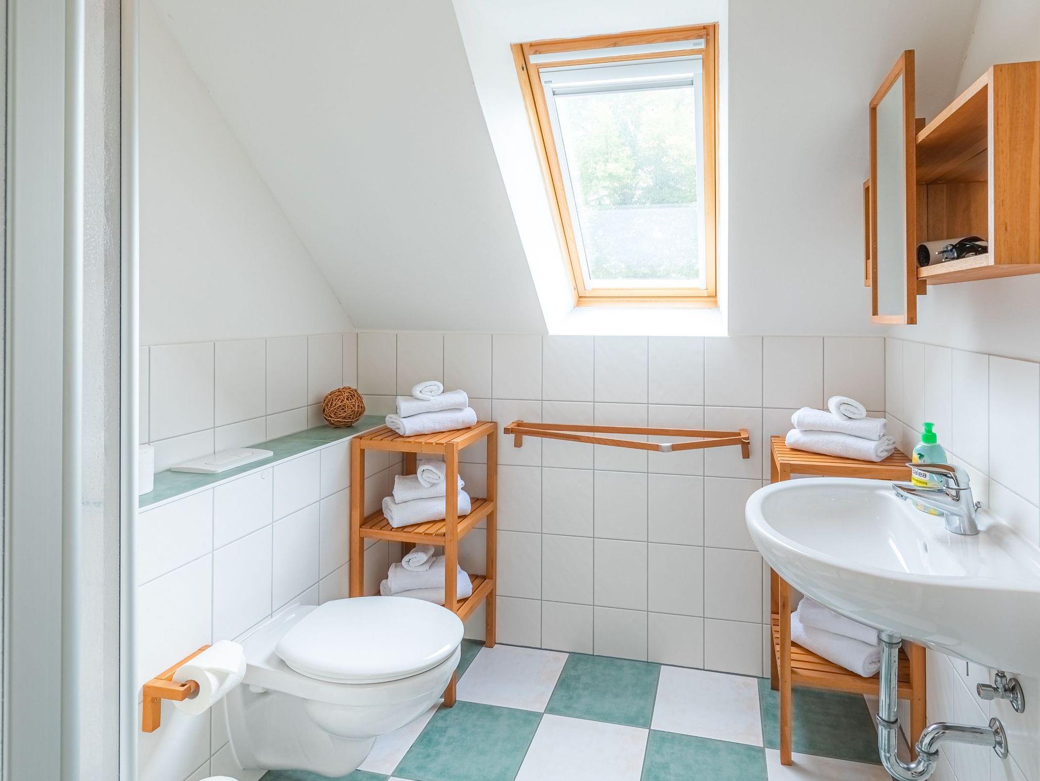 Im Obergeschoss befinden sich drei Schlafzimmer sowie das Bad mit Dusche und WC. Neben einem Zimmer mit Doppelbett sowie einem Zimmer mit einem Etagenbett können die Betten im dritten Raum entweder einzeln oder aber als Doppelbett gestellt werden. So bietet das Ferienhaus Kornblume an der Müritz Platz für 6 Personen.