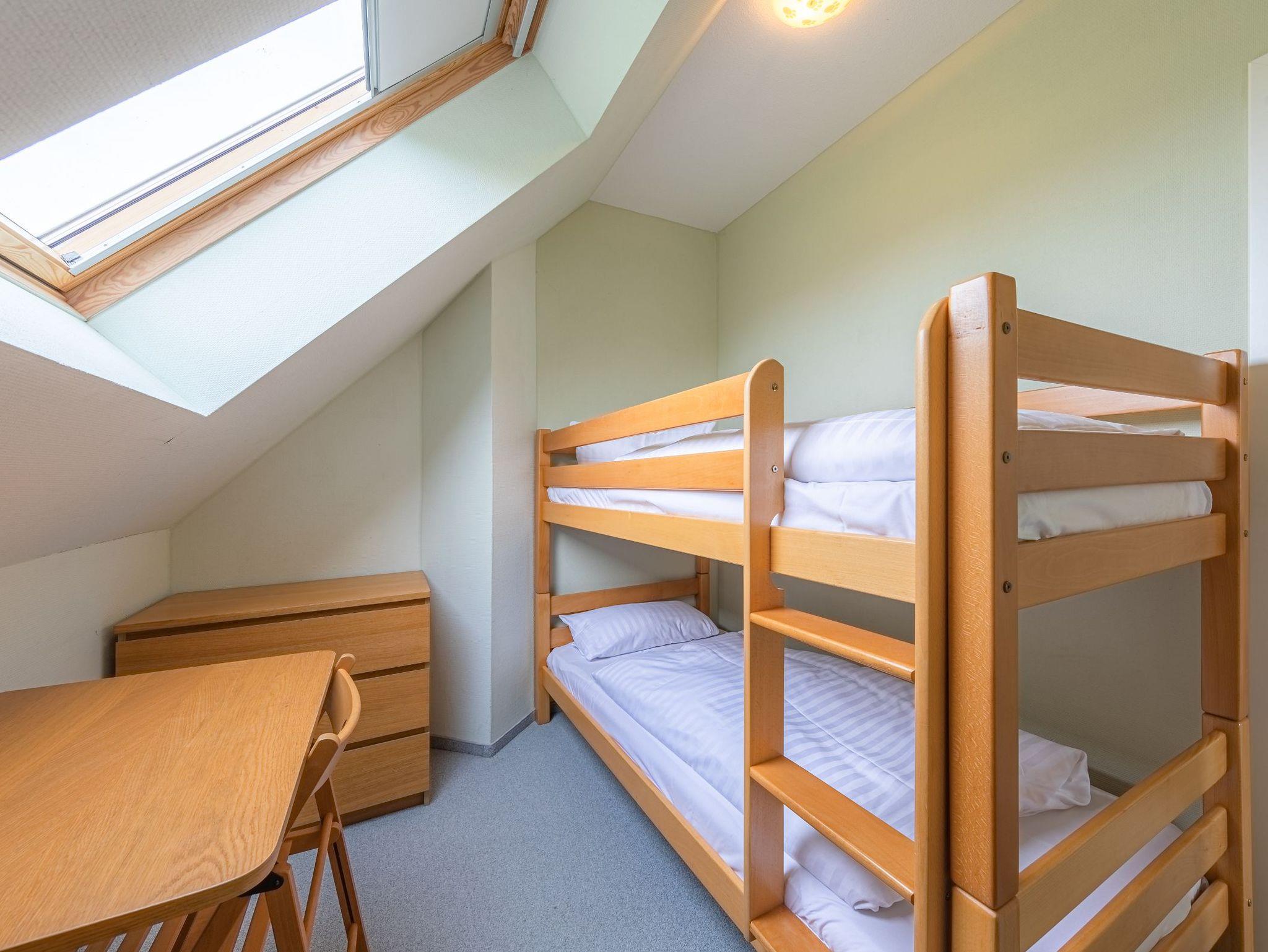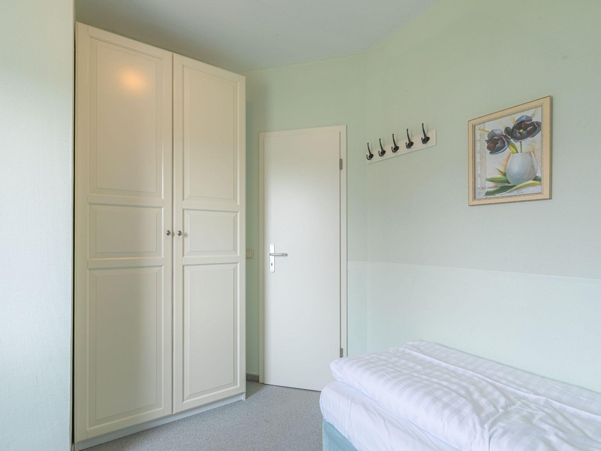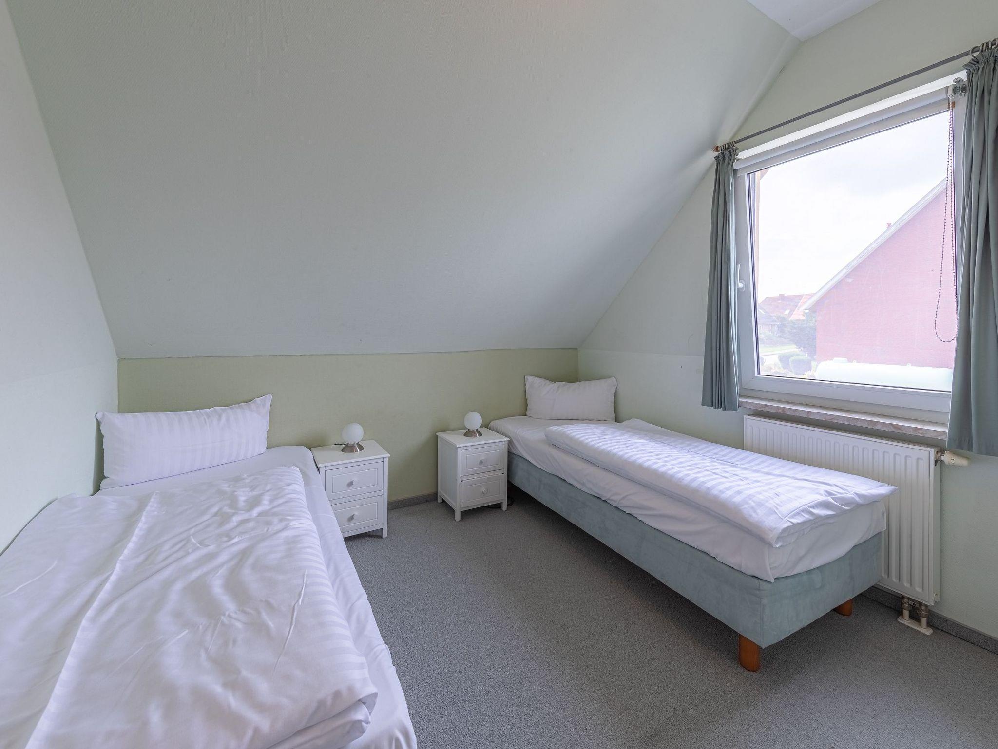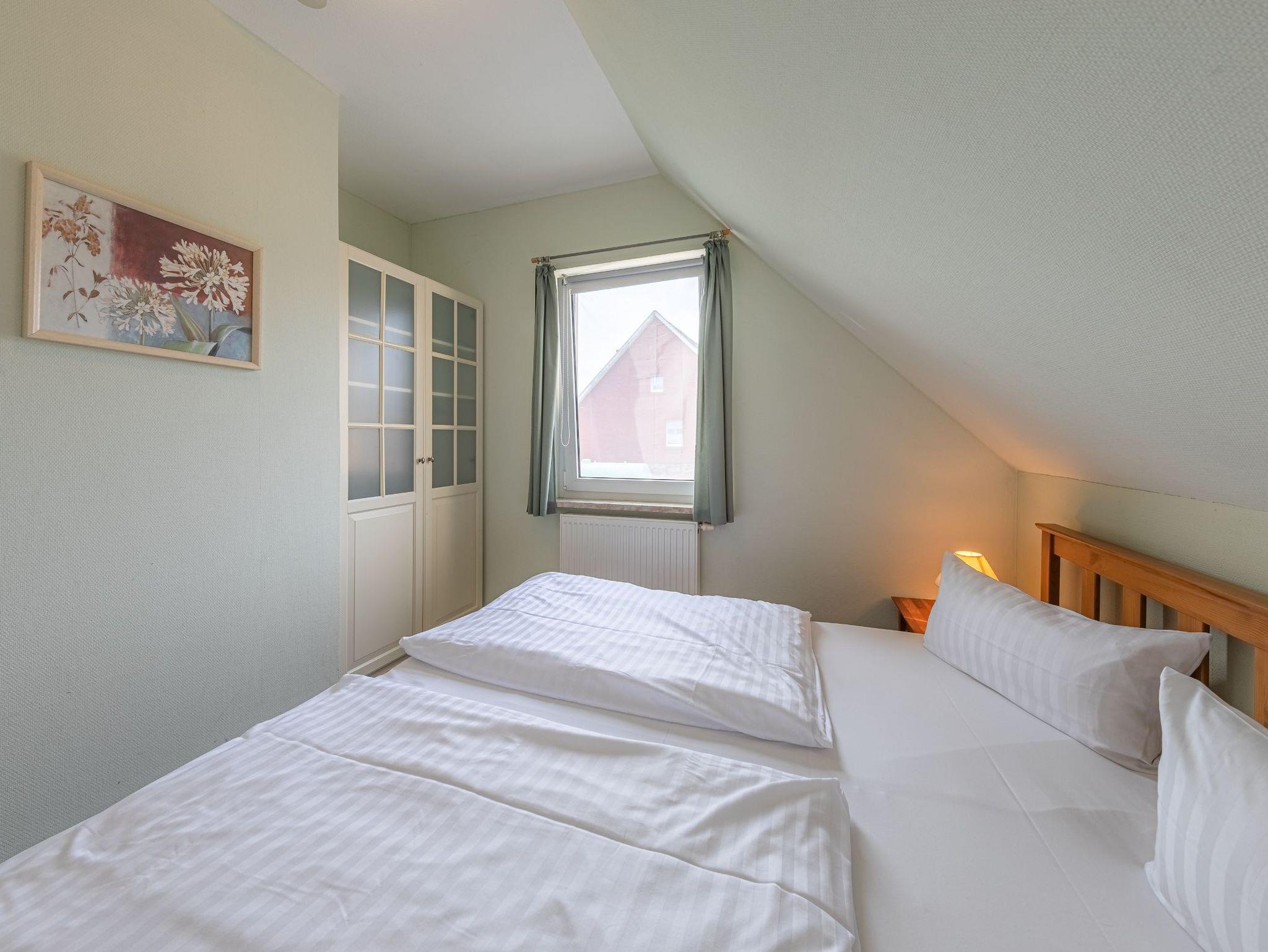 Im Obergeschoss befinden sich drei Schlafzimmer sowie das Bad mit Dusche und WC. Neben einem Zimmer mit Doppelbett sowie einem Zimmer mit einem Etagenbett können die Betten im dritten Raum entweder einzeln oder aber als Doppelbett gestellt werden. So bietet das Ferienhaus Kornblume an der Müritz Platz für 6 Personen.