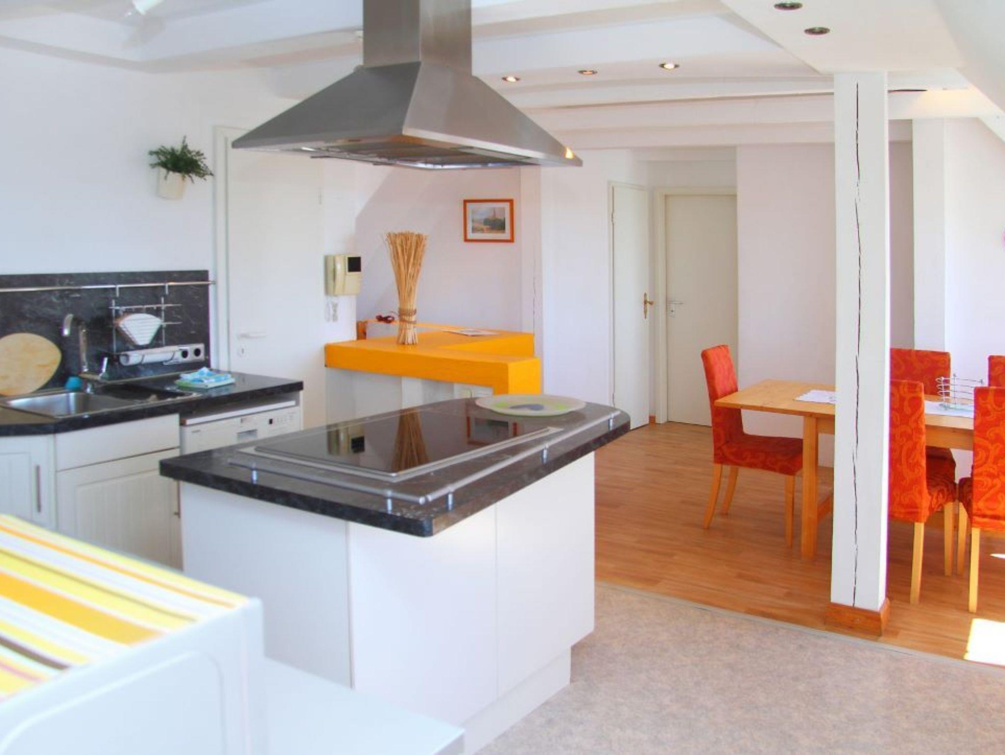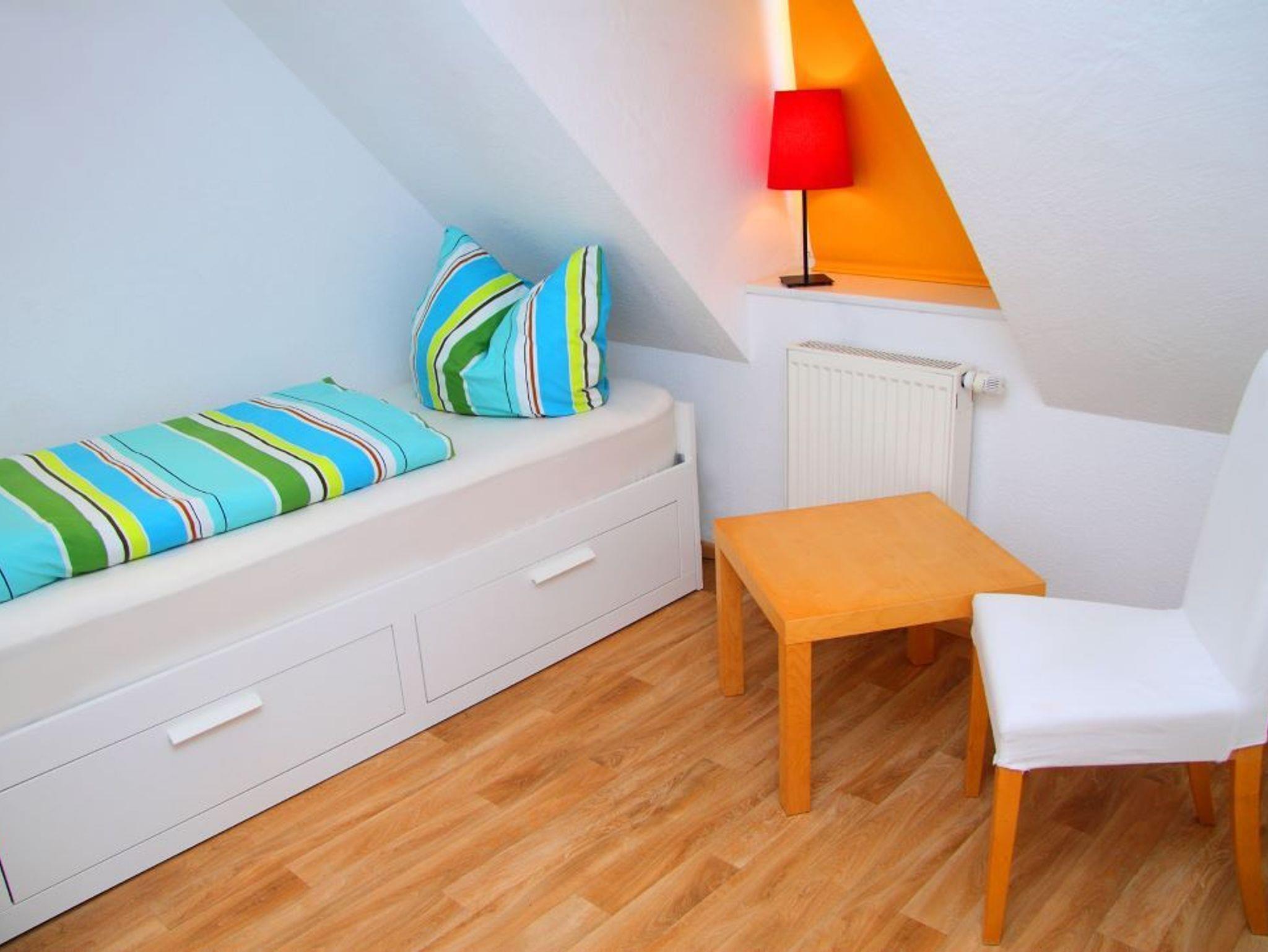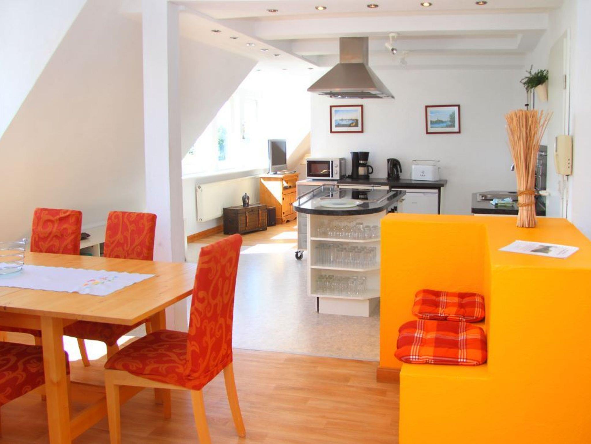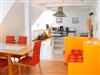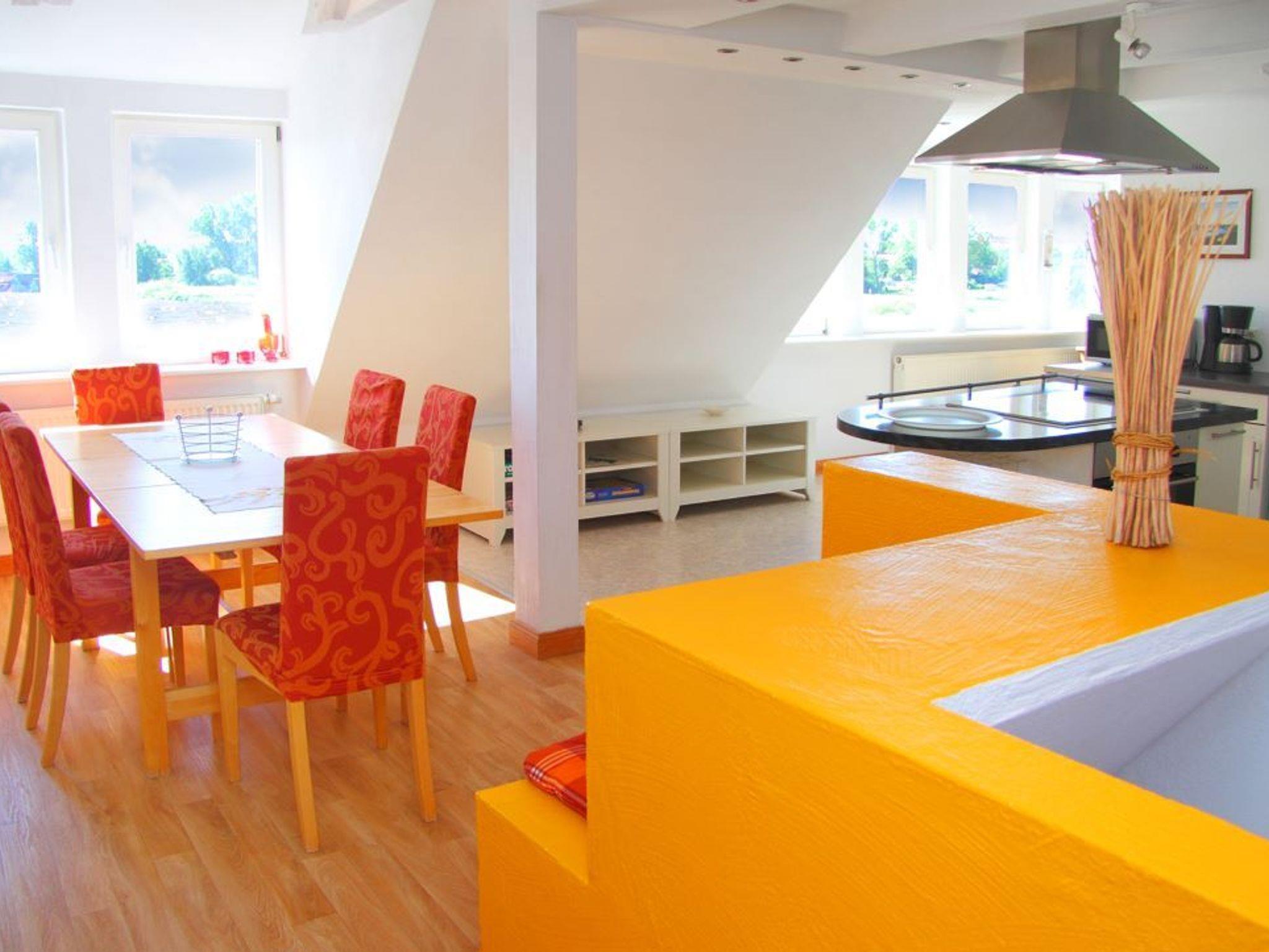 Unsere größte Ferienwohnung erstreckt sich über das gesamte Dachgeschoß. Zwei lange Fensterfronten zur Seeseite lassen viel Licht hinein und bieten einen traumhaften Blick auf die Wasserlandschaft der Müritz um Röbel. In drei Schlafzimmern (2x Doppelbetten, 1x Einzelbett, ) befinden sich insgesamt 5 Betten. Die Schlafräume und das geräumige Bad mit Badewanne und WC gruppieren sich um einen offenen Wohn-/Essbereich mit SAT-TV, Stereoanlage, vollausgestatteter Küche und großem Esstisch.