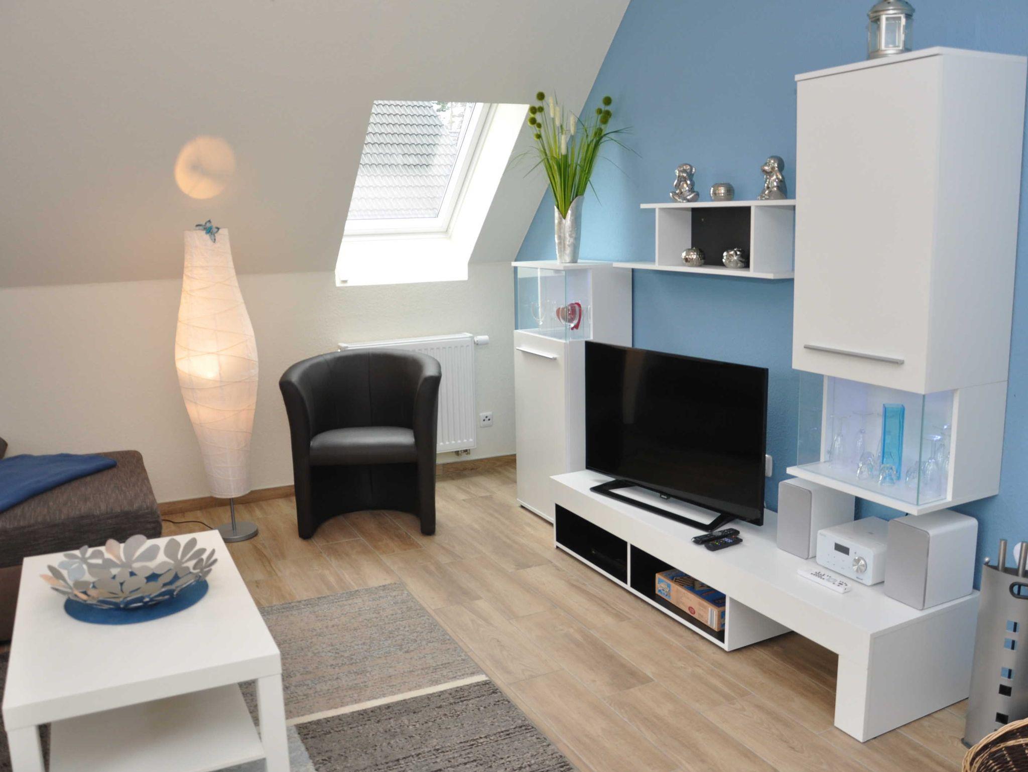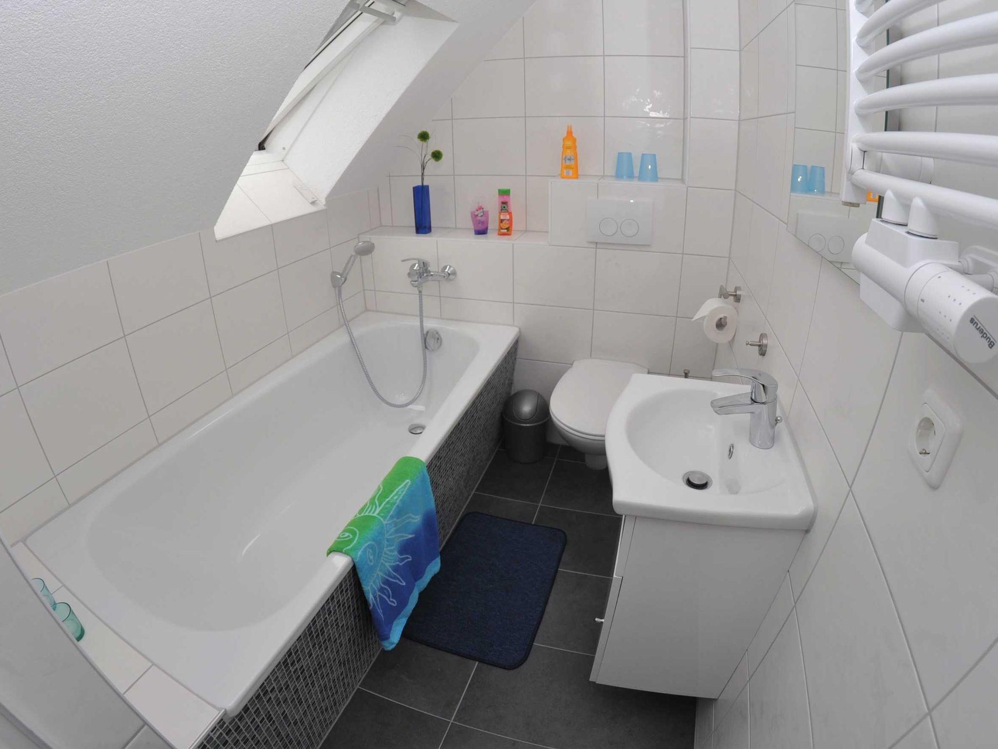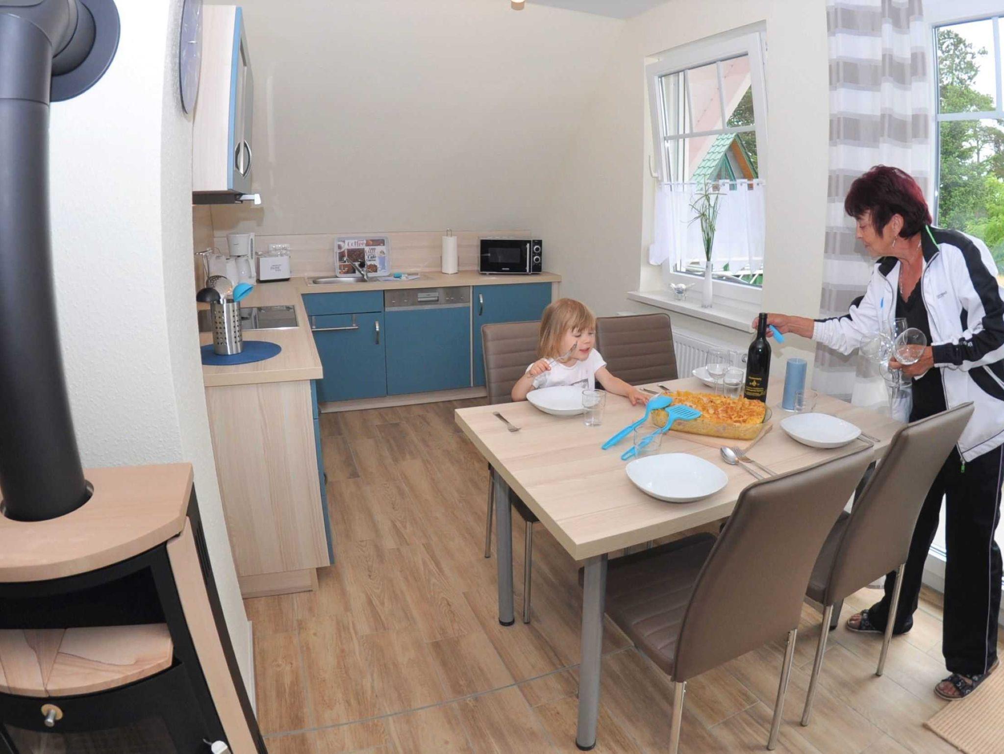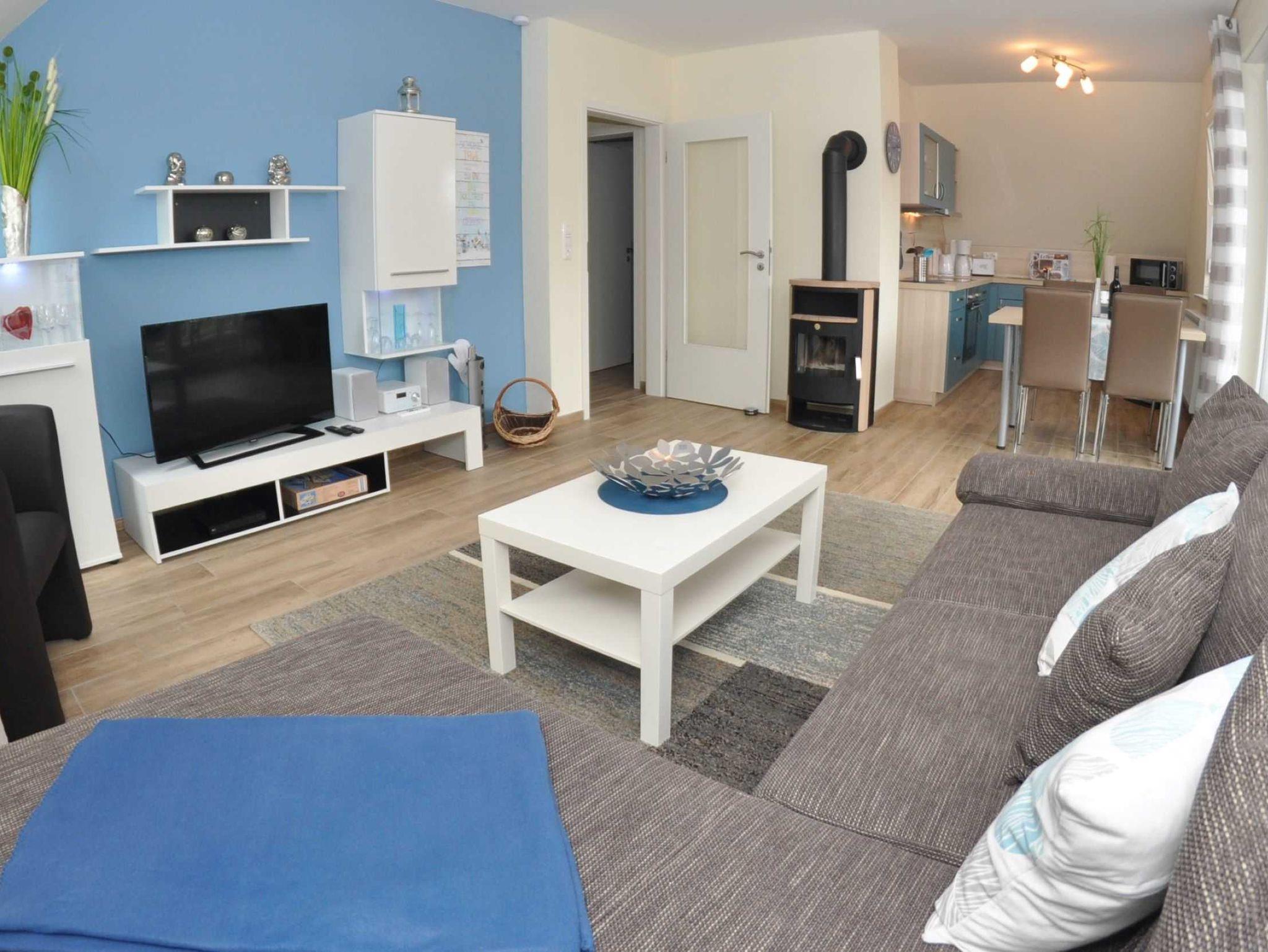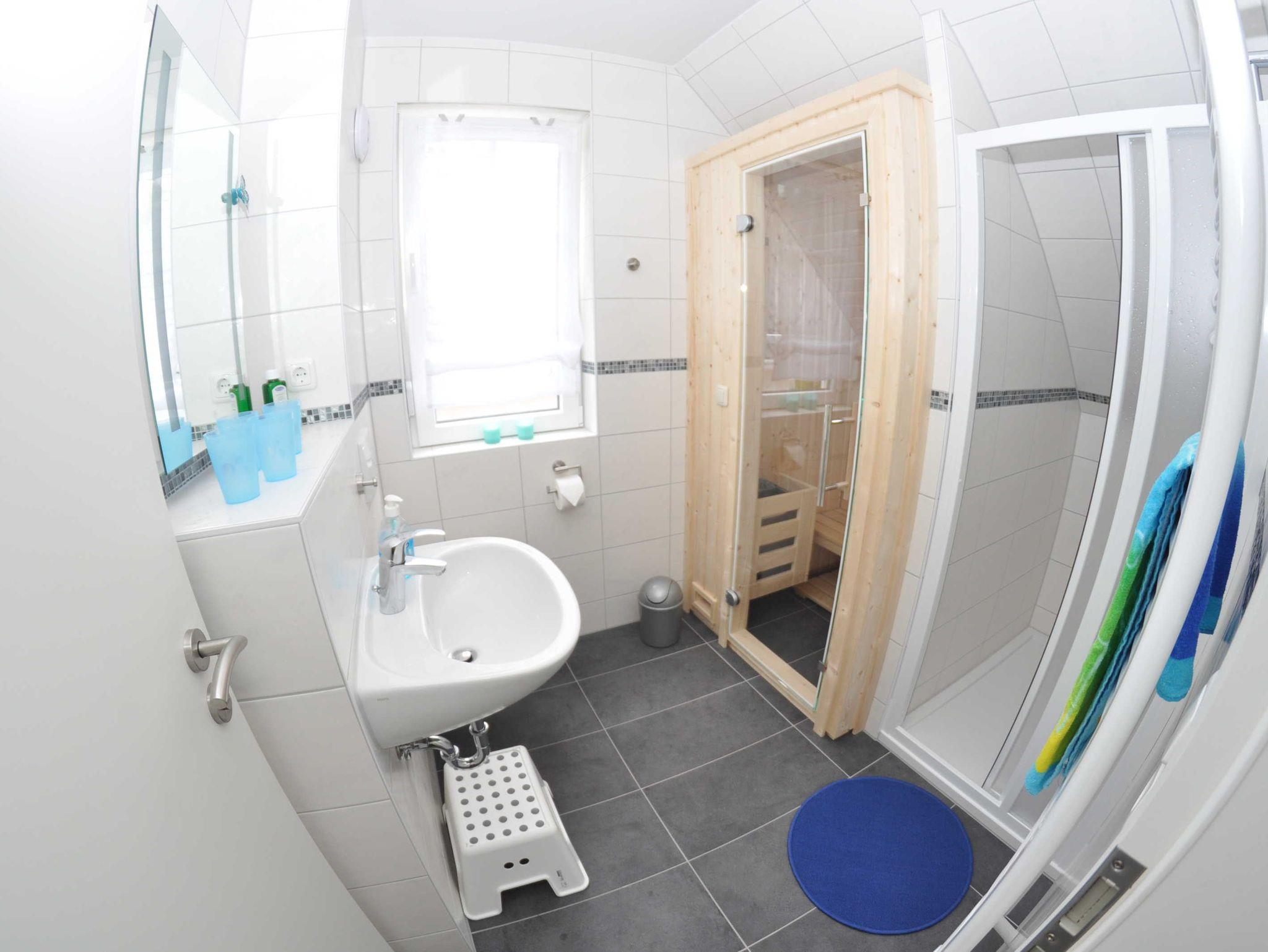 Eine Aufbettungsmöglichkeit besteht im Wohnzimmer. Die Couch verfügt über eine Schlaffunktion. Darüber hinaus verfügt das EG-Appartement im Hauptbad über Hauptbad über eine Dusche eine Infrarot-Sauna und ein 2 Duschbad mit WC, Kamin, kostenfreien WLAN, Wohn- /Essbereich mit vollwertiger Einbauküche mit Spülmaschine, Kühl-/Gefrierfunktion, Ceranherd und Mikrowelle stehen ebenfalls zur Verfügung.