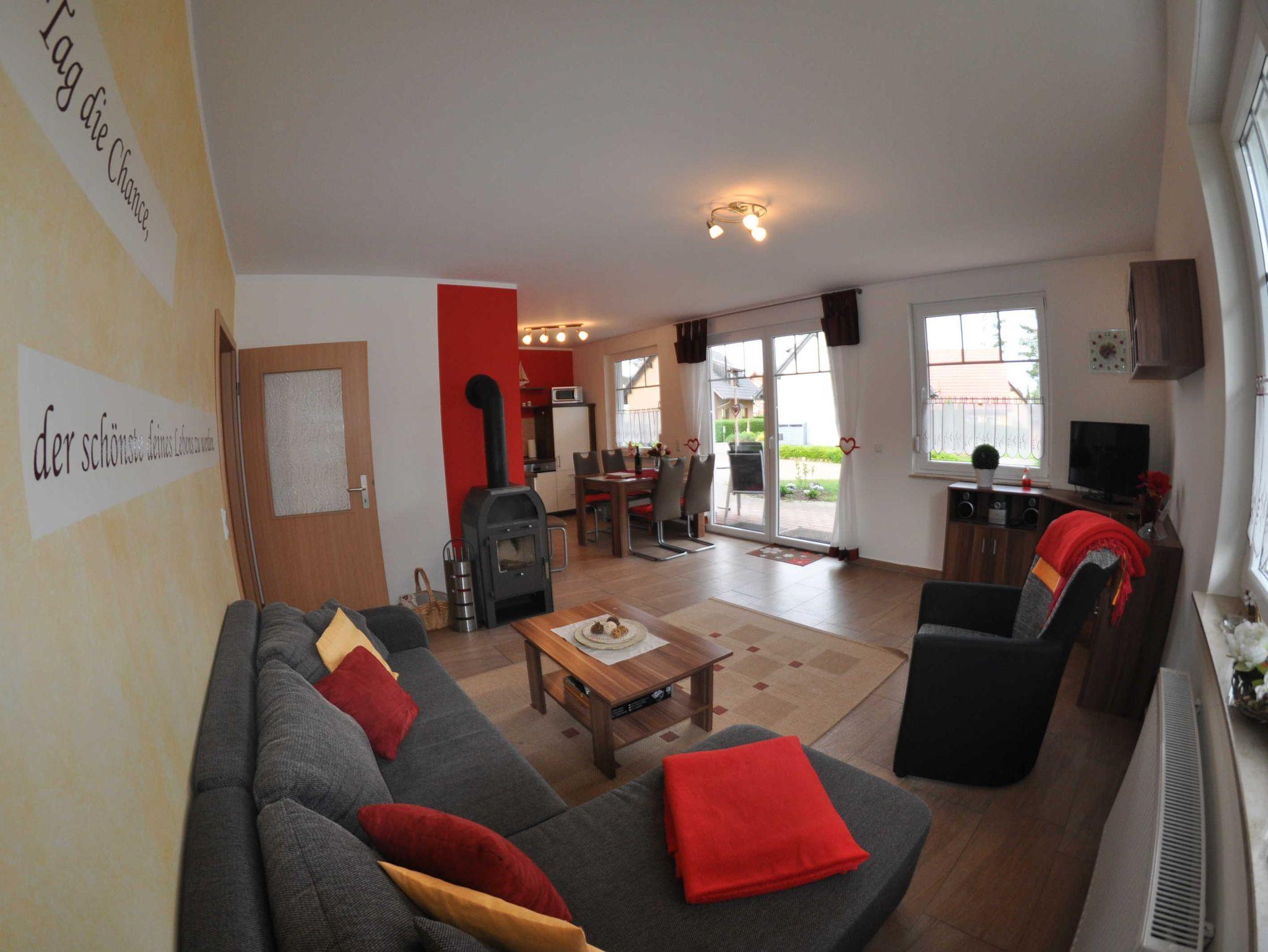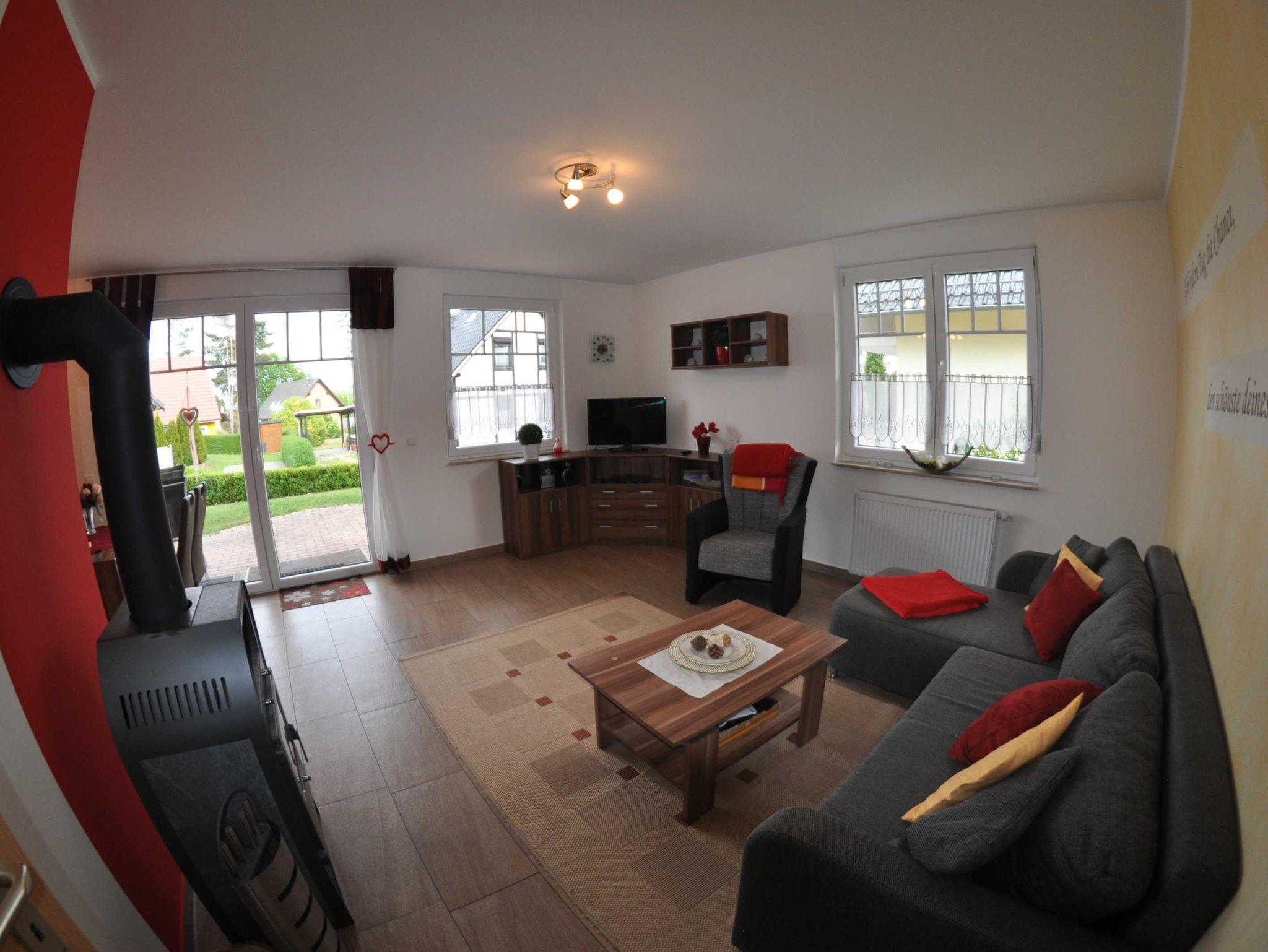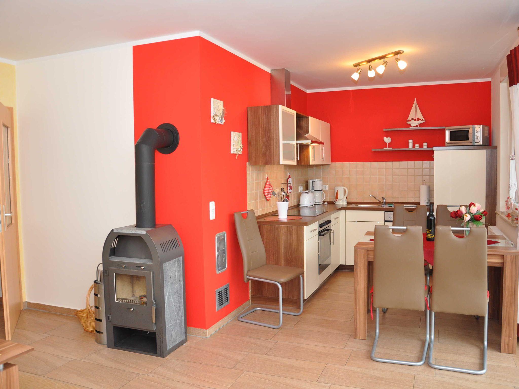 Eine Aufbettungsmöglichkeit besteht im Wohnzimmer. Die Couch verfügt über eine Schlaffunktion. Darüber hinaus verfügt das EG-Appartement über 1 Bad mit Dusche sowie einer Infrarot-Sauna und Kamin, kostenfreien WLAN, Wohn- /Essbereich mit vollwertiger Einbauküche mit Spülmaschine, Kühl-/Gefrierfunktion, Ceranherd und Mikrowelle stehen ebenfalls zur Verfügung.