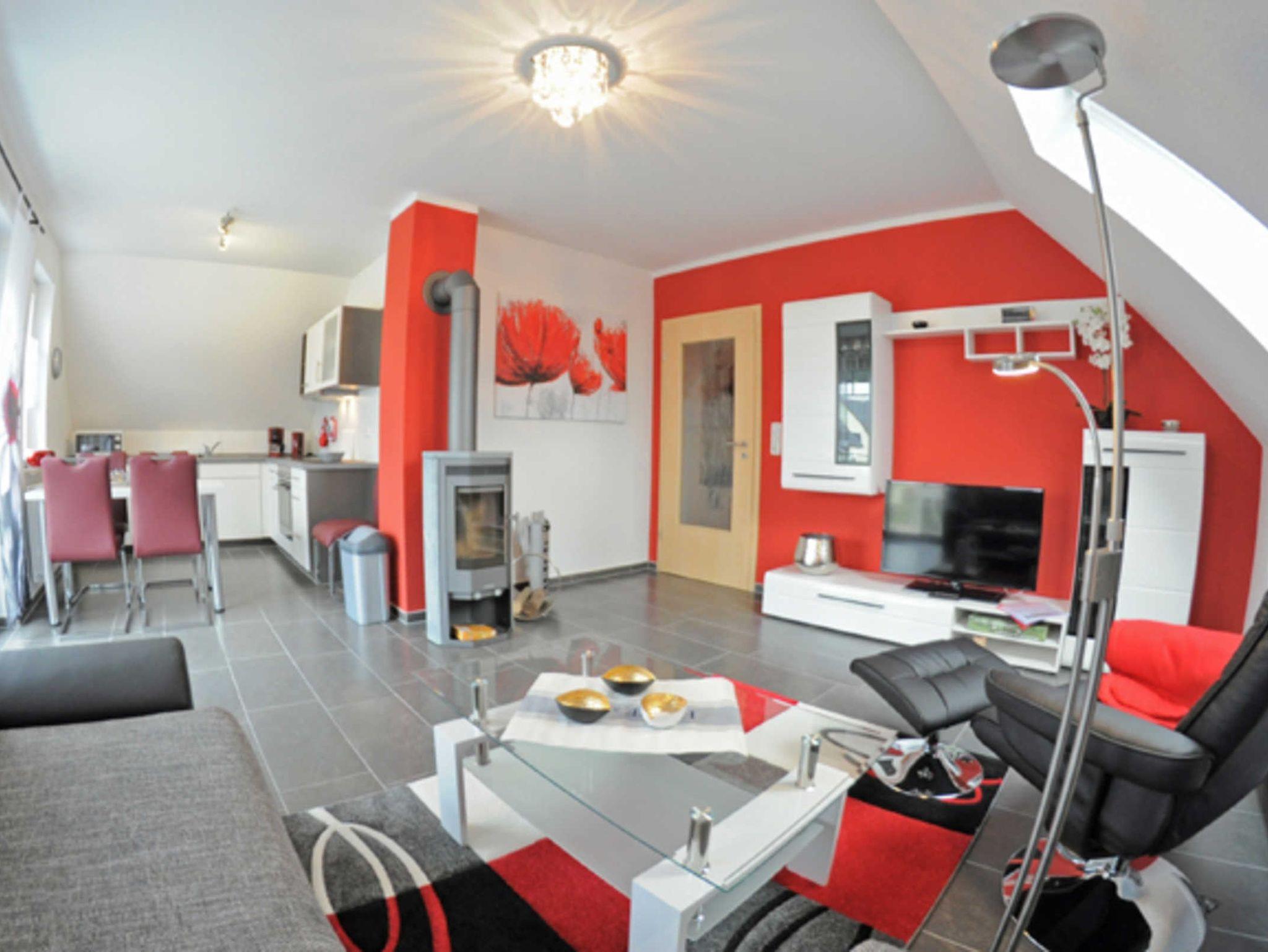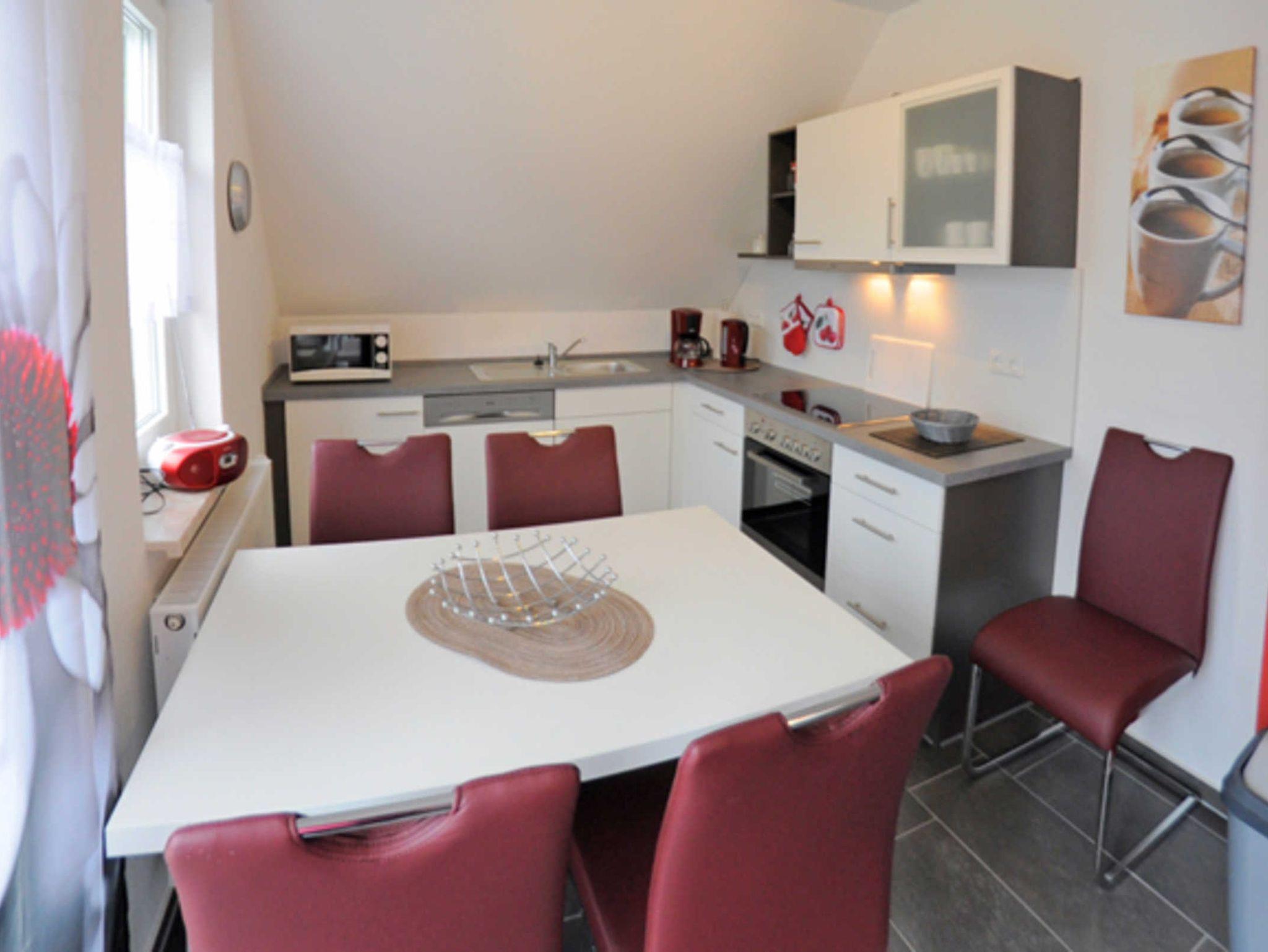 Eine Aufbettungsmöglichkeit besteht im Wohnzimmer. Die Couch verfügt über eine Schlaffunktion. Darüber hinaus verfügt das EG-Appartement über 1 Bad mit Dusche sowie Kamin, kostenfreien WLAN, Wohn- /Essbereich mit vollwertiger Einbauküche mit Spülmaschine, Kühl-/Gefrierfunktion, Ceranherd und Mikrowelle steht ebenfalls zur Verfügung.