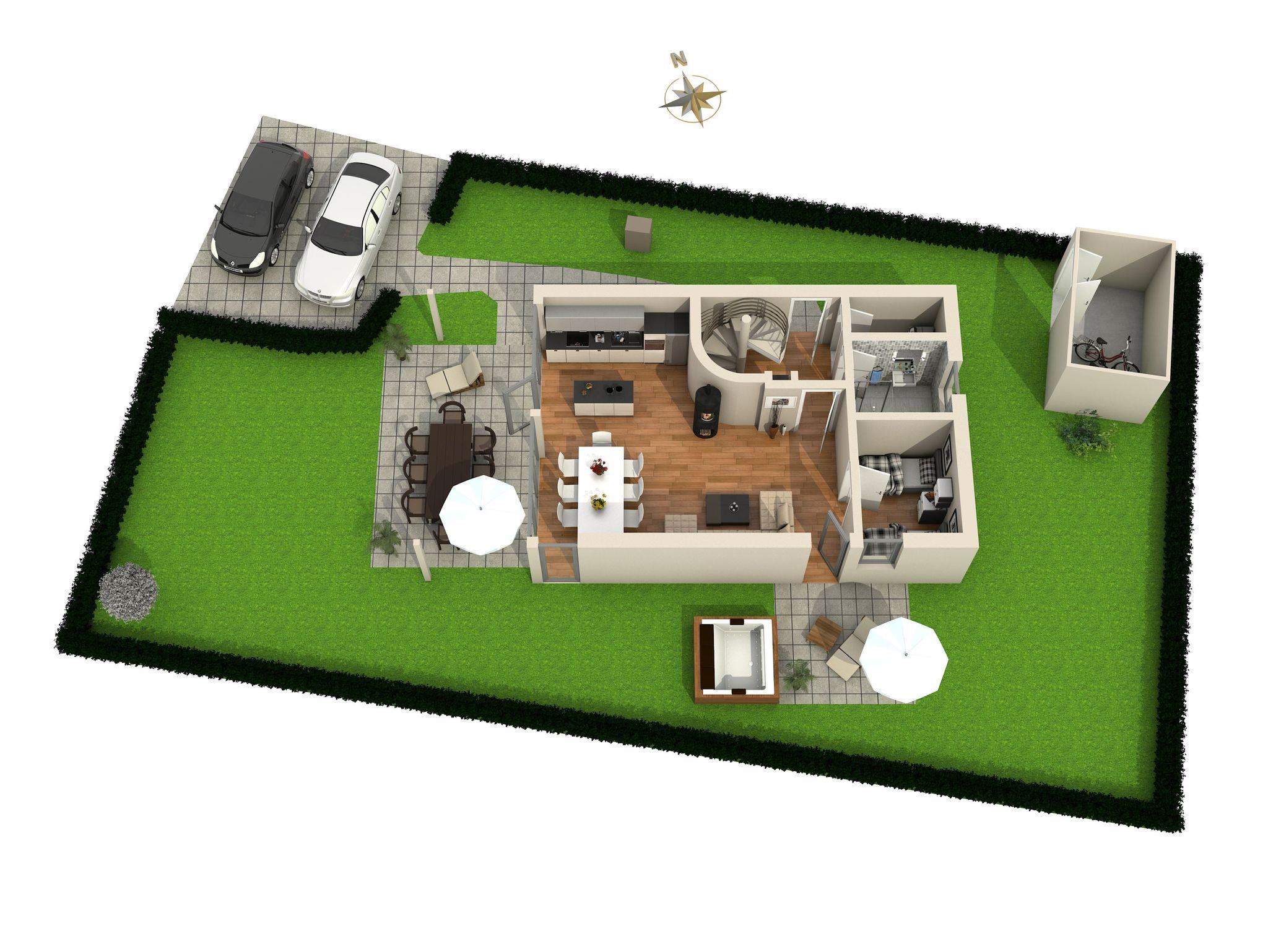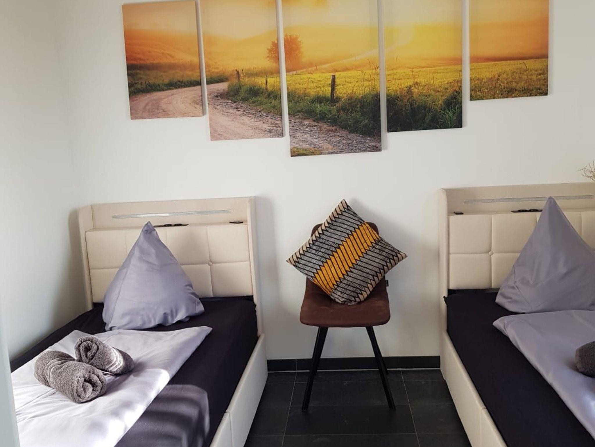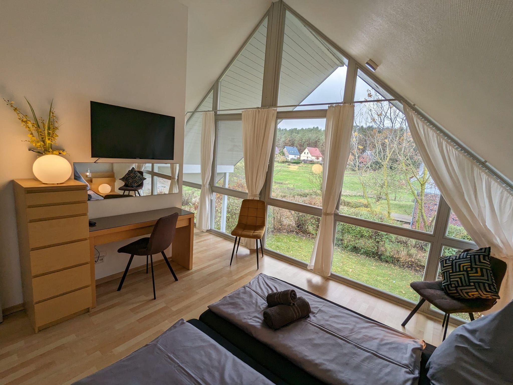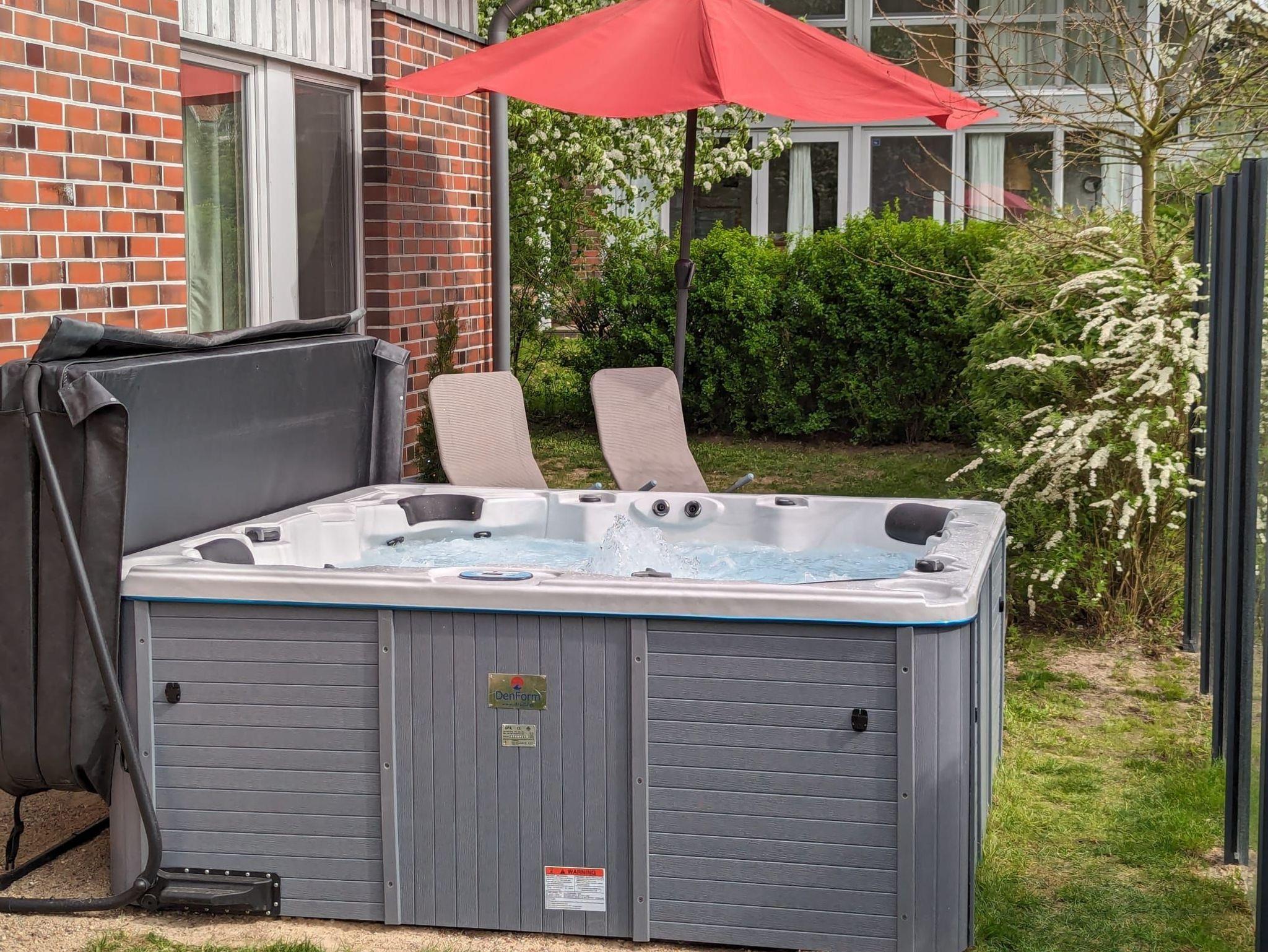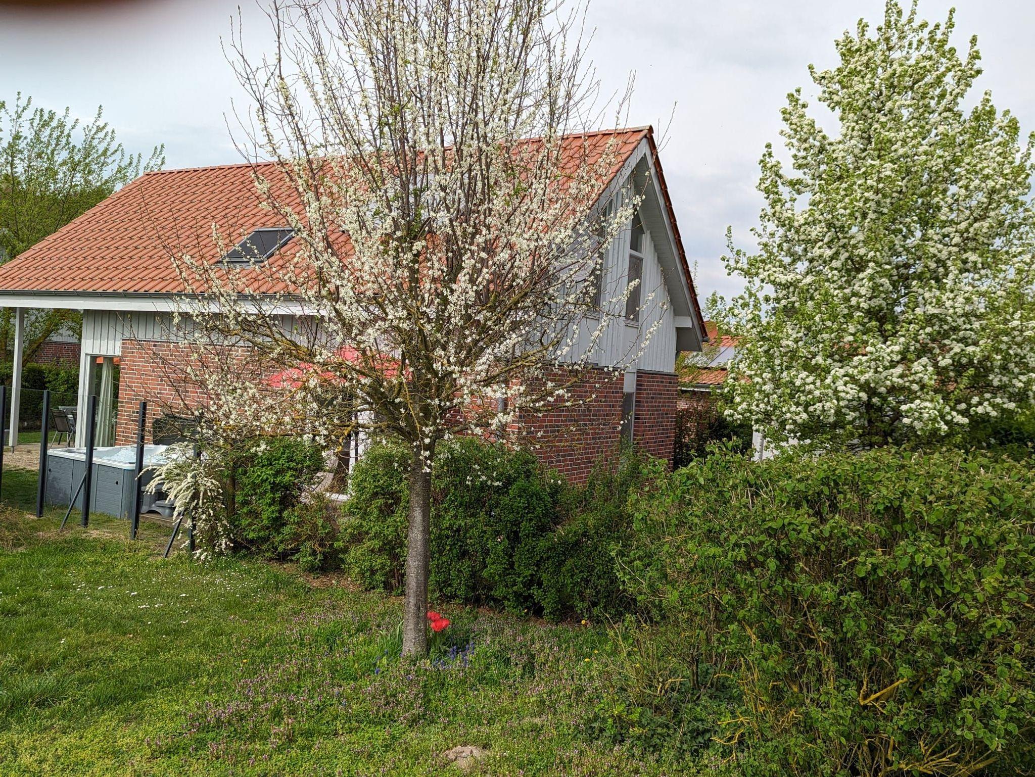 In unserer lichtdurchfluteten Wohlfühloase, 125qm verteilt auf 2 Etagen, erwarten Sie 2 Flure, 4 Schlafzimmer, 2 Bäder, 1 Sauna und ein Abstellraum. Zusätzlich können Sie sich auf den mit Liebe eingerichteten Wohn-/Essbereich mit der offenen Küche freuen. Der offene Wohn-/Essbereich ist unsere lauschige Mitte. Hier kommt jeder auf seine Kosten. Wie wäre es mit ausgiebigem Relaxen auf unserem kuschligen Sofa vor dem mollig-warmen Kamin? Keine Panik, für mehr Action sorgt die digitale Unterhaltung per Smart-TV und WLAN. Das kleine Schlafzimmer im Erdgeschoss verfügt über zwei getrennte Betten und das Badezimmer über eine Dusche. Im Obergeschoss stehen für Sie drei weitere Schlafzimmer mit Kleiderschränken und Nachttischen bereit. Im zweiten Badezimmer befinden sich eine Dusche und die gemütliche Sauna. Wenn Sie nach draußen in den kleinen Garten treten, dann atmen Sie einmal tief durch und erfreuen sich dann an den beiden Terrassen, wo Sie mit 8 Personen entspannt speisen können oder einfach nur relaxen dürfen. Übrigens, als besonderes Highlight temperieren wir ganzjährig für Sie unseren Outdoor-Whirpool auf 35 Grad Wassertemperatur. Ihre Fahrräder können Sie gern im eigenen Schuppen unterstellen. Zwei PKW-Stellplätze stehen für Sie ebenfalls kostenlos direkt vor der Haustür zur Verfügung.