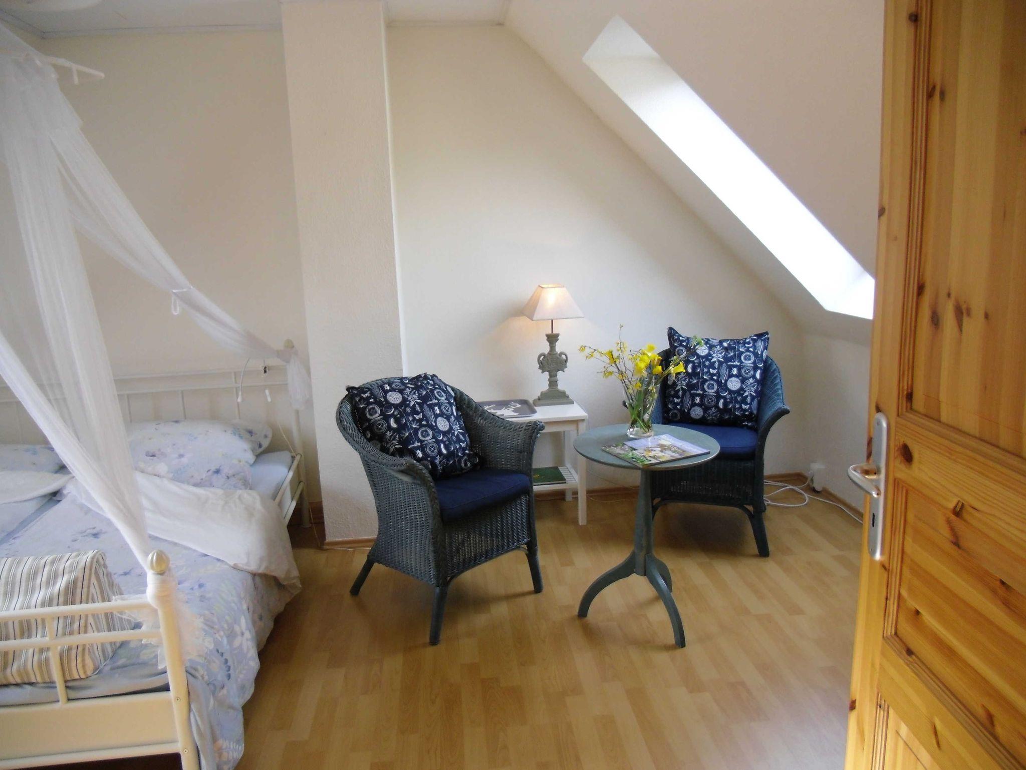 Das frisch sanierte Häuschen mit weißen Stuckrahmen liegt direkt gegenüber dem Angel- und Zoogeschäft. Im Erdgeschoß befindet sich eine komfortable Einbauküche im Landhausstil mit Esstisch. Ebenfalls im Erdgeschoss ist das geräumige Bad mit Badewanne. Über den durchgehenden Flur erreichen Sie den Innenhof. Die originale und bequeme Holztreppe führt ins Dachgeschoss. Dort liegt das Wohn- und Schlafzimmer mit Doppelbett und Fernseh-/Leseecke. Über den kleinen Innenhof erreichen Sie das ,, Siestazimmer im umgebauten Stall mit Einzelbett.