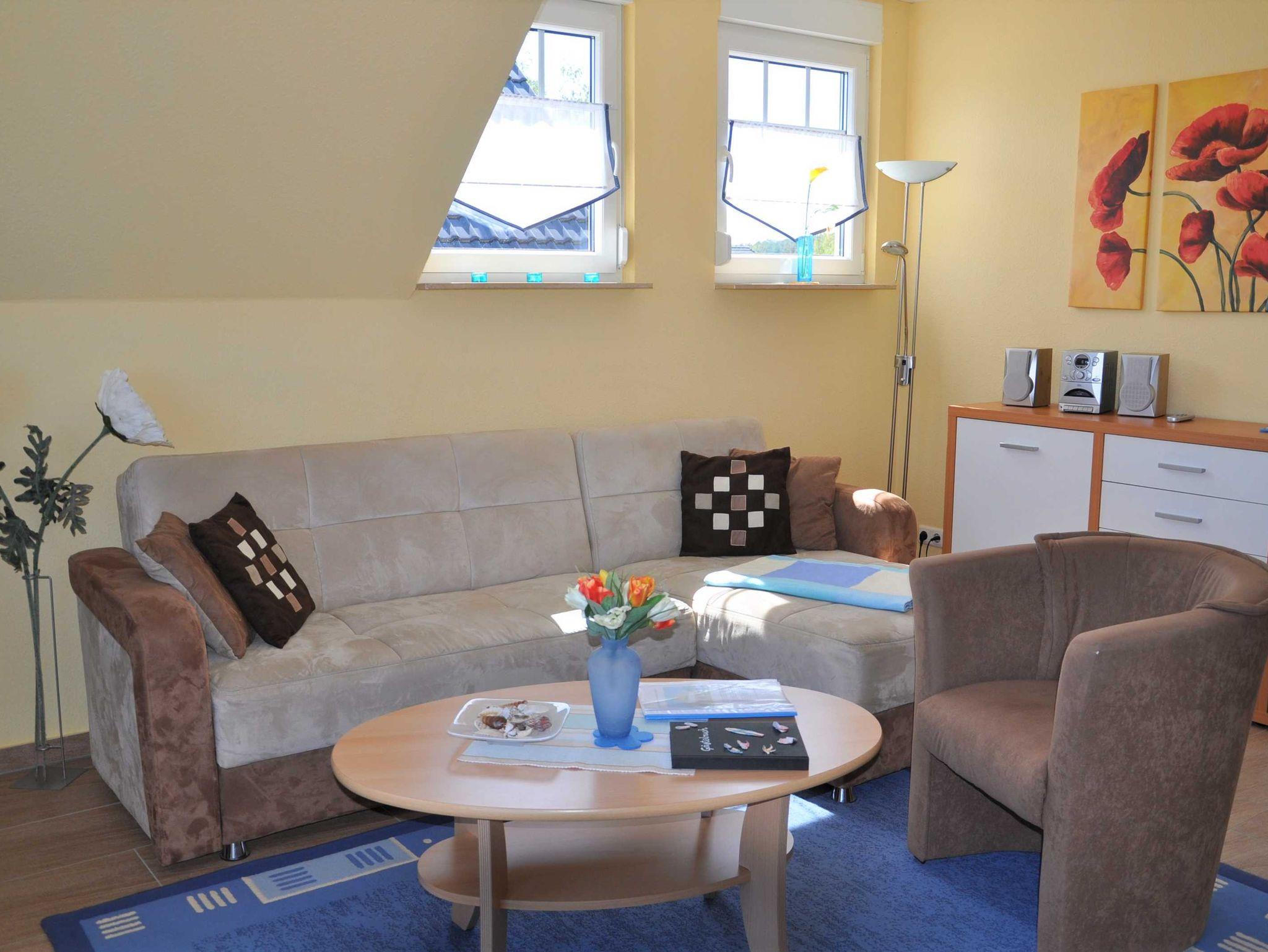Eine Aufbettungsmöglichkeit besteht im Wohnzimmer. Die Couch verfügt über eine Schlaffunktion. Darüber hinaus verfügt das EG-Appartement über 1 Bad mit Dusche sowie einer Infrarot-Sauna und Kamin, kostenfreien WLAN, Wohn- /Essbereich mit vollwertiger Einbauküche mit Spülmaschine, Kühl-/Gefrierfunktion, Ceranherd und Mikrowelle stehen ebenfalls zur Verfügung.