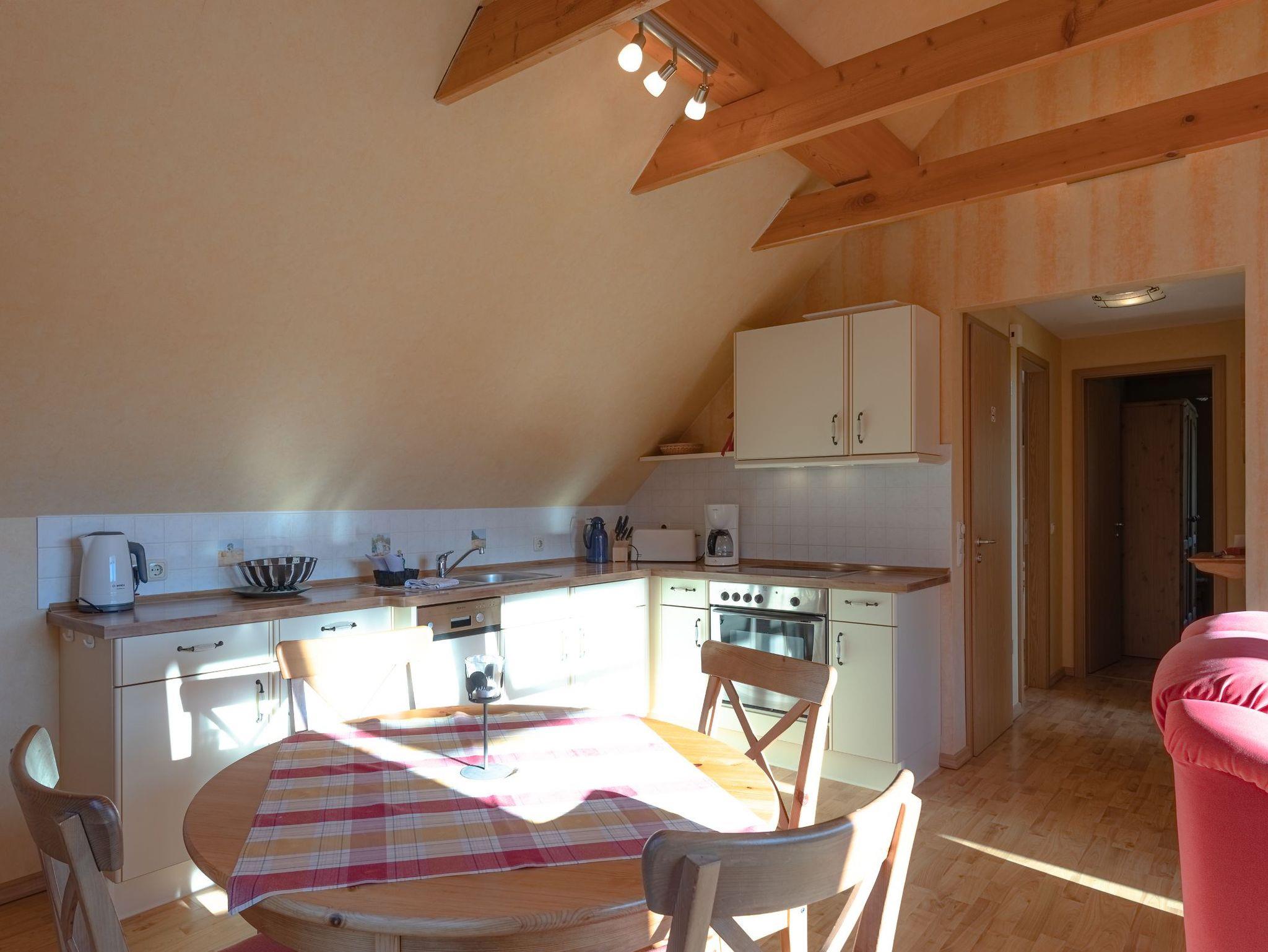 Die moderne Einbauküche ist mit Cerankochfeld, Backofen, Geschirrspüler sowie einem Kühlschrank mit Gefrierfach ausgestattet. Außerdem finden Sie alle notwendigen Küchengeräte wie Toaster, Kaffeemaschine und Wasserkocher. Geschirr und Besteck sind in ausreichender Anzahl vorhanden.