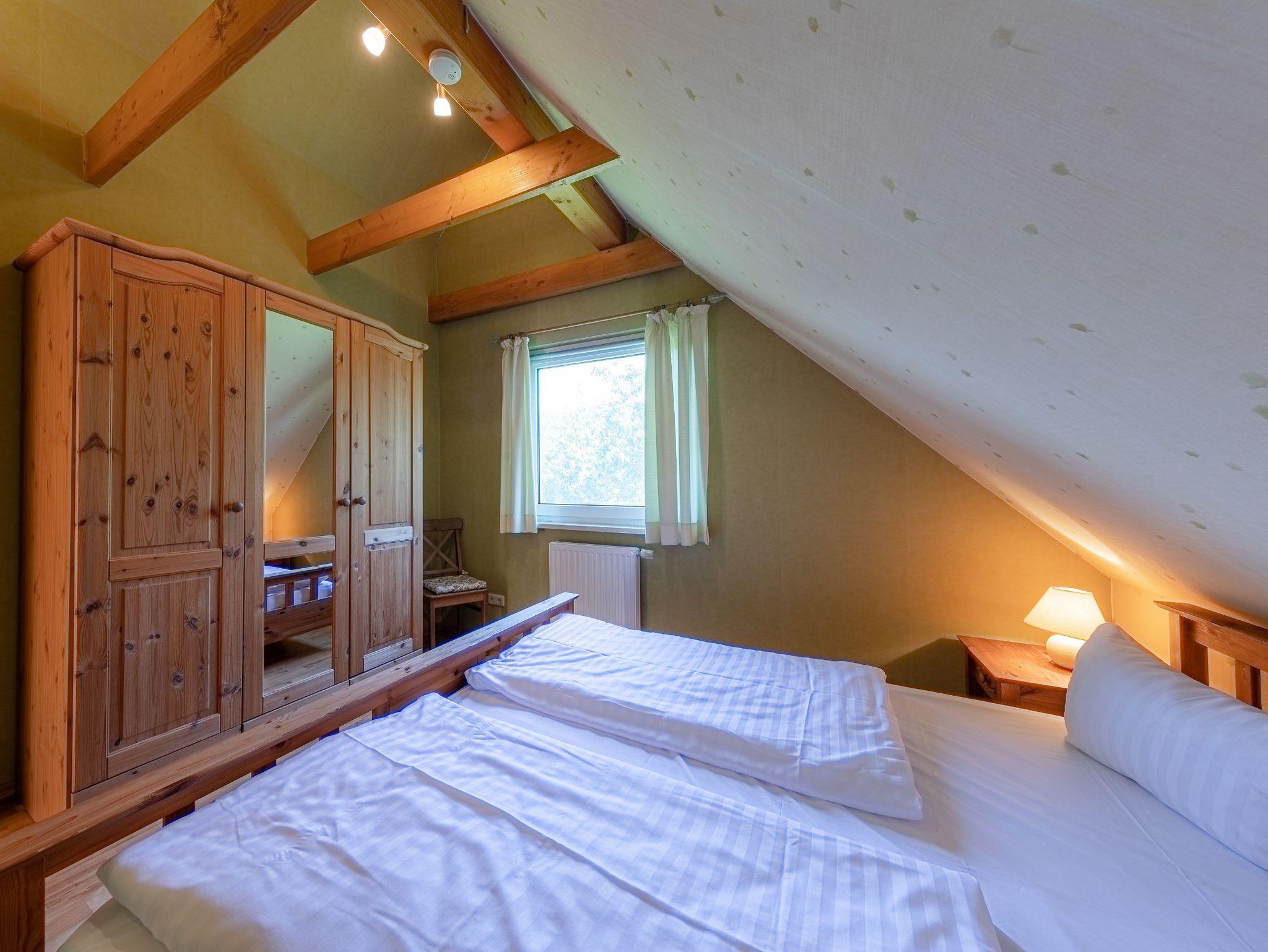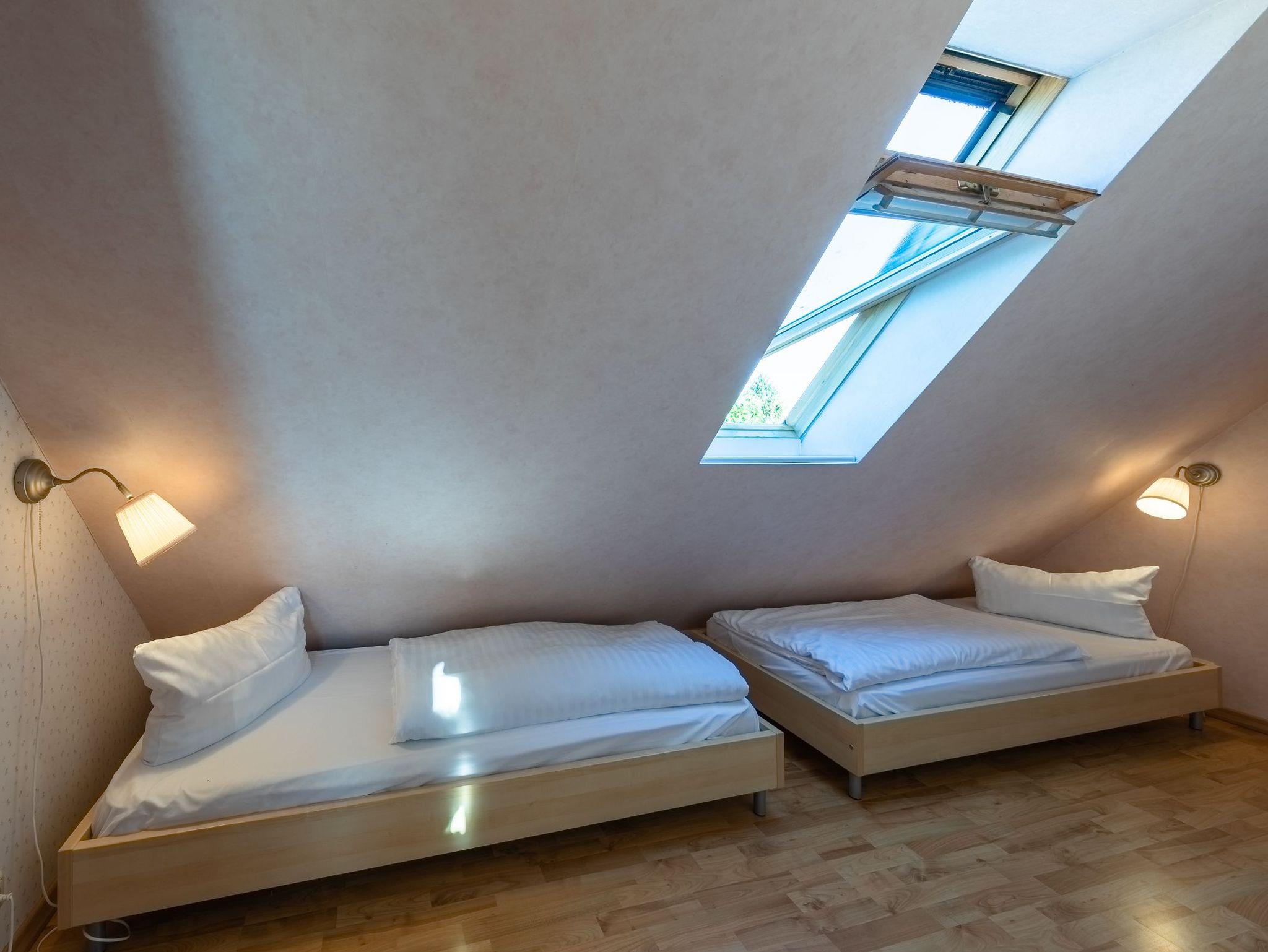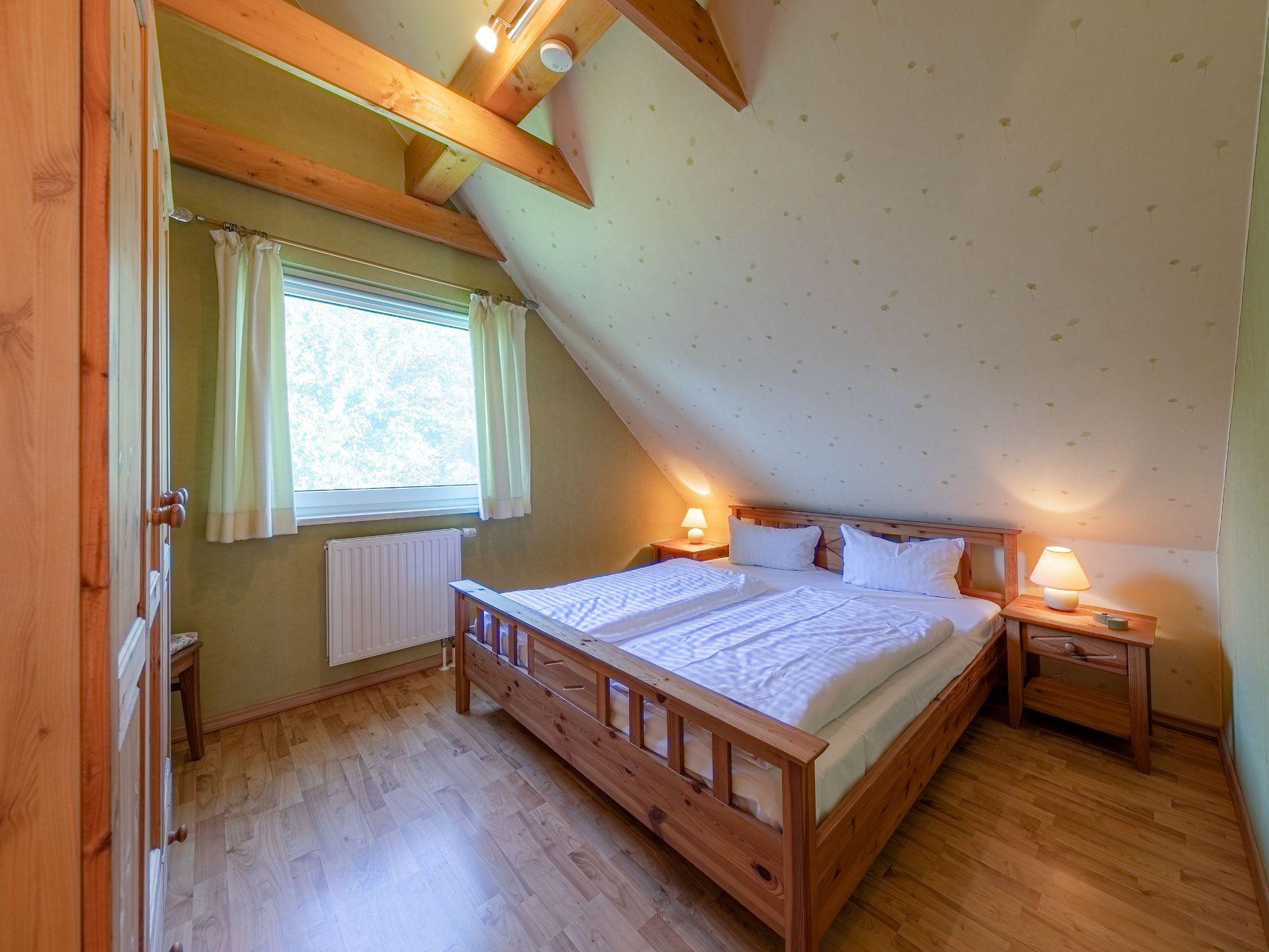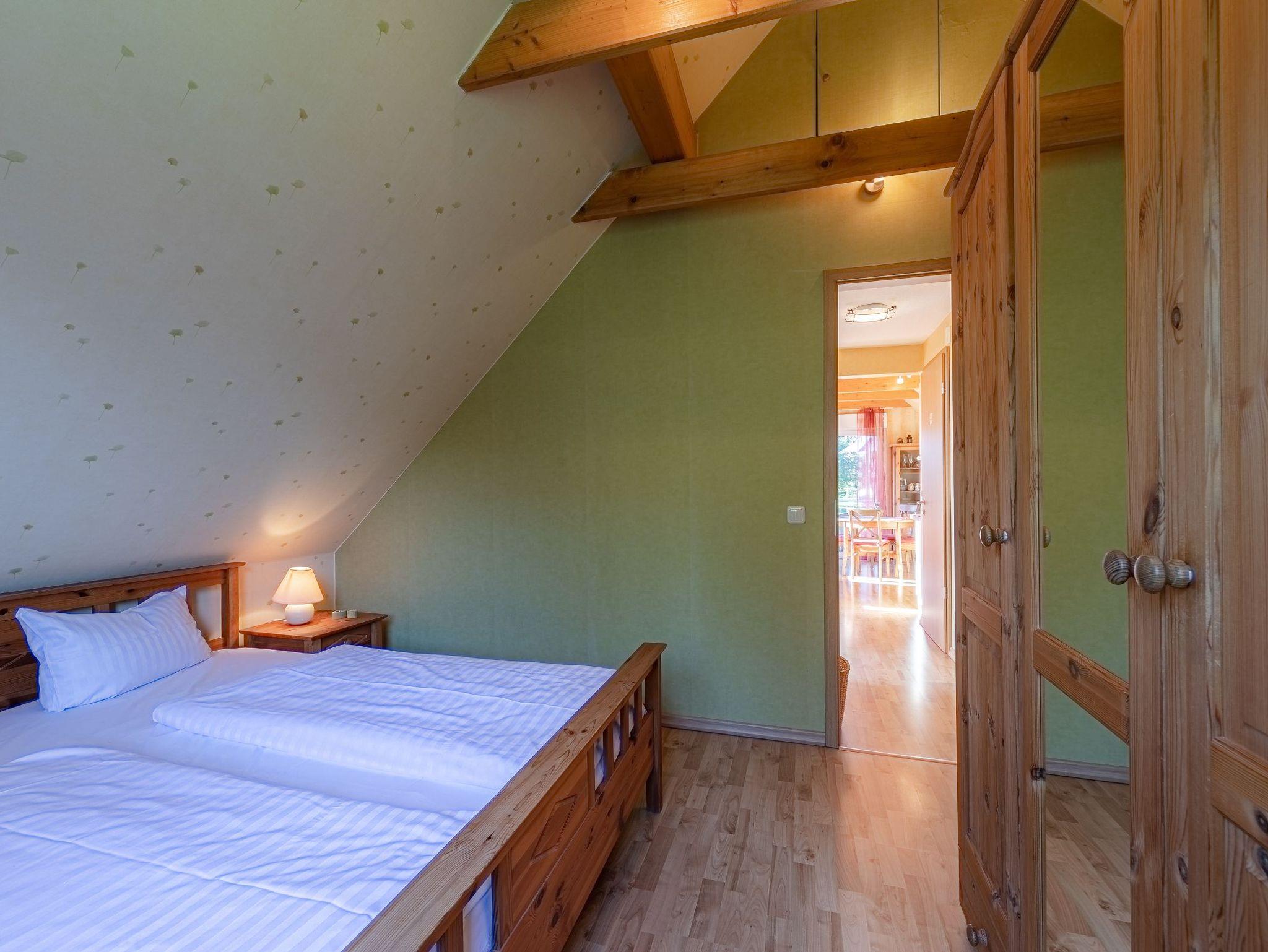 Die Wohnung hat zwei Schlafzimmer, eines mit Doppelbett, das andere mit zwei Einzelbetten. Der offene Wohnraum hat wie einer der Schlafräume durch die Studiobauweise eine Raumhöhe von drei Metern. Ein Fernseher mit SAT-Empfang, ein Radio mit CD-Spieler sowie Bücher, Spiele und Spielsachen stehen bereit. Alle Räume sind mit Laminat ausgelegt. Im Winter können Sie in der Müritz Ferienwohnung mit 2 Schlafzimmern die gemütliche Wärme einer Fußbodenheizung im Wohn- und Essbereich sowie im Bad genießen.