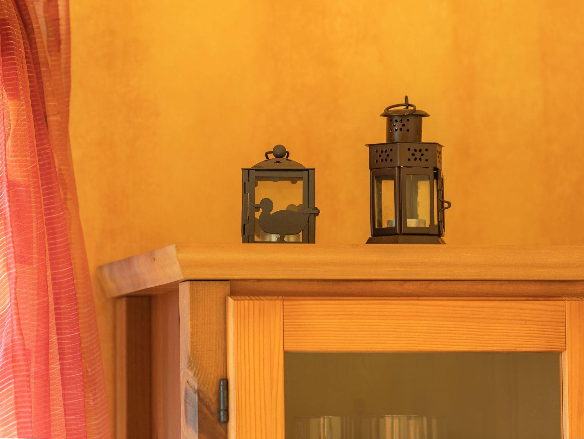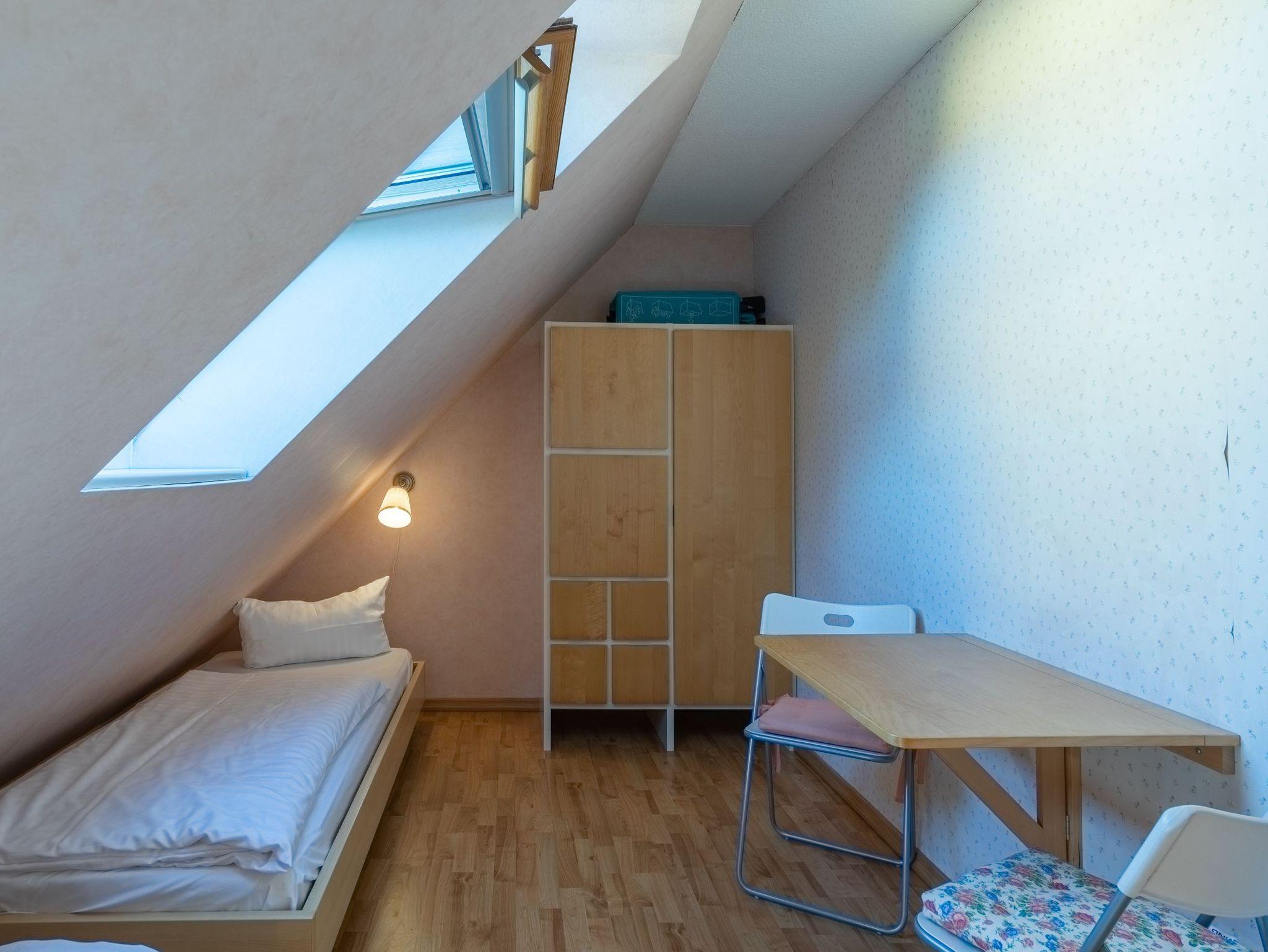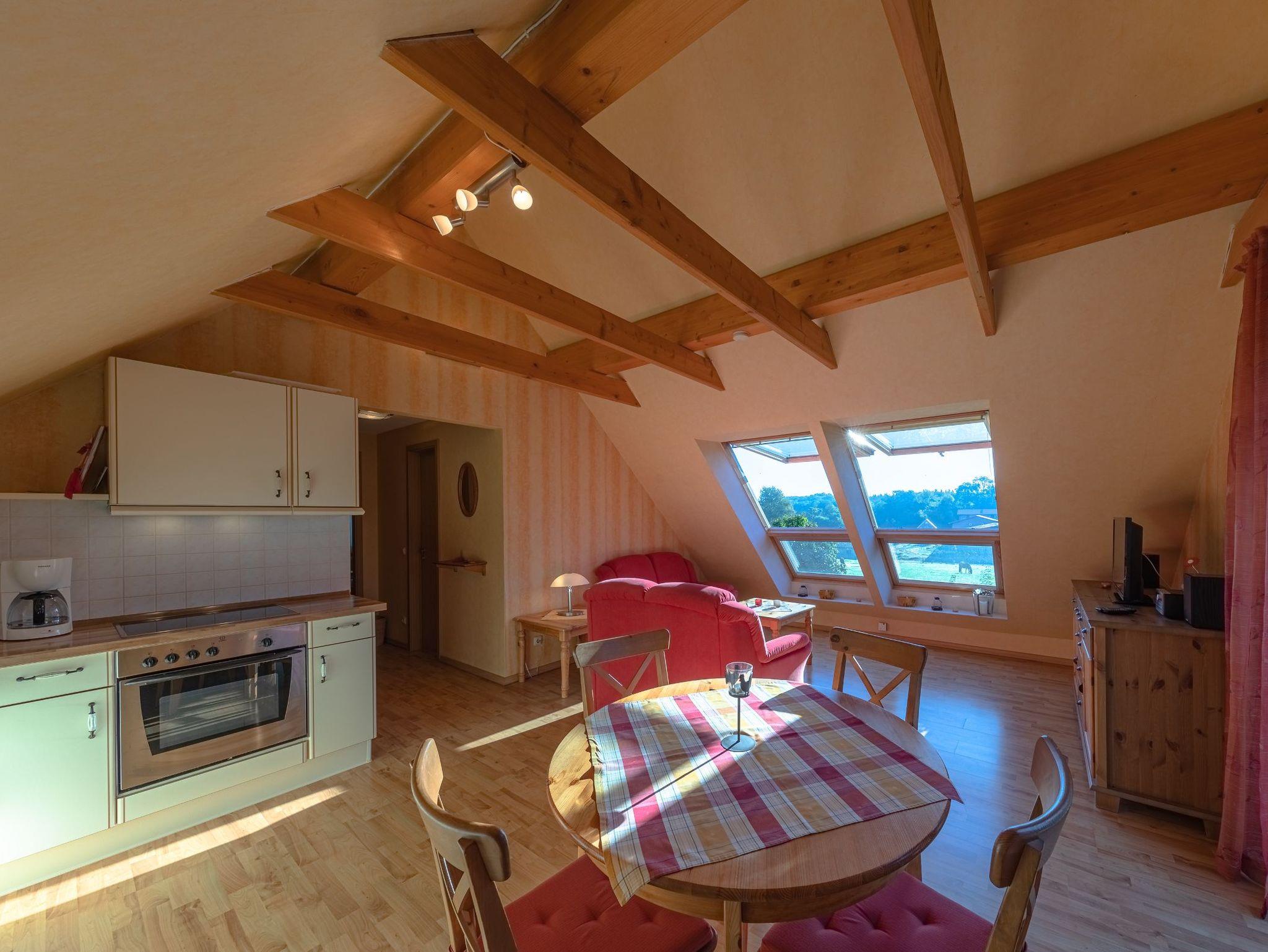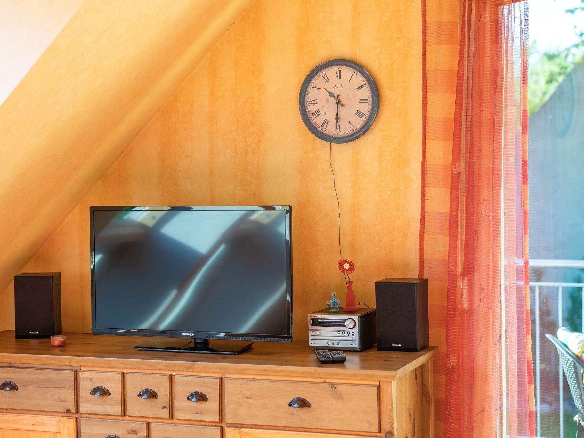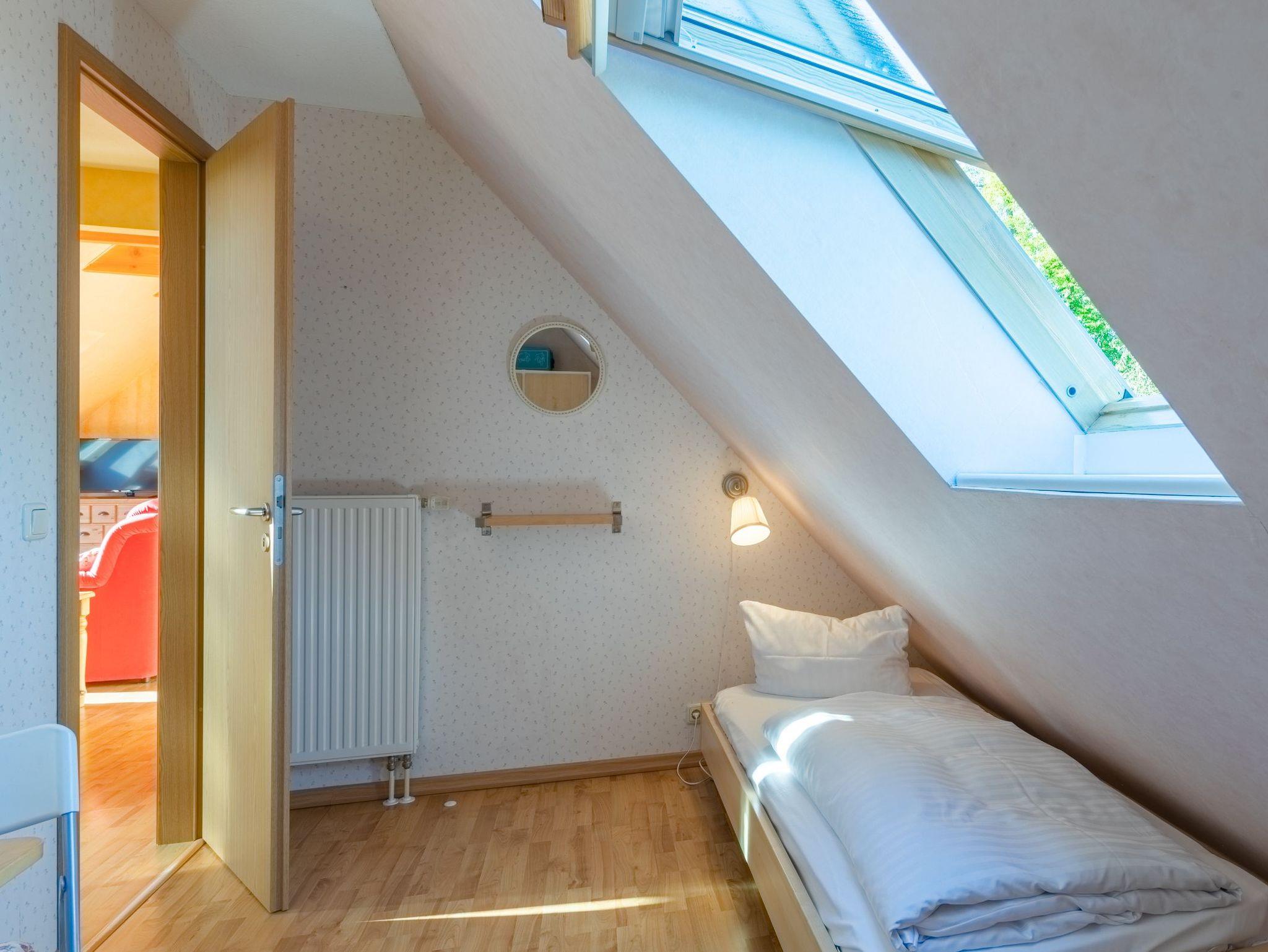 Die Wohnung hat zwei Schlafzimmer, eines mit Doppelbett, das andere mit zwei Einzelbetten. Der offene Wohnraum hat wie einer der Schlafräume durch die Studiobauweise eine Raumhöhe von drei Metern. Ein Fernseher mit SAT-Empfang, ein Radio mit CD-Spieler sowie Bücher, Spiele und Spielsachen stehen bereit. Alle Räume sind mit Laminat ausgelegt. Im Winter können Sie in der Müritz Ferienwohnung mit 2 Schlafzimmern die gemütliche Wärme einer Fußbodenheizung im Wohn- und Essbereich sowie im Bad genießen.