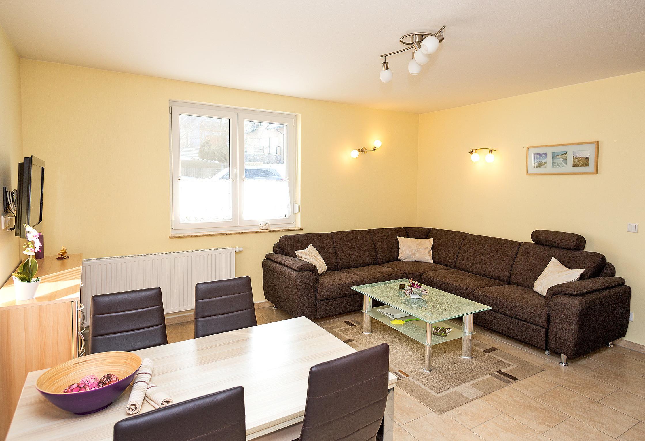 Die Wohnung verfügt über 2 Schlafzimmer (eines mit Doppelbett, ein weiteres mit Etagenbett), Bad mit Dusche und WC. Der Wohnraum mit Essplatz besitzt eine Aufbettungsmöglichkeit auf der Schlafcouch. An kühleren Tagen können Sie gemütliche Stunden am Kaminofen verbringen.