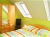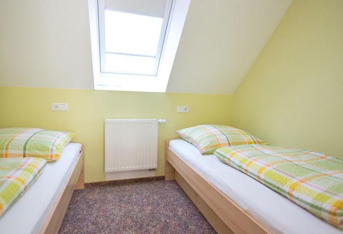 Die Ferienwohnung Dachs im Obergeschoss hat einen separaten Eingang, den Sie über eine Außentreppe erreichen. Die Wohnung verfügt über 2 Schlafzimmer (eines mit Doppelbett, ein weiteres mit zwei Einzelbetten), Bad mit Dusche und WC. Der Wohnraum mit Essplatz lädt ein zu gemütlichen Stunden am Kaminofen.