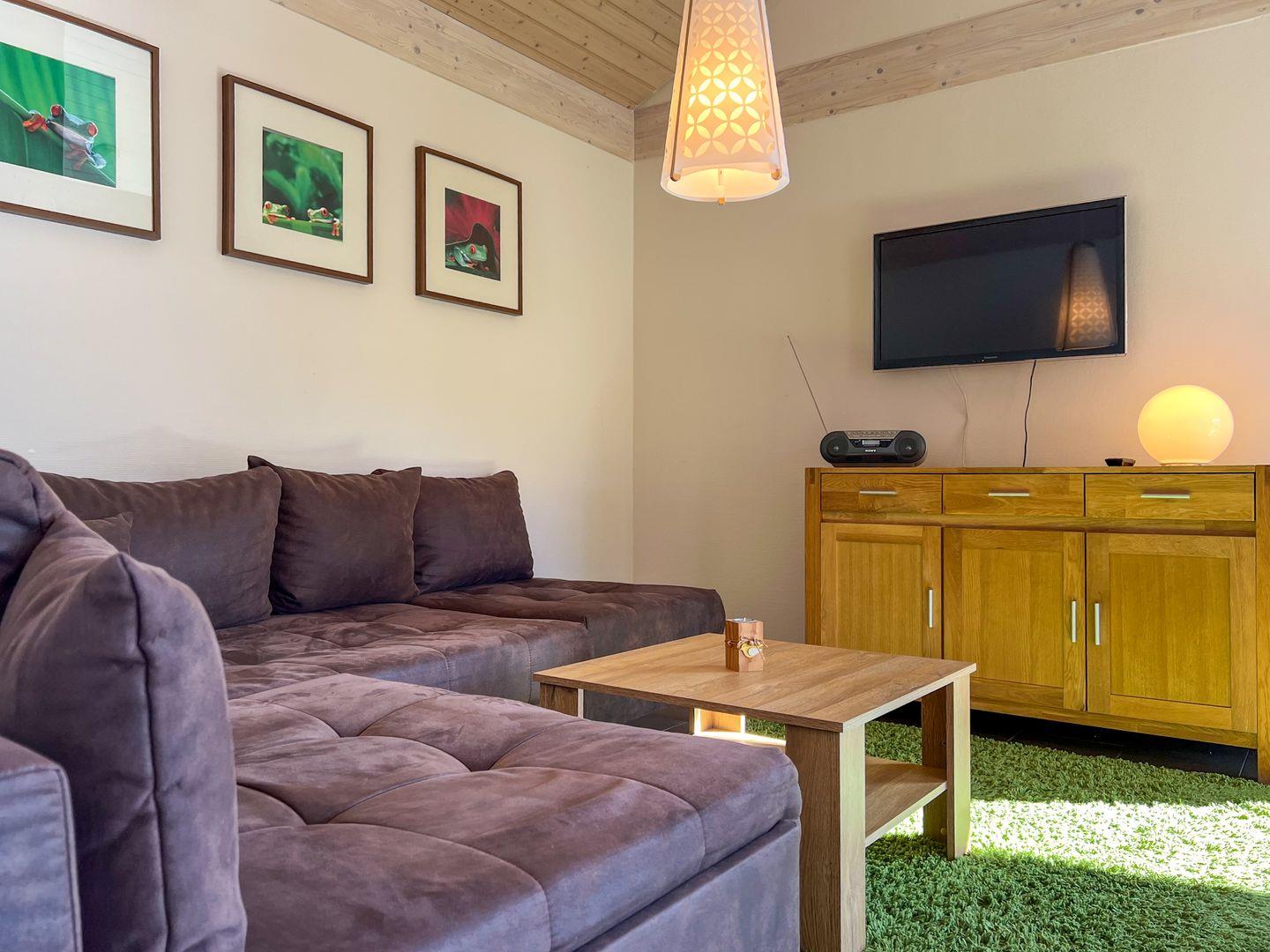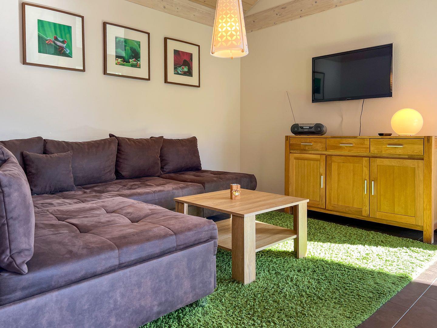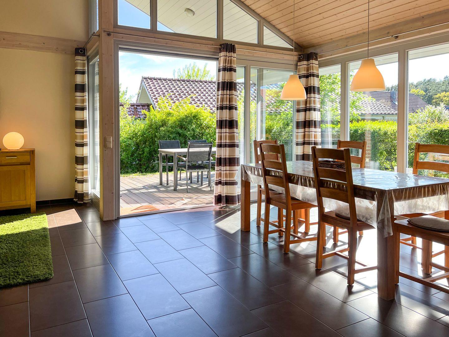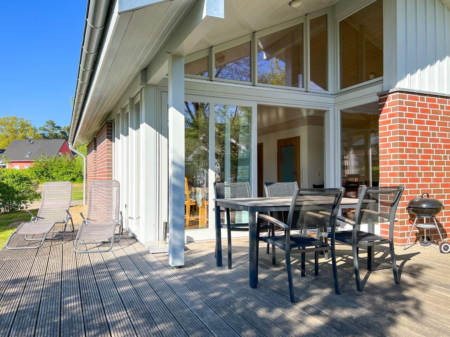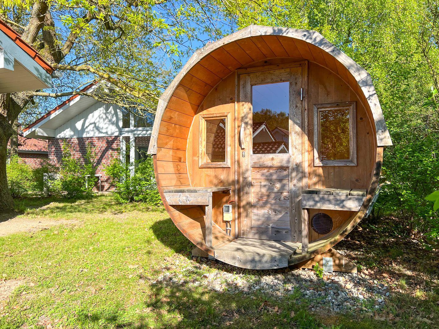 Ein Highlight des Ferienhauses ist die großzügige Terrasse, die zum Verweilen einlädt. Für Ihr privates Wellness-Erlebnis steht Ihnen eine eigene Fasssauna mit Blick in den Garten zur Verfügung – der perfekte Ort, um die Seele baumeln zu lassen.