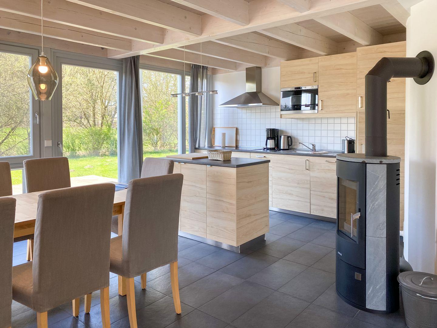 Im Erdgeschoss bildet der Wohn- und Essbereich mit Kamin und offener Küche das Zentrum des Ferienhauses. Im Obergeschoss befindet sich die Innensauna für Ihr privates SPA Erlebnis.