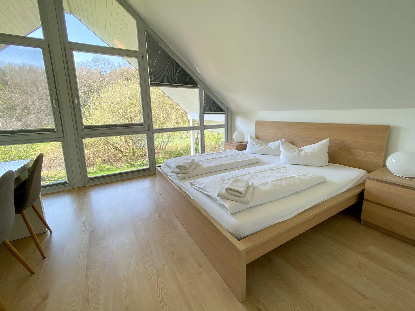 Im Obergeschoss befinden sich drei Schlafzimmer, die jeweils mit komfortablen Doppelbetten ausgestattet sind. Ein weiteres Highlight ist das Duschbad mit angrenzender Sauna, das zu einem privaten SPA-Erlebnis einlädt.