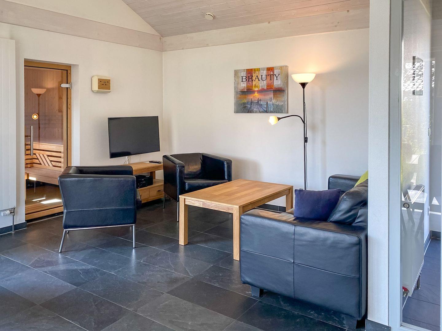 Der lichtdurchflutete Wohn- und Essbereich mit Kamin und offener Küche bildet das Herzstück des Hauses. Hier können Sie gemeinsam kochen, entspannen oder den Tag bei einem knisternden Feuer ausklingen lassen. Ein besonderes Highlight ist die Innensauna mit direktem Blick in den Garten, die Ihnen ein privates SPA-Erlebnis ermöglicht.