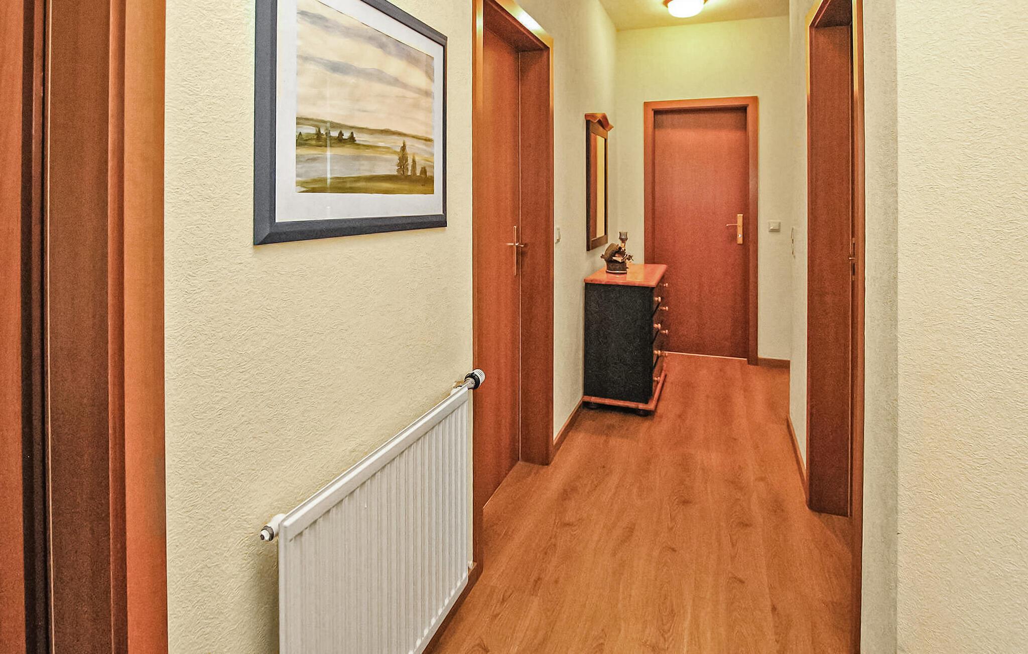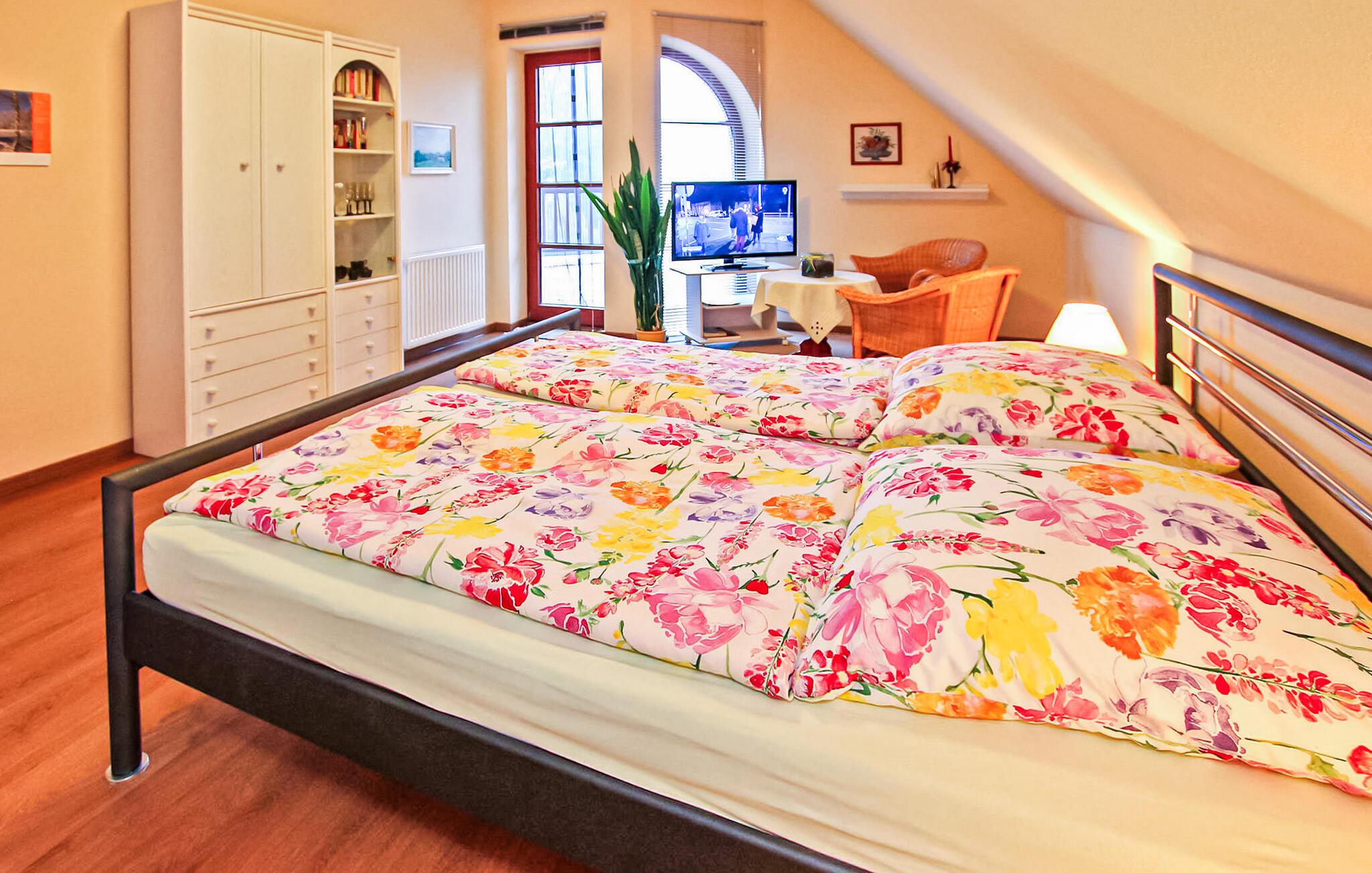Den cirka 58 kvadratmeter store, centralt opvarmede ikke-ryger lejlighed har en kombineret stue og soveværelse (siddegruppe, fladskærms-tv, radio/cd-afspiller, dobbeltseng), et soveværelse (en lille enkeltseng, længde 1,90 m, skrivebord ) et køkken (elektriske kogeplader, køleskab med fryser, mikroovn, spisebord, diverse små køkkenmaskiner), en gang og et rummeligt badeværelse (bruser, toilet, to håndvaske, hjørnebadekar, hårtørrer) samt en stor, møbleret altan. (Adgang fra stue og køkken, rygning tilladt her). Trappen til lejligheden fører via ejerens indgangsparti. Gæsterne har adgang til gratis Wi-Fi, cykelopbevaring (også et aflåseligt rum efter anmodning), parkeringsplads, en børneseng og en høj stol.