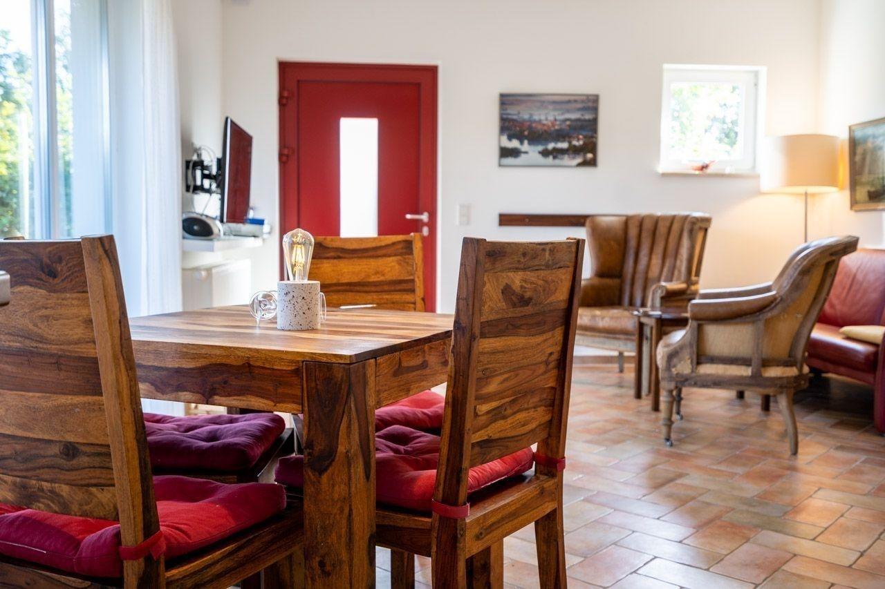 Die Ferienwohnung bietet einen einladenden Außenbereich mit einer privaten Terrasse. Hier kann man entspannte Stunden im Freien verbringen, die frische Luft genießen und den Alltag hinter sich lassen. Ideal für Morgenkaffees oder gemütliche Abende unter dem Sternenhimmel, schafft dieser Raum eine angenehme Atmosphäre für erholsame Urlaubstage. Ein perfekter Rückzugsort für jeden Gast.