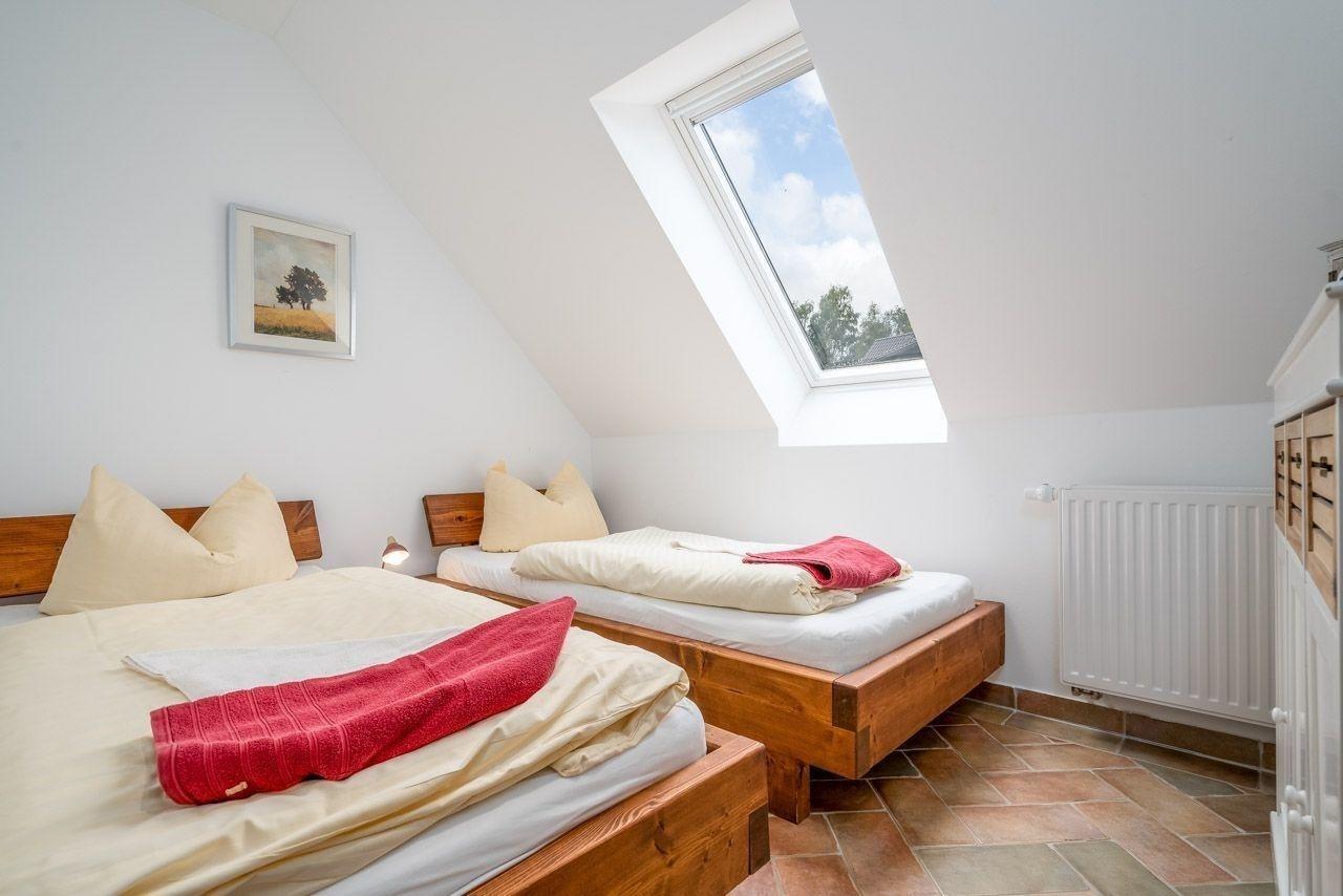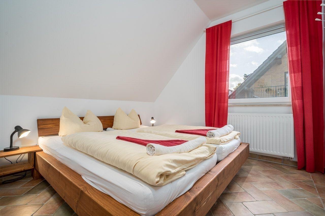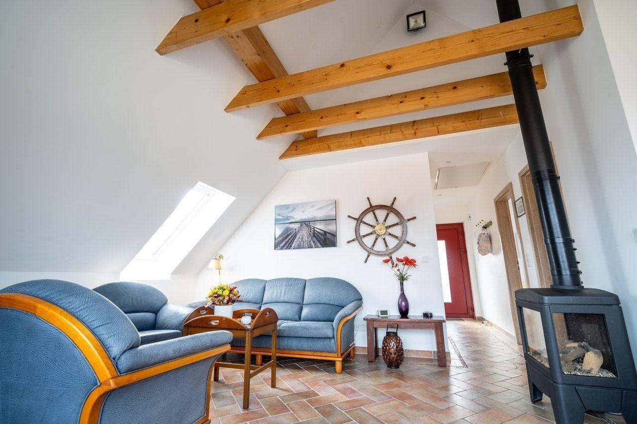 Die Ferienwohnung bietet ein modernes und komfortables Ambiente, ideal für einen erholsamen Aufenthalt. Sie verfügt über zwei Schlafzimmer, eines mit einem Doppelbett und das andere mit drei Einzelbetten, sowie ein helles Badezimmer mit Fenster und bodengleicher Dusche. Der offene Wohnbereich lädt zum Entspannen ein, ausgestattet mit einem Sofa, einem Sessel und einem Esstisch.