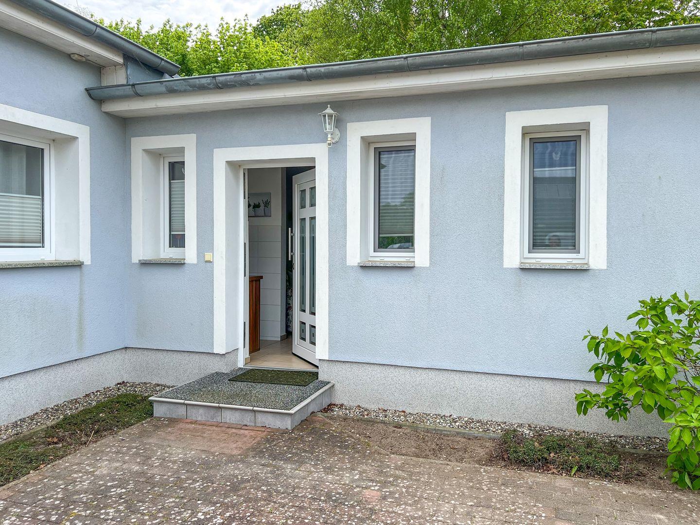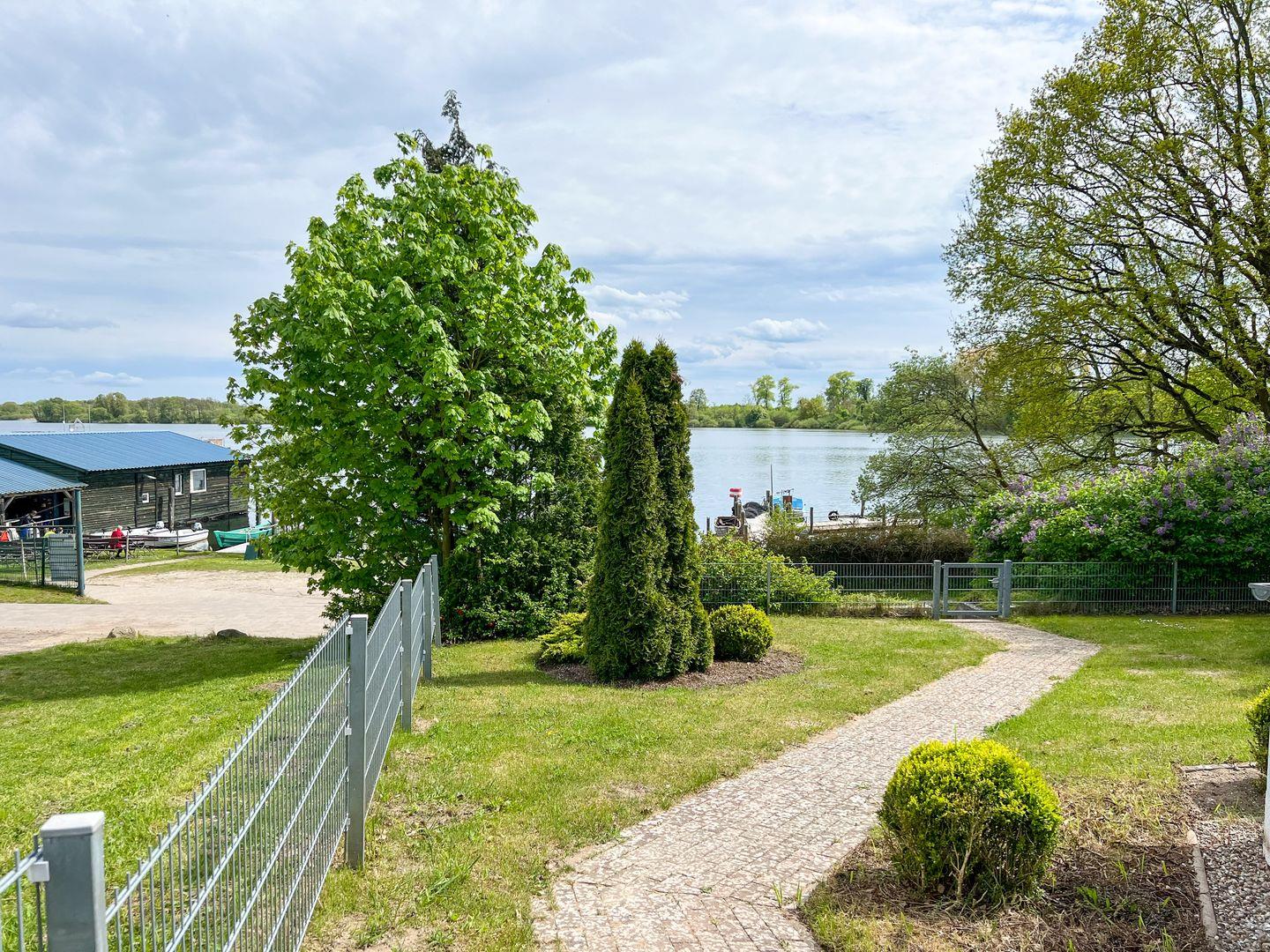 An den Wohnbereich schließt sich eine geschützte Terrasse an, die durch ihre Lage einen privaten Rückzugsort bietet. Genießen Sie den teilweisen Blick auf die Müritz, der durch die umliegenden Bäume hindurch scheint.