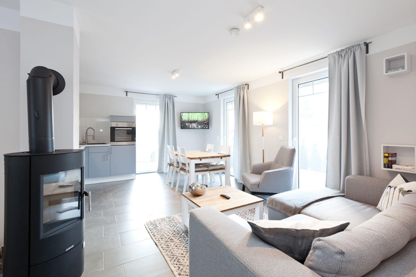 Unsere Ferienwohnung soll Ihnen ein zweites zu Hause bieten. Erholen Sie sich bei uns an der Müritz. Die Wohnung liegt im Erdgeschoss. Und ist ausgestattet mit 2 Schlafzimmern, einer Koch- und Wohnlandschaft, einem Kamin, einer Terrasse und einer Fasssauna. Unsere Doppelboxspringbetten bieten eine angenehme Nachtruhe. Die Fenster besitzen Aussenrollos und Fliegengitter. Auf der Terrasse befindet sich ein fester Grill mit dazugehörigen Gartenmöbel. Gerne stellen wir Ihnen zusätzlich ein Kinderreisebett und ein Hochstuhl zur Verfügung, auf Anfrage.