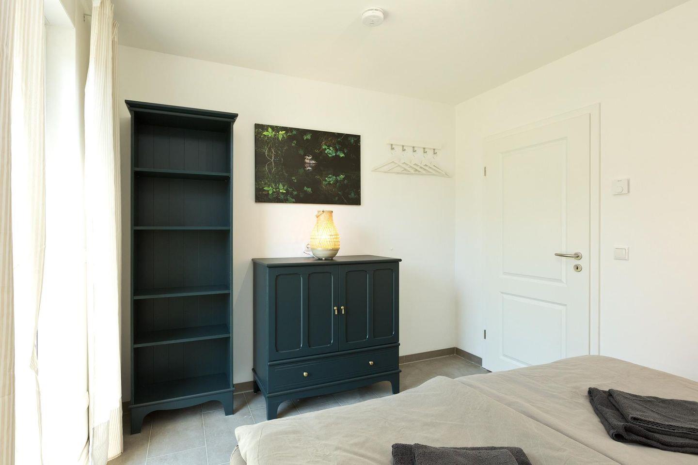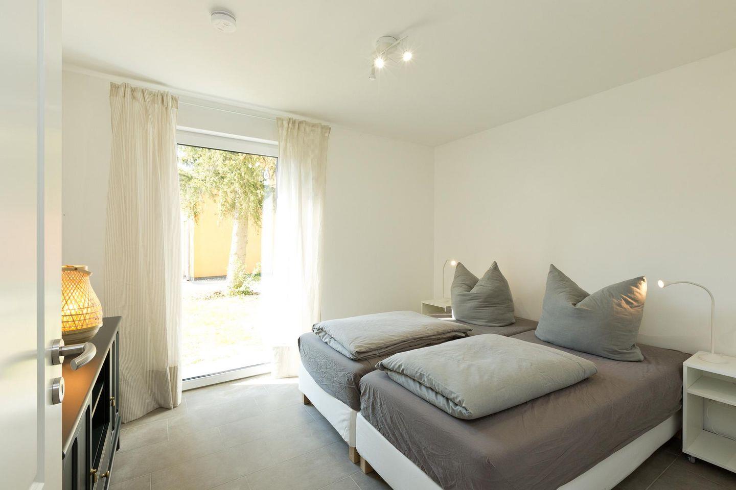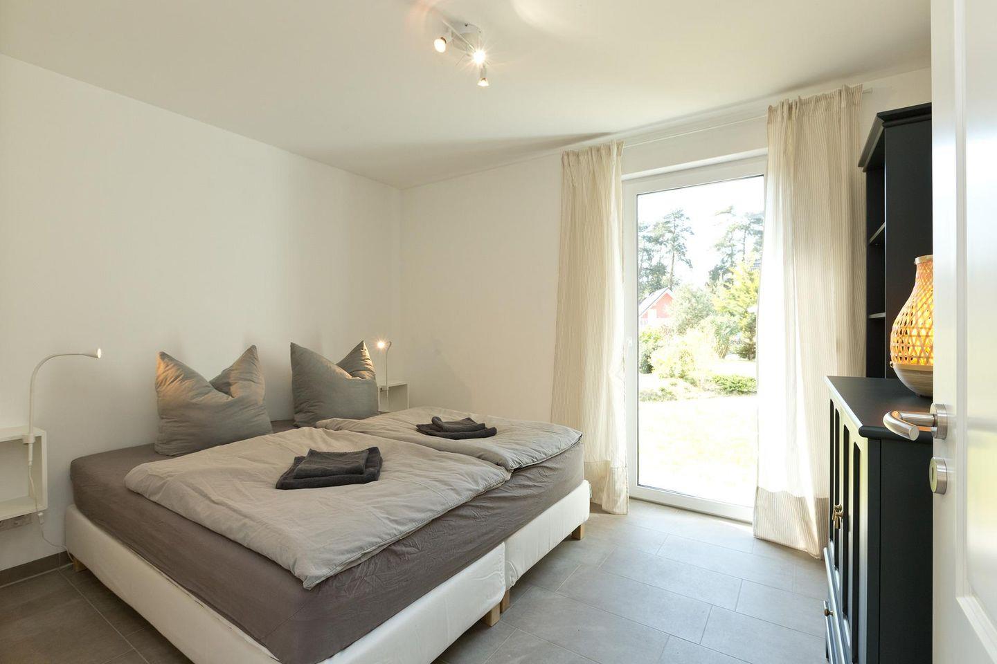 Die Ferienwohnung ist barrierefrei, geräumig und modern gestaltet. Mit großen bodentiefen Fenstern, die viel natürliches Licht hereinlassen. Die Wohnung befindet sich im Erdgeschoss und verfügt über ein großzügigen Wohnbereich, einer voll ausgestatteten Küche, einem Bad mit ebenerdiger Dusche, einem Schlafzimmer mit einem Doppelbett und einem weiteren Schlafzimmer mit zwei Einzelbetten. In dieser Ferienwohnung gibt es ausreichend Platz für bis zu 5 Personen.