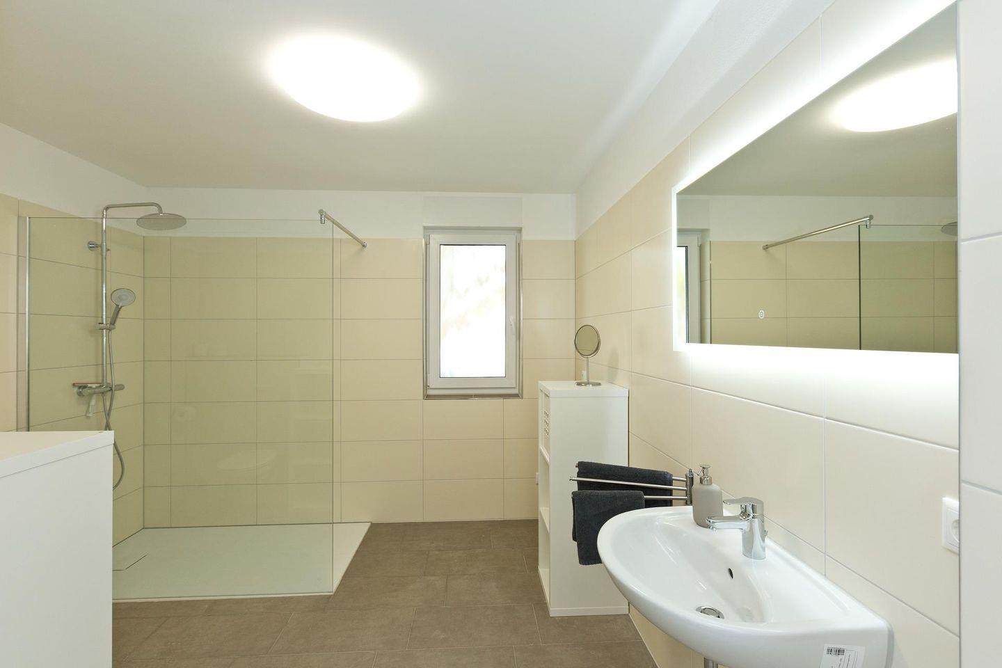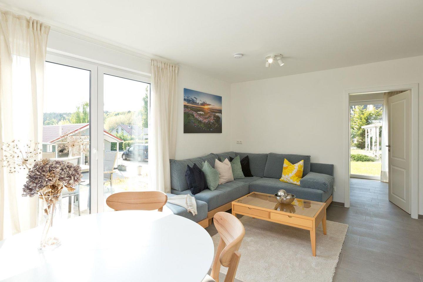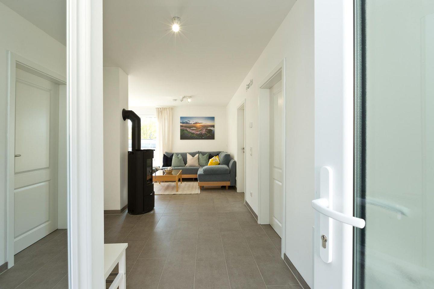 Die Ferienwohnung ist barrierefrei, geräumig und modern gestaltet. Mit großen bodentiefen Fenstern, die viel natürliches Licht hereinlassen. Die Wohnung befindet sich im Erdgeschoss und verfügt über ein großzügigen Wohnbereich, einer voll ausgestatteten Küche, einem Bad mit ebenerdiger Dusche, einem Schlafzimmer mit einem Doppelbett und einem weiteren Schlafzimmer mit zwei Einzelbetten. In dieser Ferienwohnung gibt es ausreichend Platz für bis zu 5 Personen.