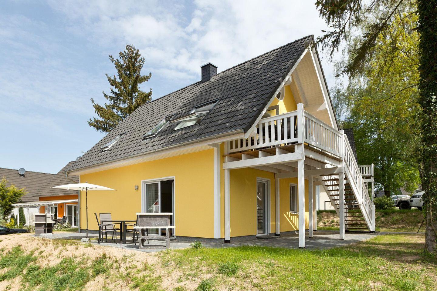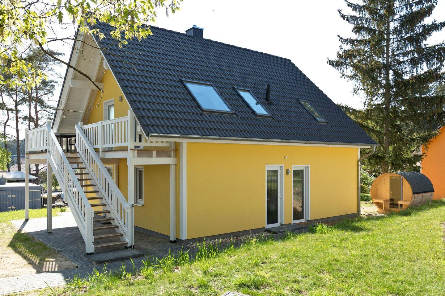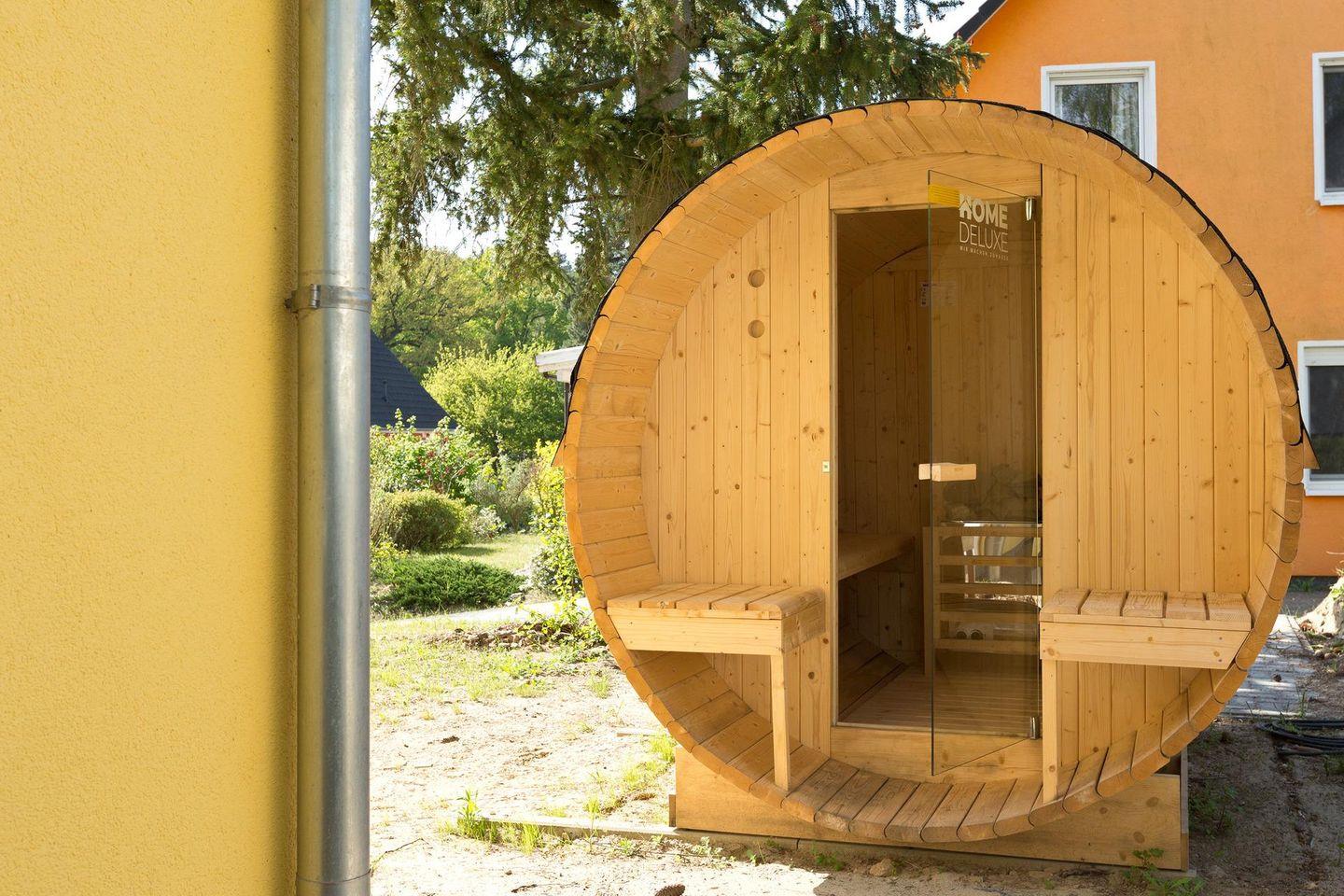 Im Außenbereich befindet sich eine Fasssauna und eine große Terrasse mit dazugehörigen Möbeln und einem Steingrill.