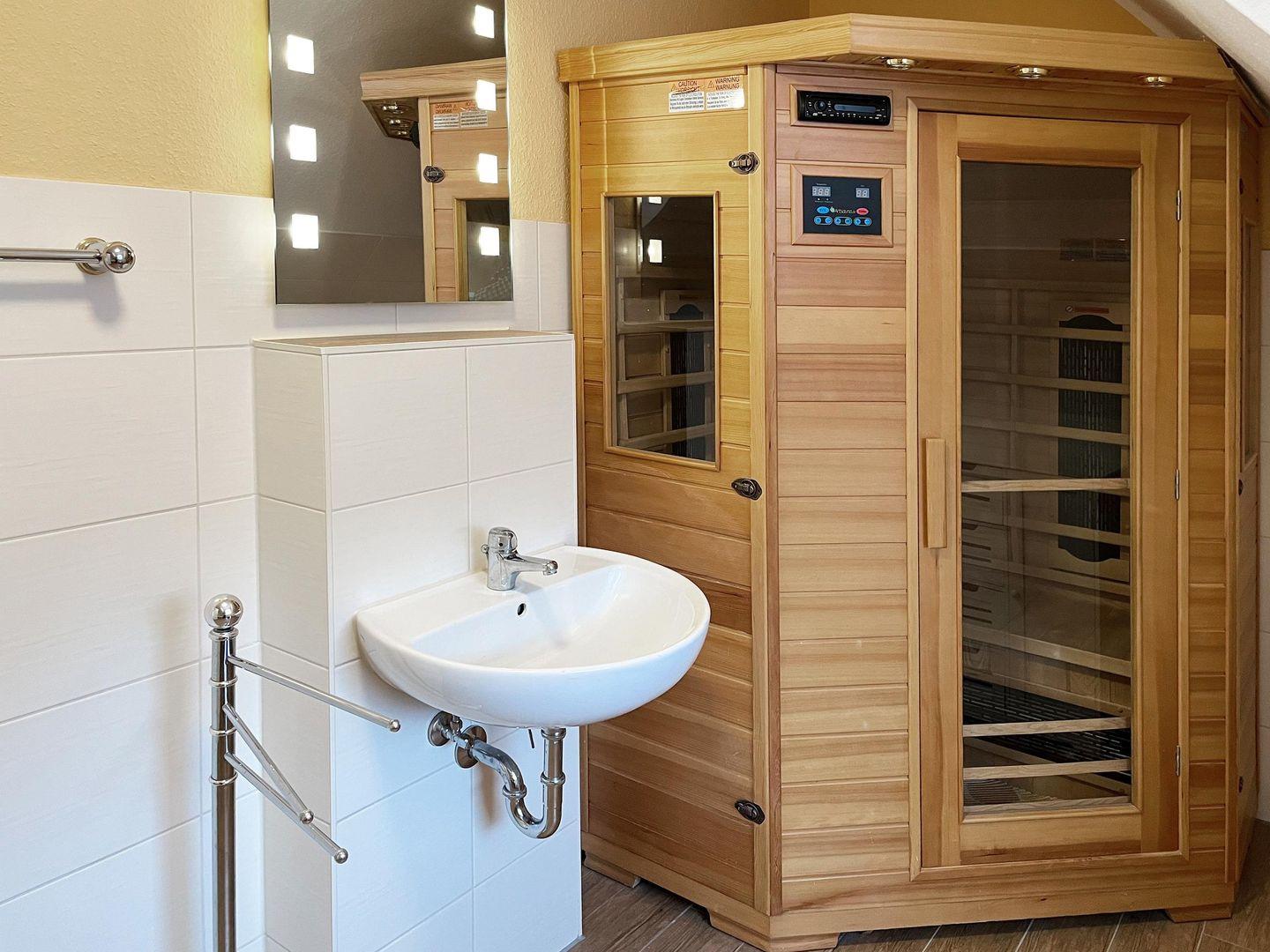 Das liebevoll eingerichtete Apartment befindet sich im Obergeschoss und bietet Platz für bis zu vier Erwachsene. Ausgestattet mit einem Kamin im Wohnbereich und einer Küche in dem Sie alles vorfinden um sich köstliche Mahlzeiten zubereiten. Die beiden Schlafzimmer verfügen jeweils über ein großes Doppelbett. Das Bad ist ausgestattet mit Badewanne und Infrarotkabine .Zusätzlich bieten wir zur Terrasse noch einen Balkon mit passenden Sitzmöbel auf der Sie erlebnisreiche Tage ausklingen lassen können. Neben dem Wohnzimmer sind auch beide Schlafzimmer mit LCD-Flachbildschirmen ausgestattet.